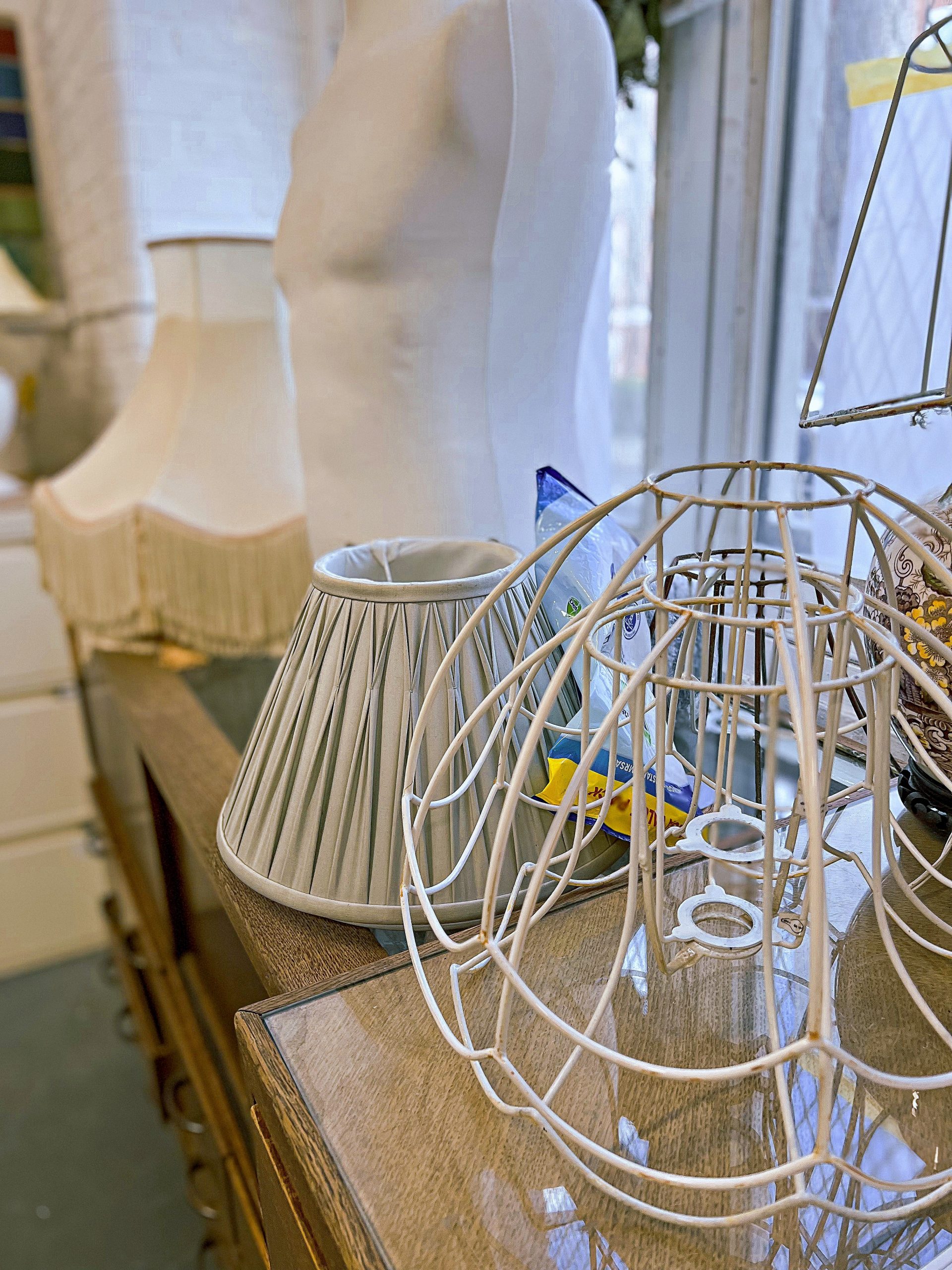 While it’s worth searching for second-hand lamp stands, be wary of buying a vintage lampshade frame as the metal can stain your fabric with rust. It’s easier and cleaner to buy a new one from someone like Dannells.com, although I managed to make a ‘balloon’ style lampshade from an antique shade (below).