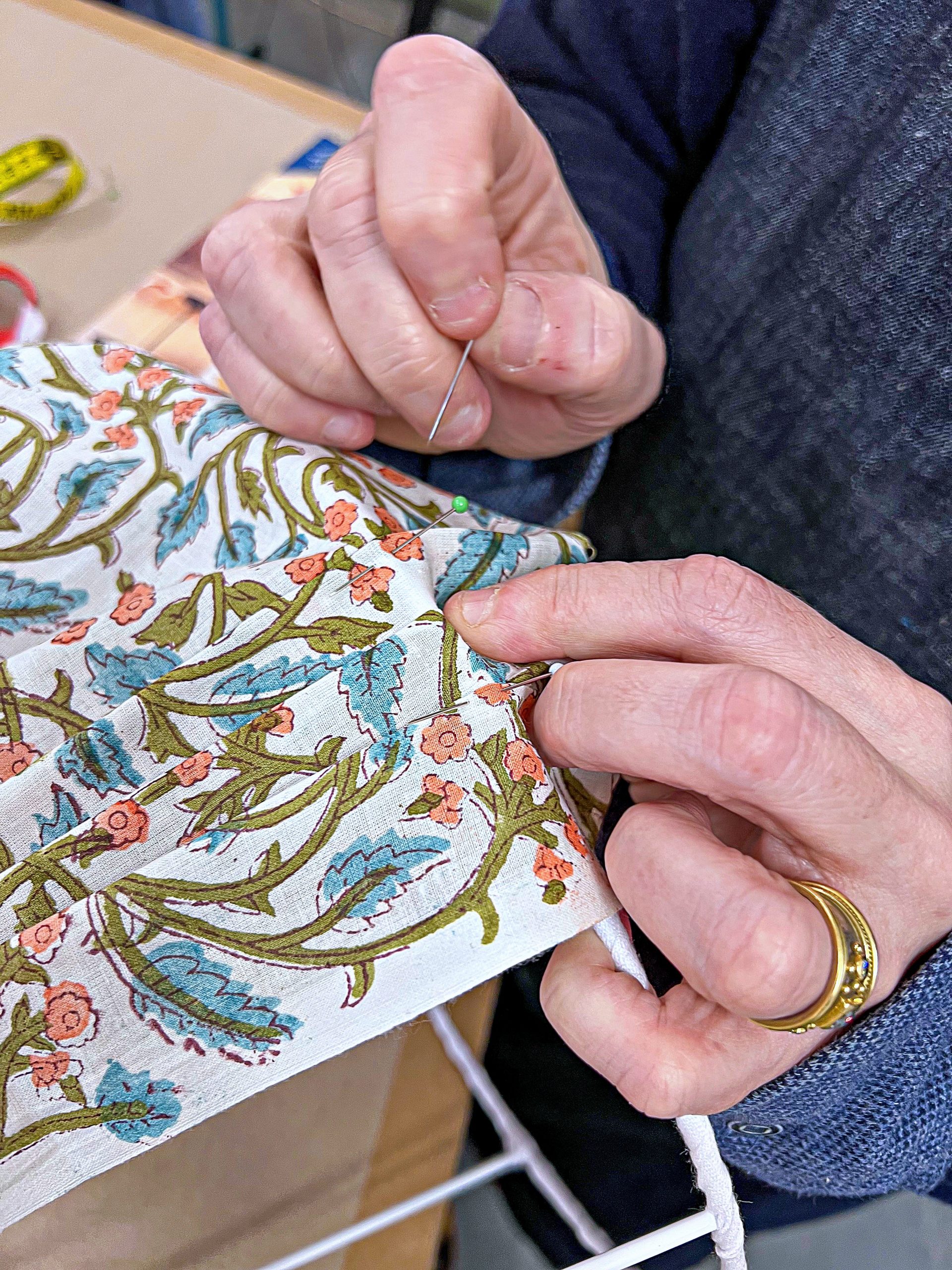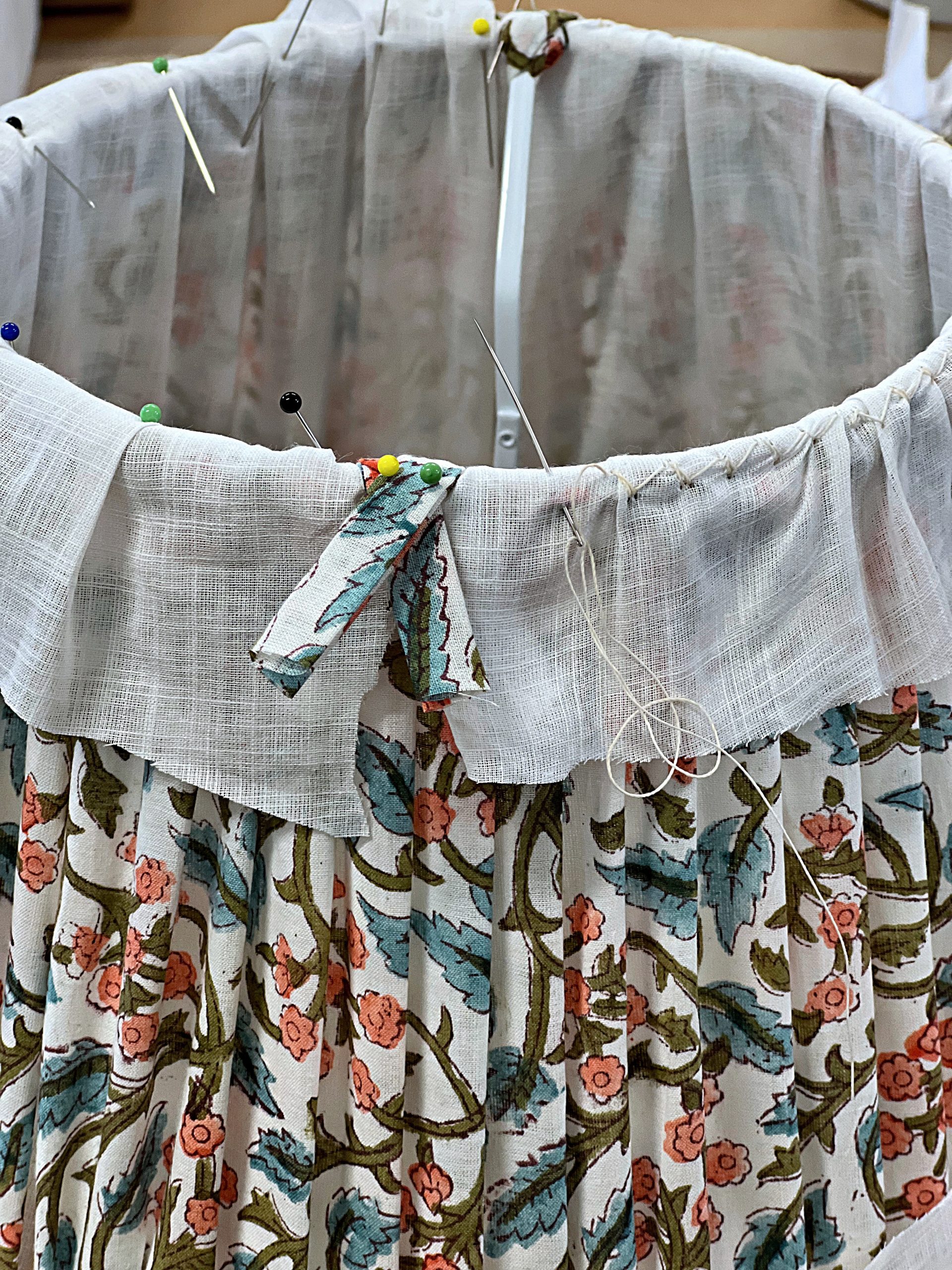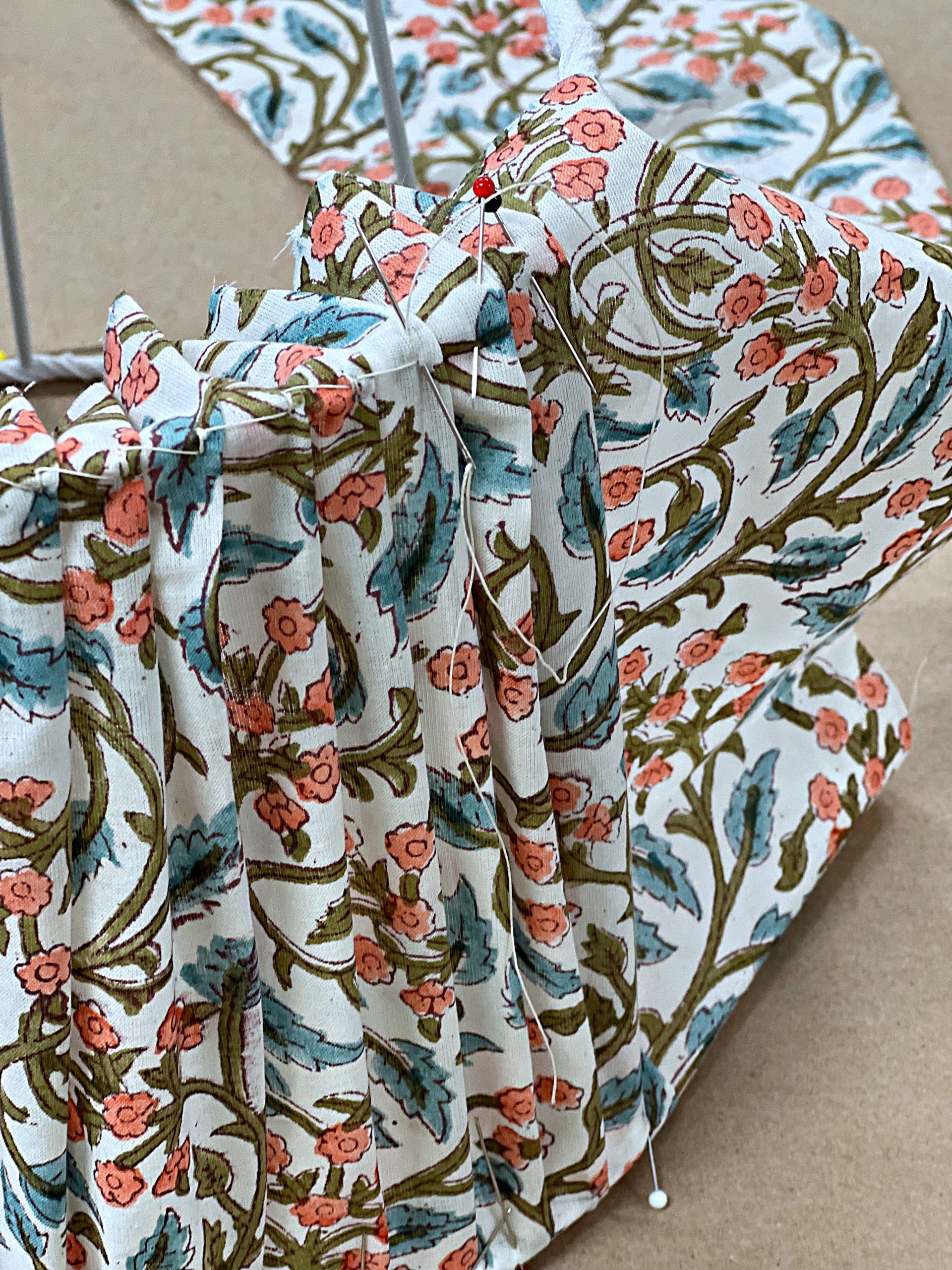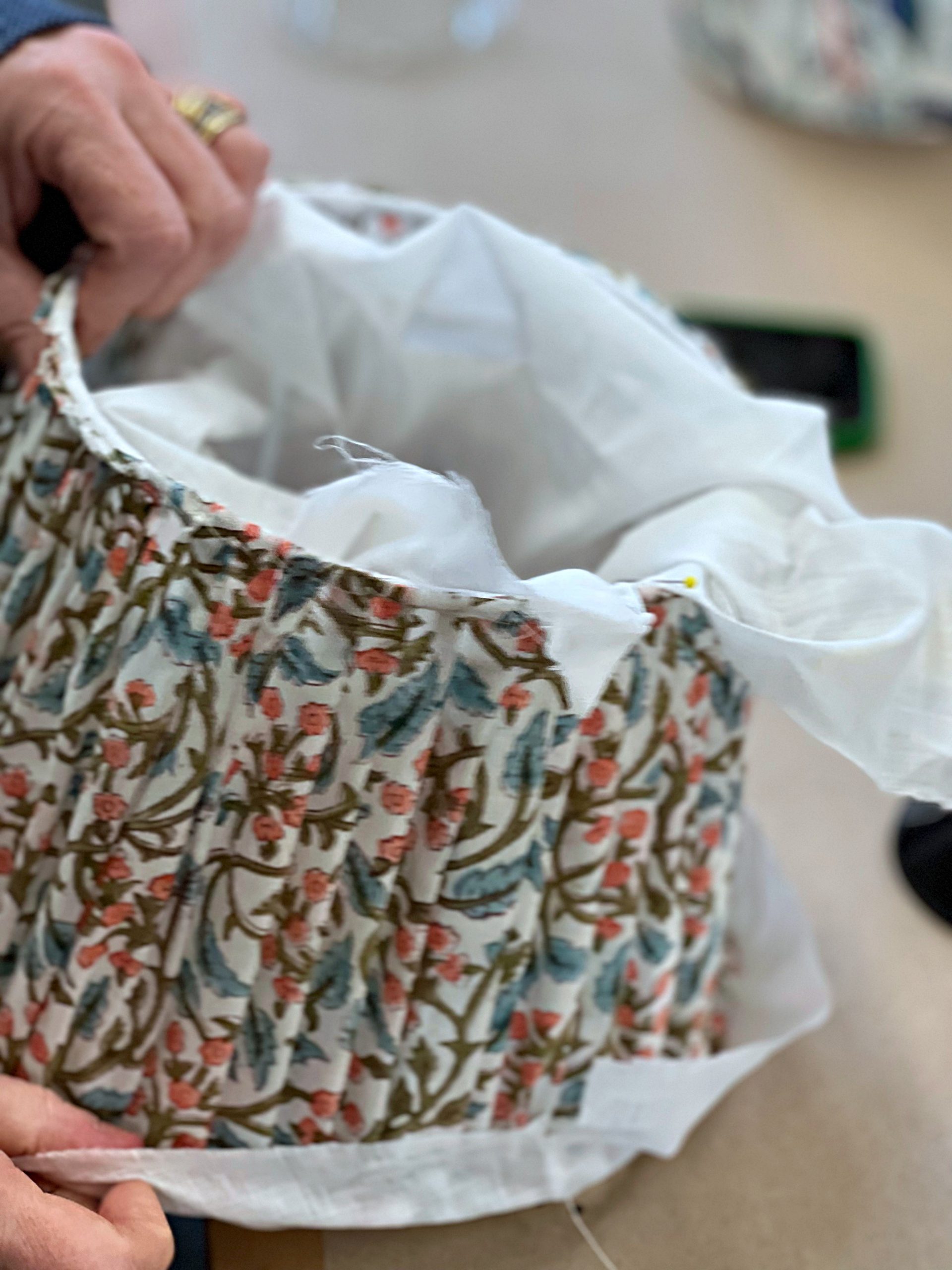 We were asked to bring one and a half metres of light-weight lawn cotton (which is Liberty style fabric originally named after the French town of Laon). I brought a block-printed floral Indian cotton from The Cloth Shop in Portobello road. You are also asked to bring half a metre of lightweight plain cotton for the lining.