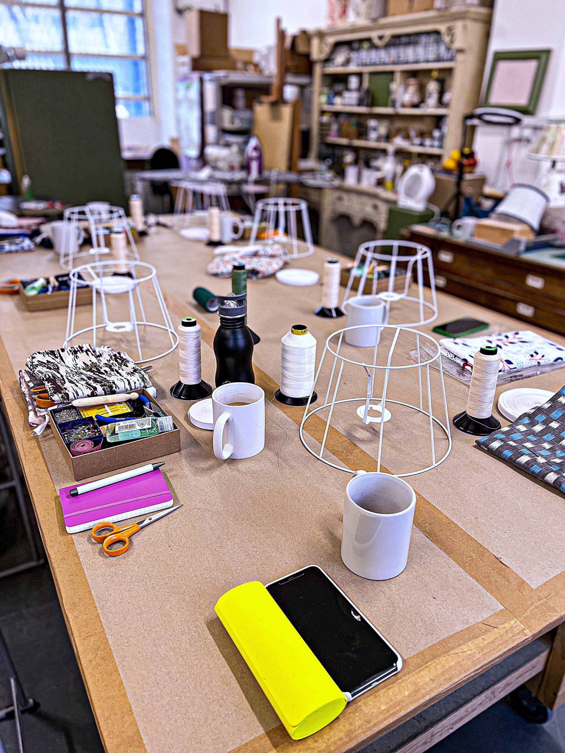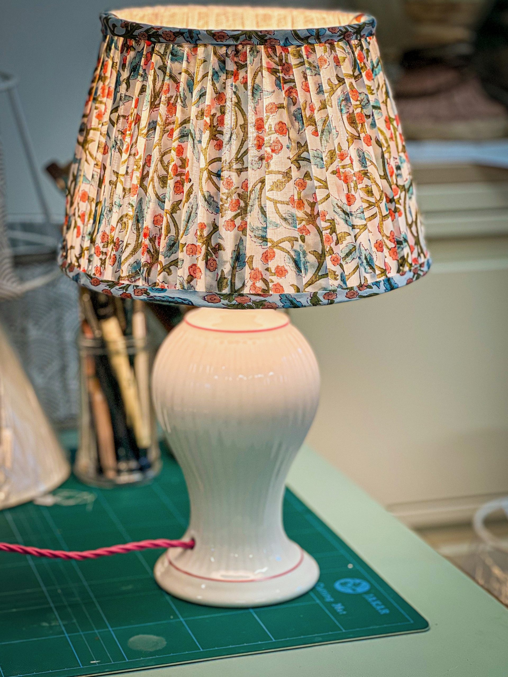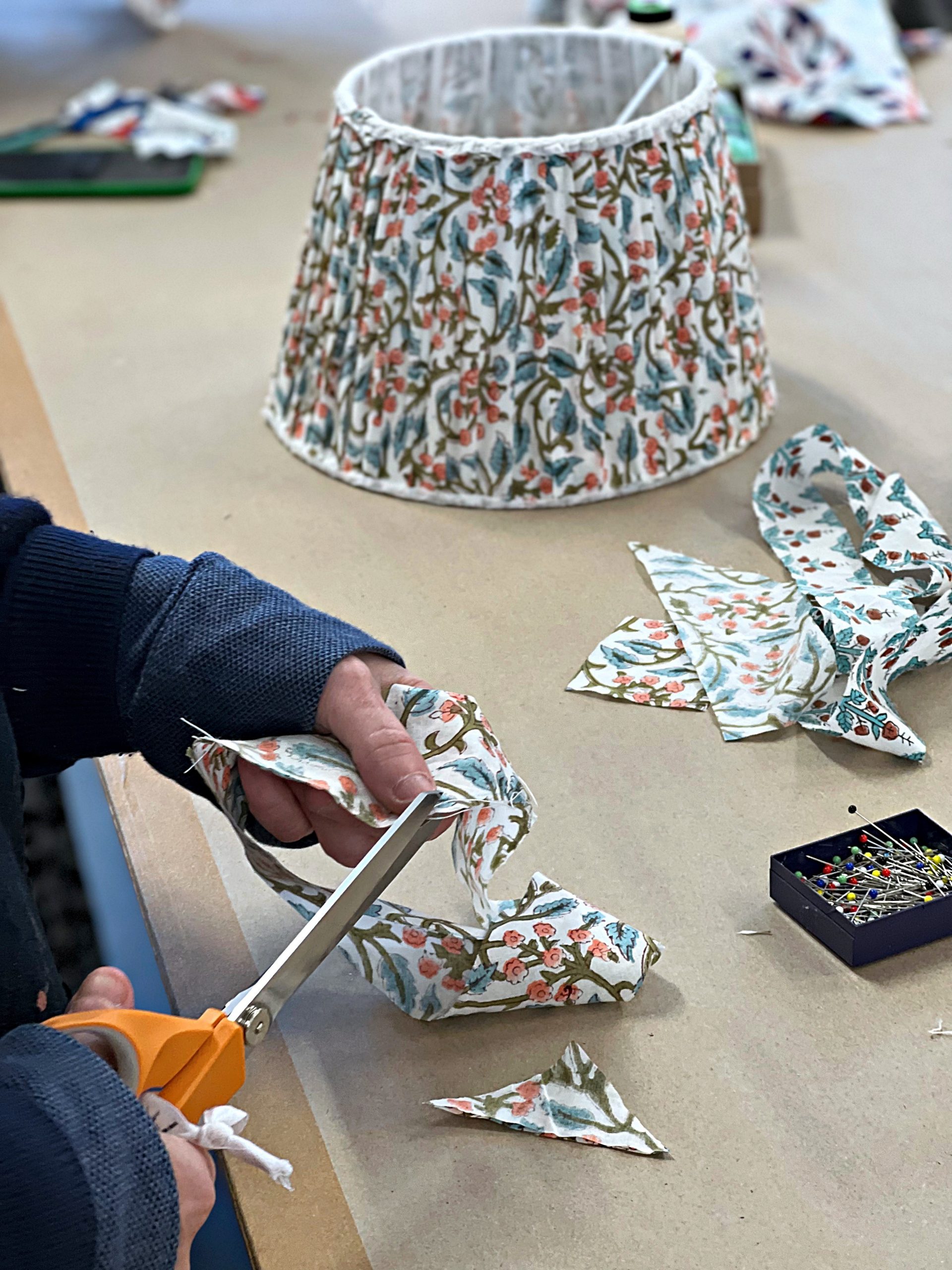 A two day course for pleated lampshades costs £360 per person including all your materials except your chosen fabric. There are different courses: pleated, gathered, scalloped and the traditional ‘balloon’ lampshade where the fabric is stretched over the frame. Lottie provides coffee, tea, croissants, fruit and chocolate biscuits. You are also asked to bring your own packed lunch or get a sandwich from one of the local Kentish Town bakeries or cafes.