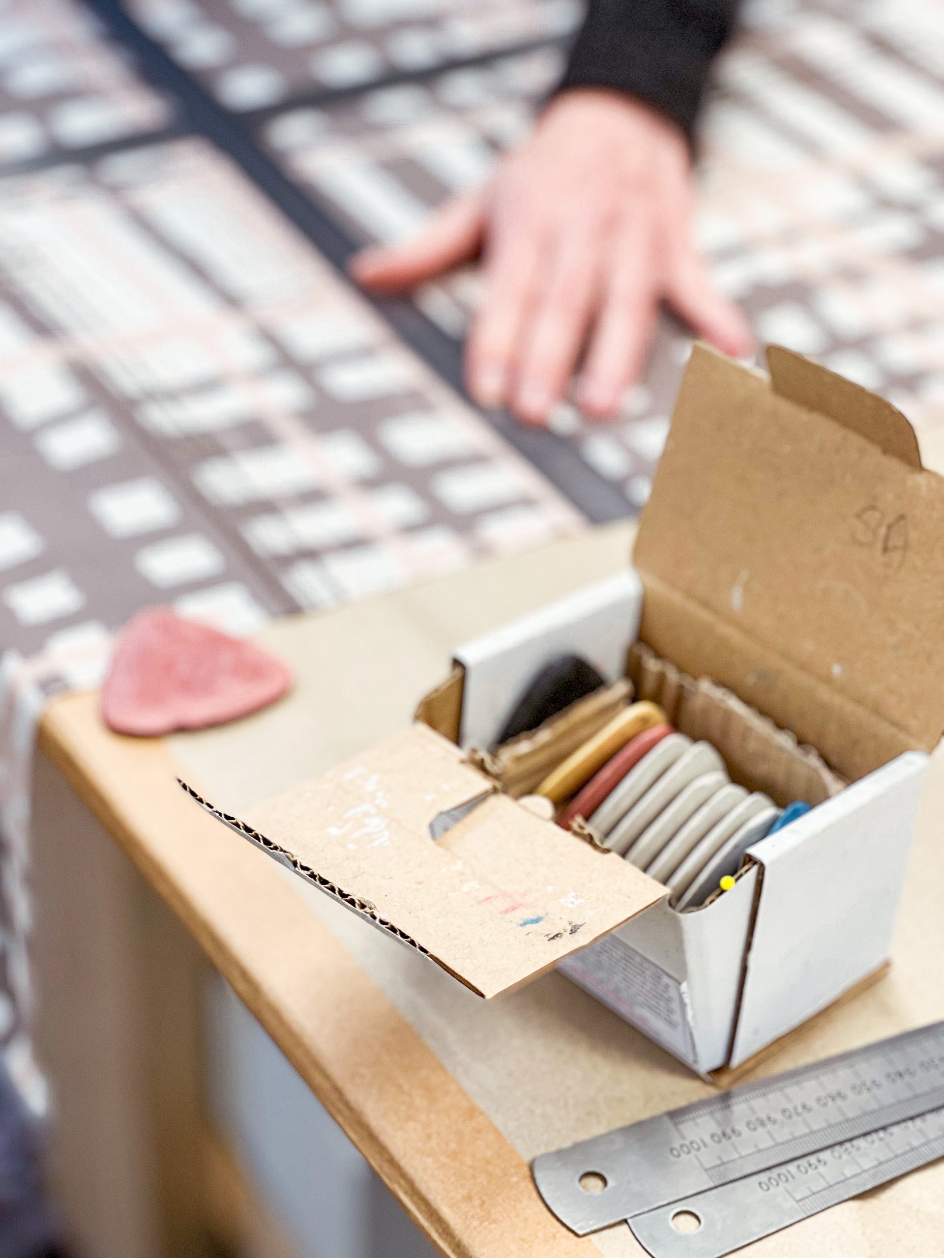 Lighting is something worth spending some money and time on, and I’ve seen patterned and pleated lampshades on sites like Pooky.  Most of the shades sold commercially are glued together. We, on the other hand, are hand-sewing these shades, learning the ‘lampshade stitch’; two small stitches followed by a long sideways stitch. They aren’t cheap and now I know why. I spent last weekend learning how to make one at the Minerva workshop in Kentish Town. It takes two days just to make one small lampshade.