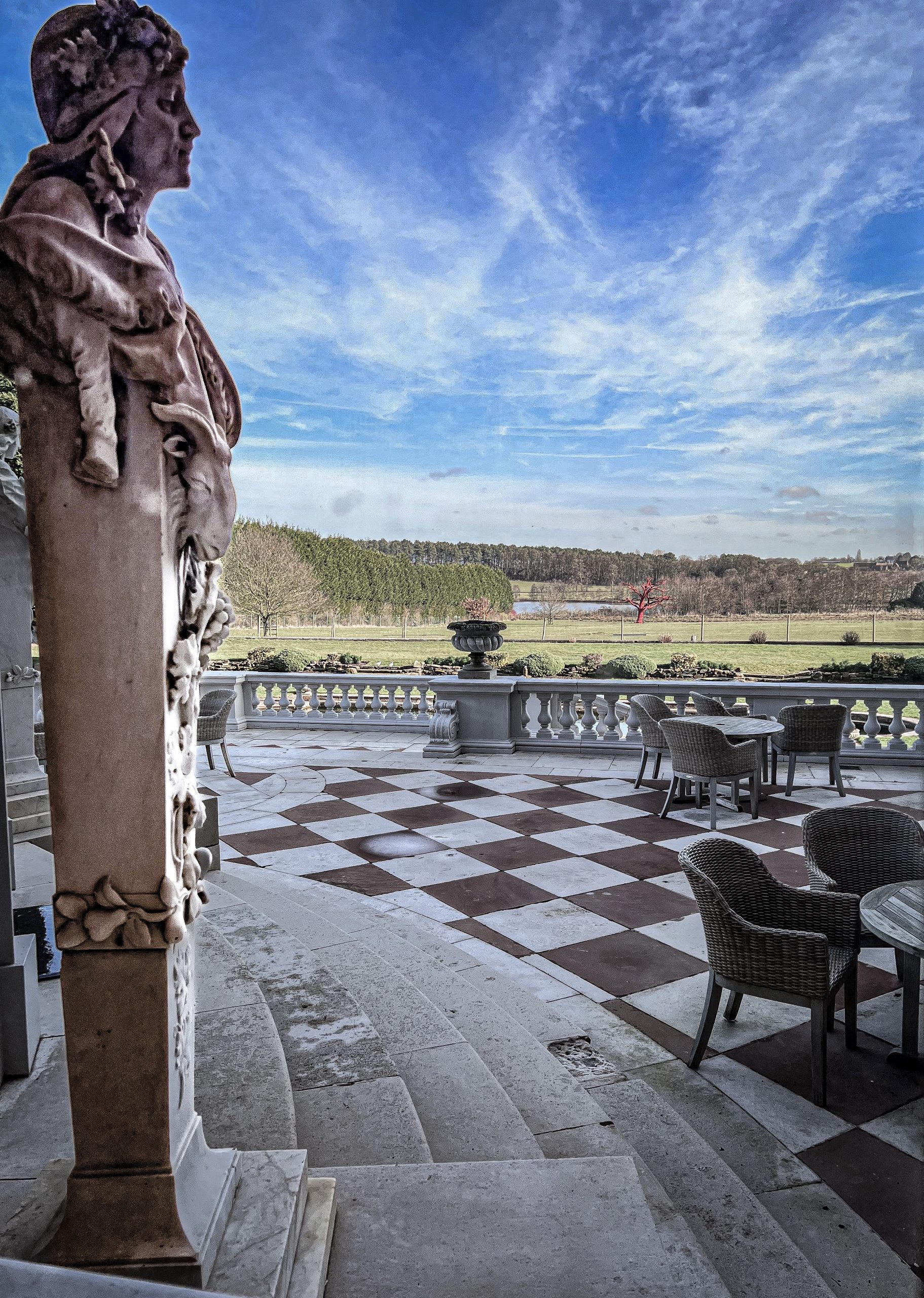 The next day we sit in the huge elegant ballroom for breakfast and wander around the gardens where there is a huge oak tree painted red. This is an interesting and diverting weekend away from London which will take place all of March and again in November.