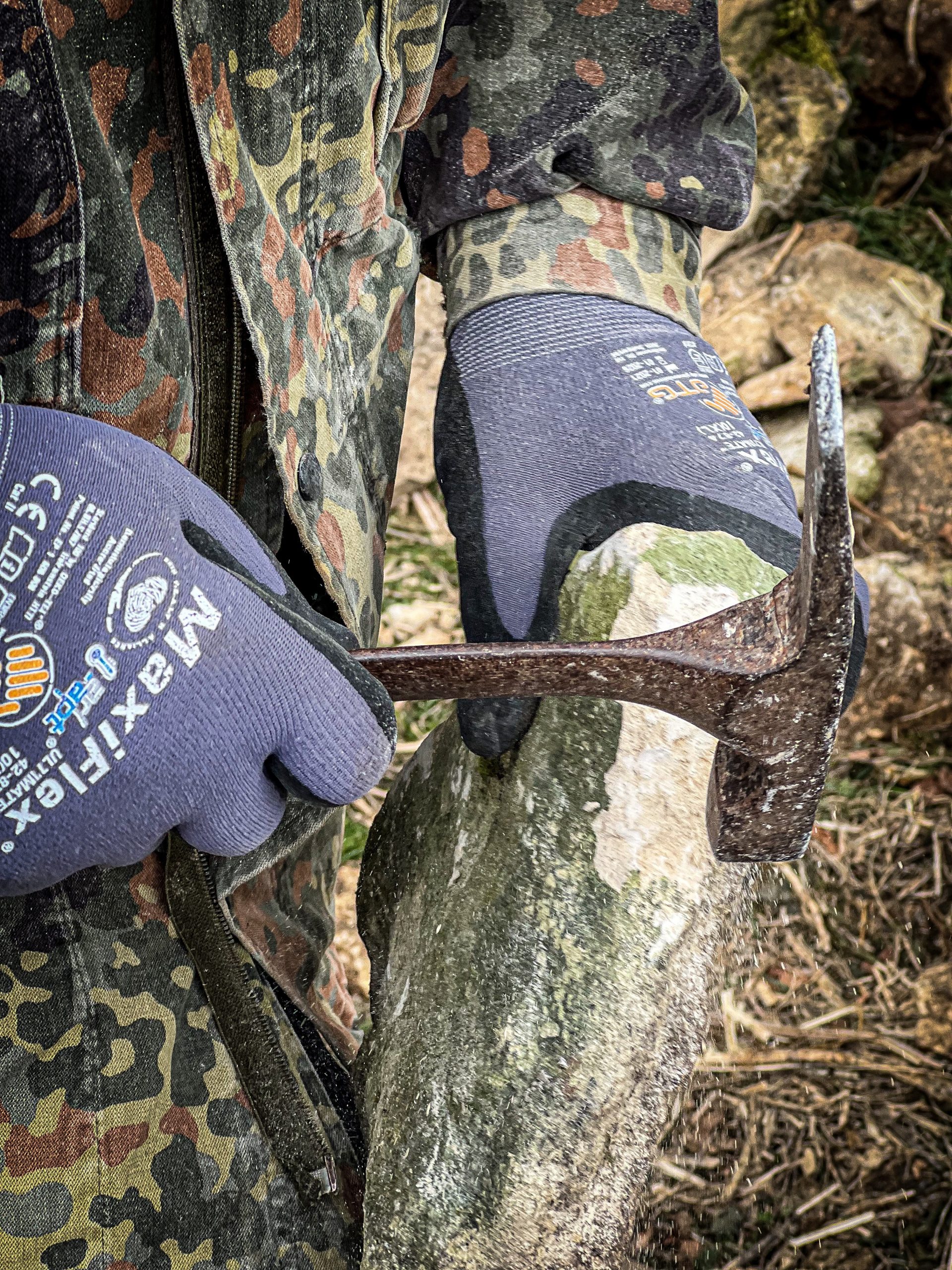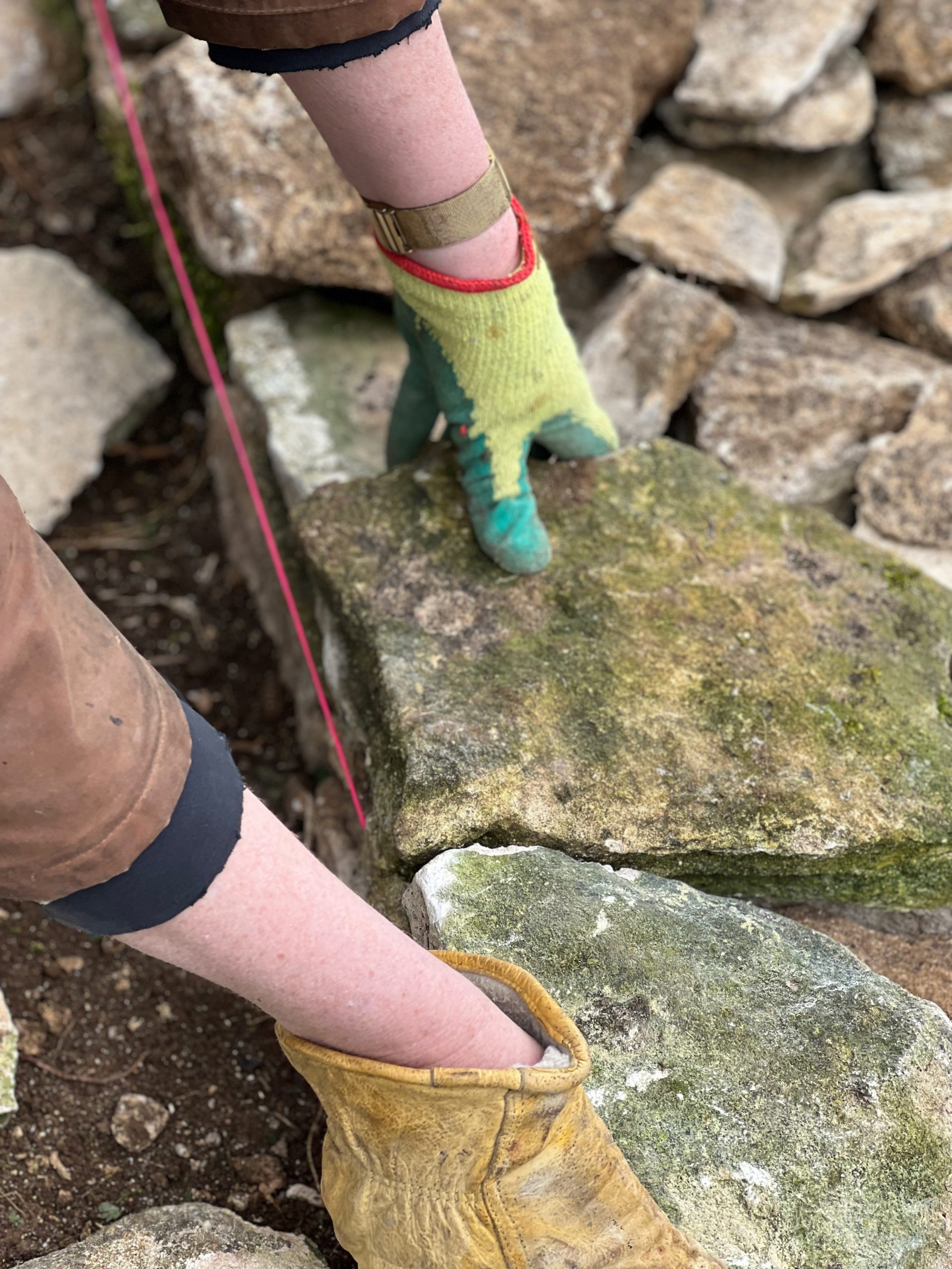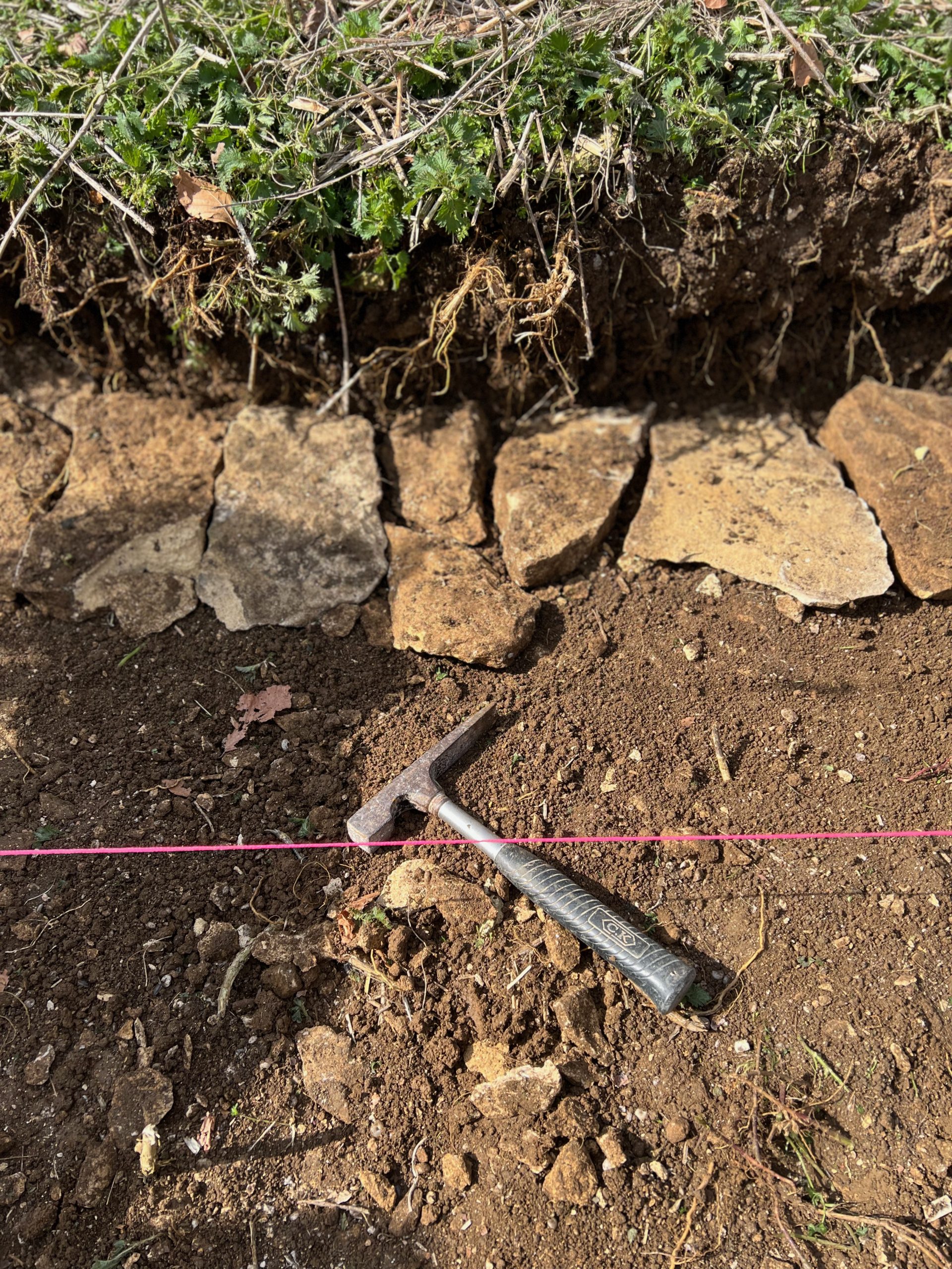 Miraculously a wall was beginning to form, layer by layer. Just the act of sorting out flat stones and laying them (tilting slightly forwards, with pinning stones wedged in at the back)created a strong wall. If the stone had a bump which prevented it from fitting in with the puzzle, you’d use a hammer to tap gently along the grain of the stone to smooth it out.