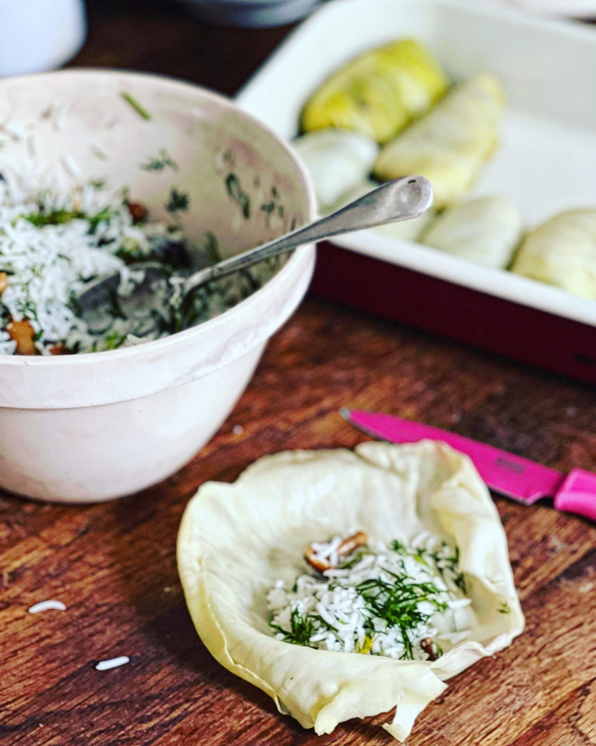 - Place a tablespoon of the rice mixture in the centre of the cabbage leaf. Roll over once, then tuck in the sides, continue to roll. Place seam side down in the baking dish.
