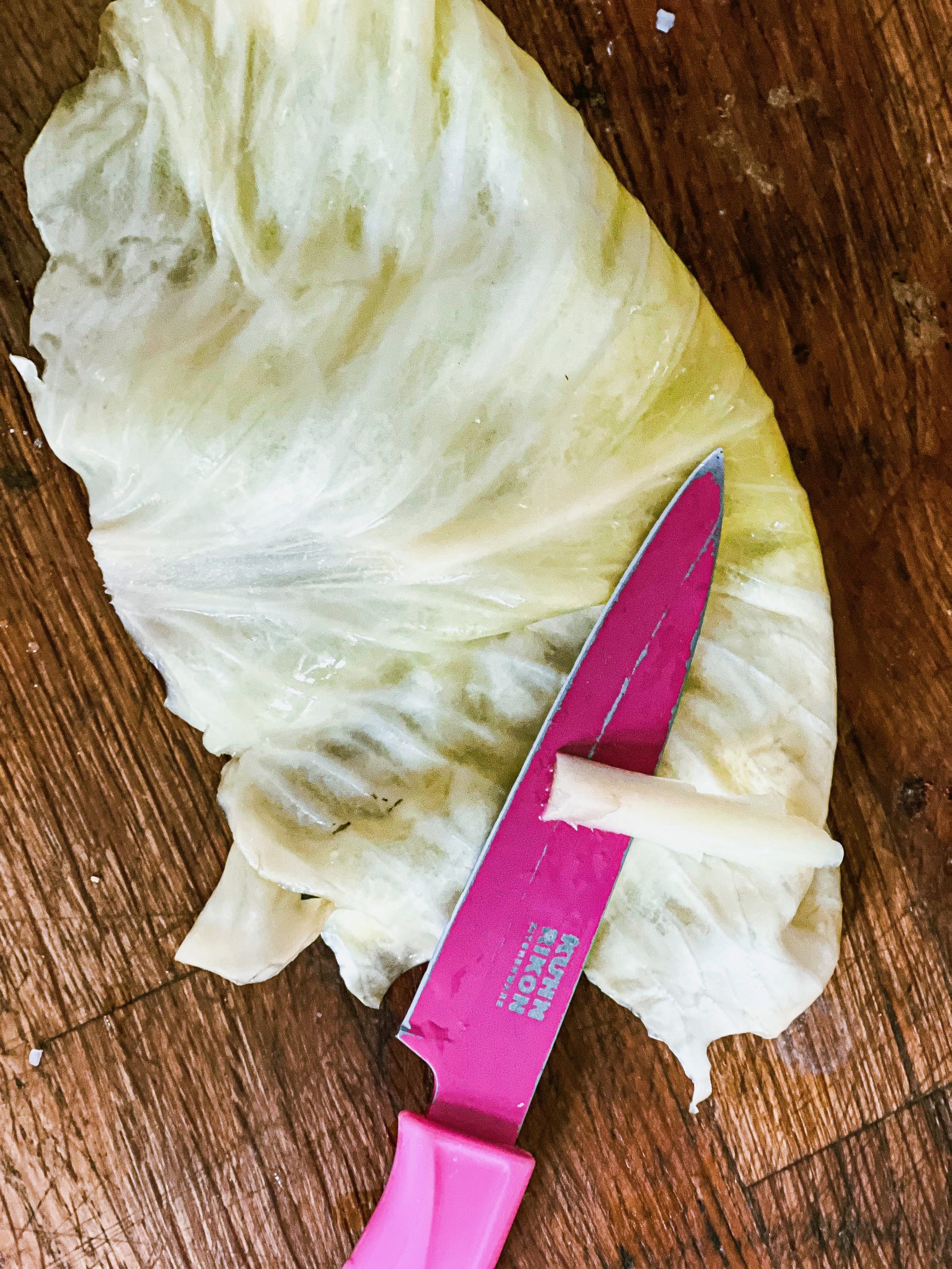 - Slice off the thickest part of the cabbage leaf spine so the leaf is finer and easier to roll.
