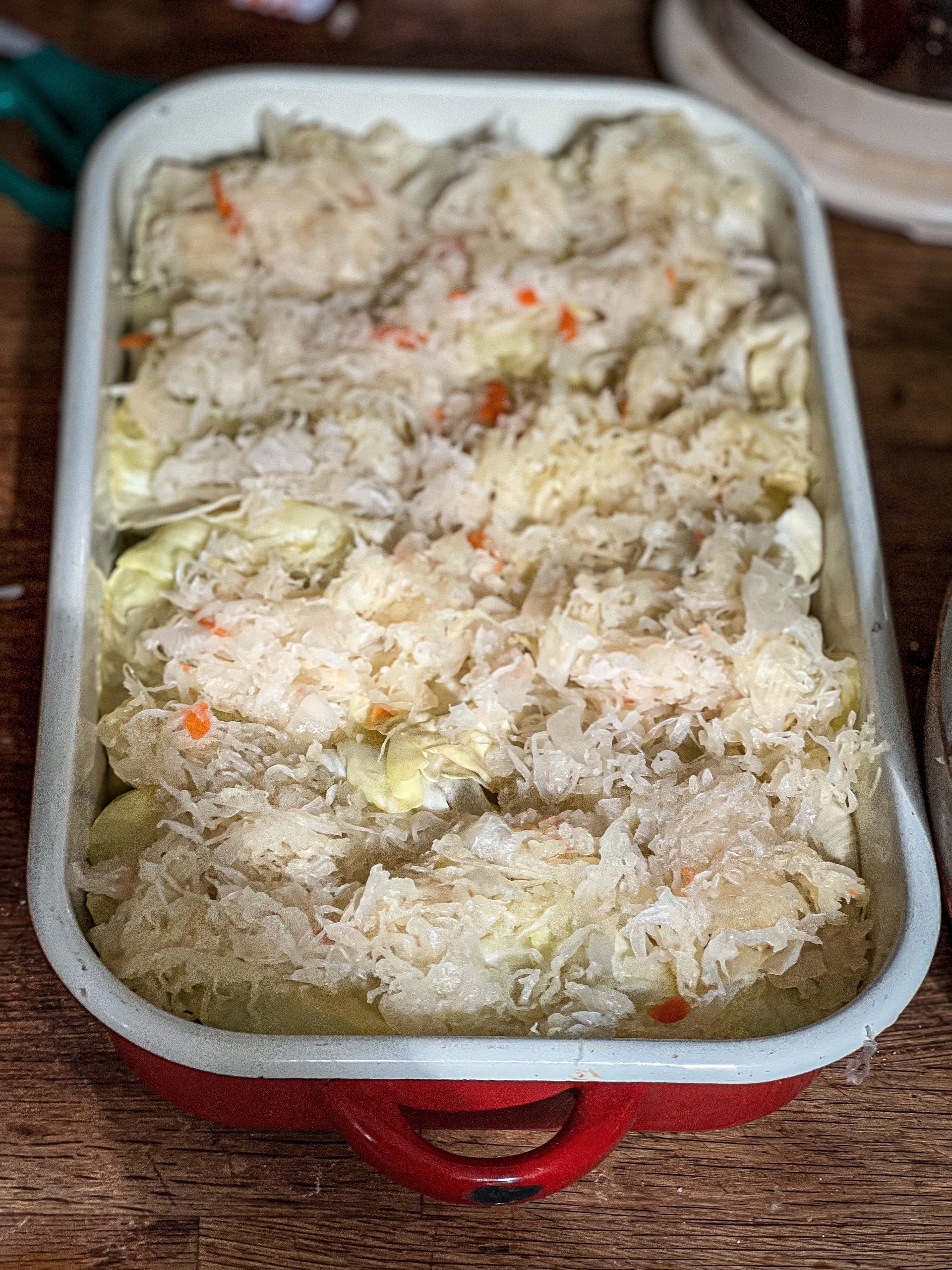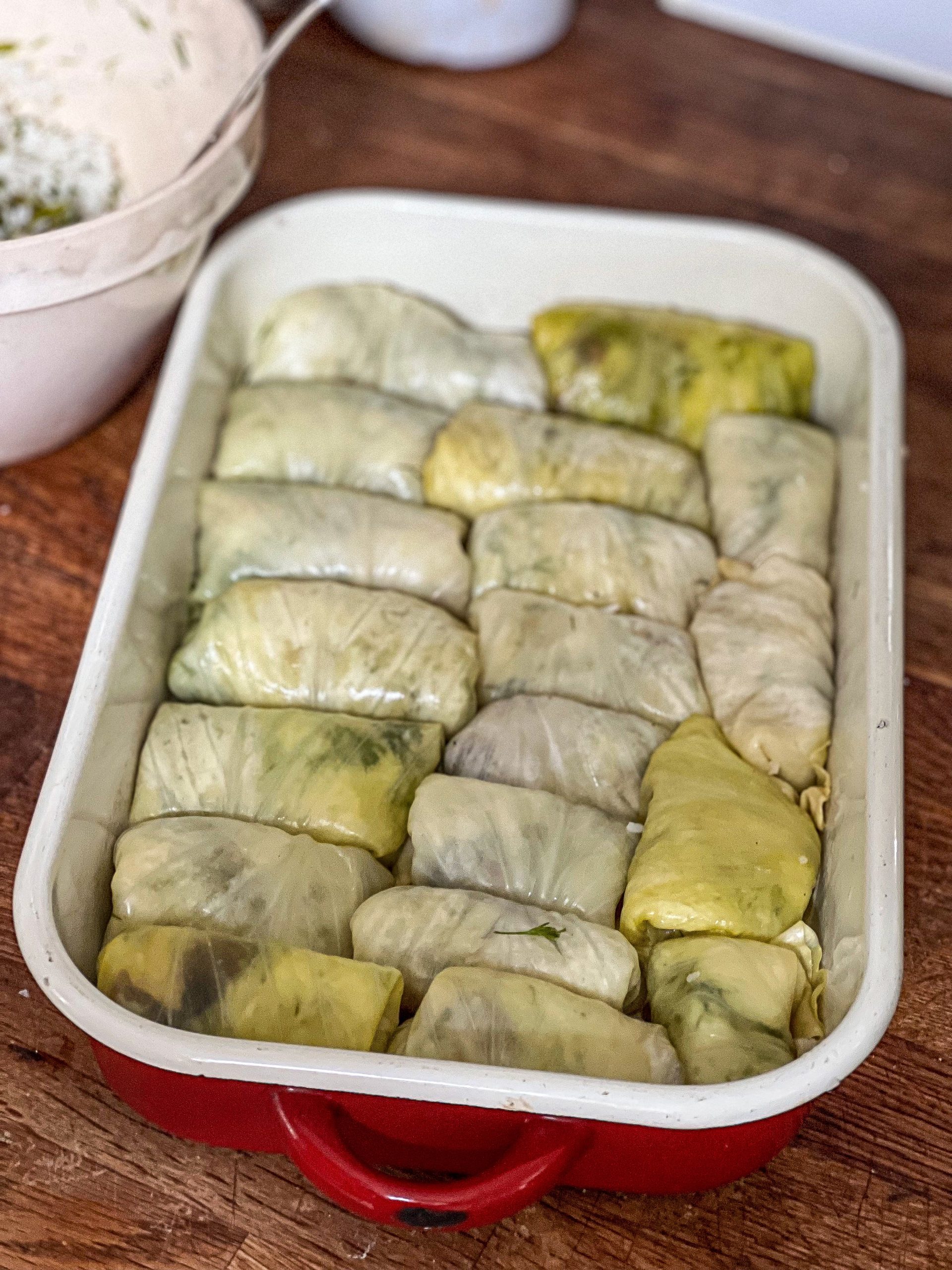 - Continue to do this until all the space in the dish is taken or the cabbage leaves used up.