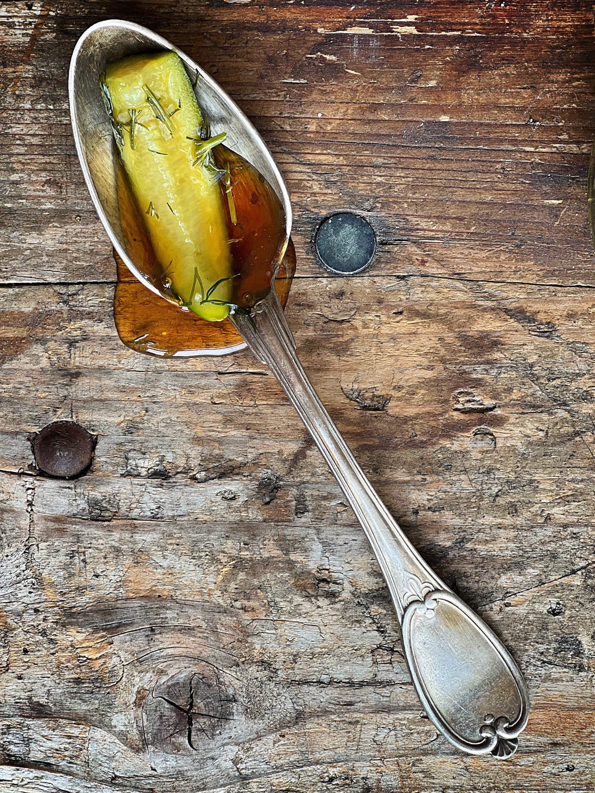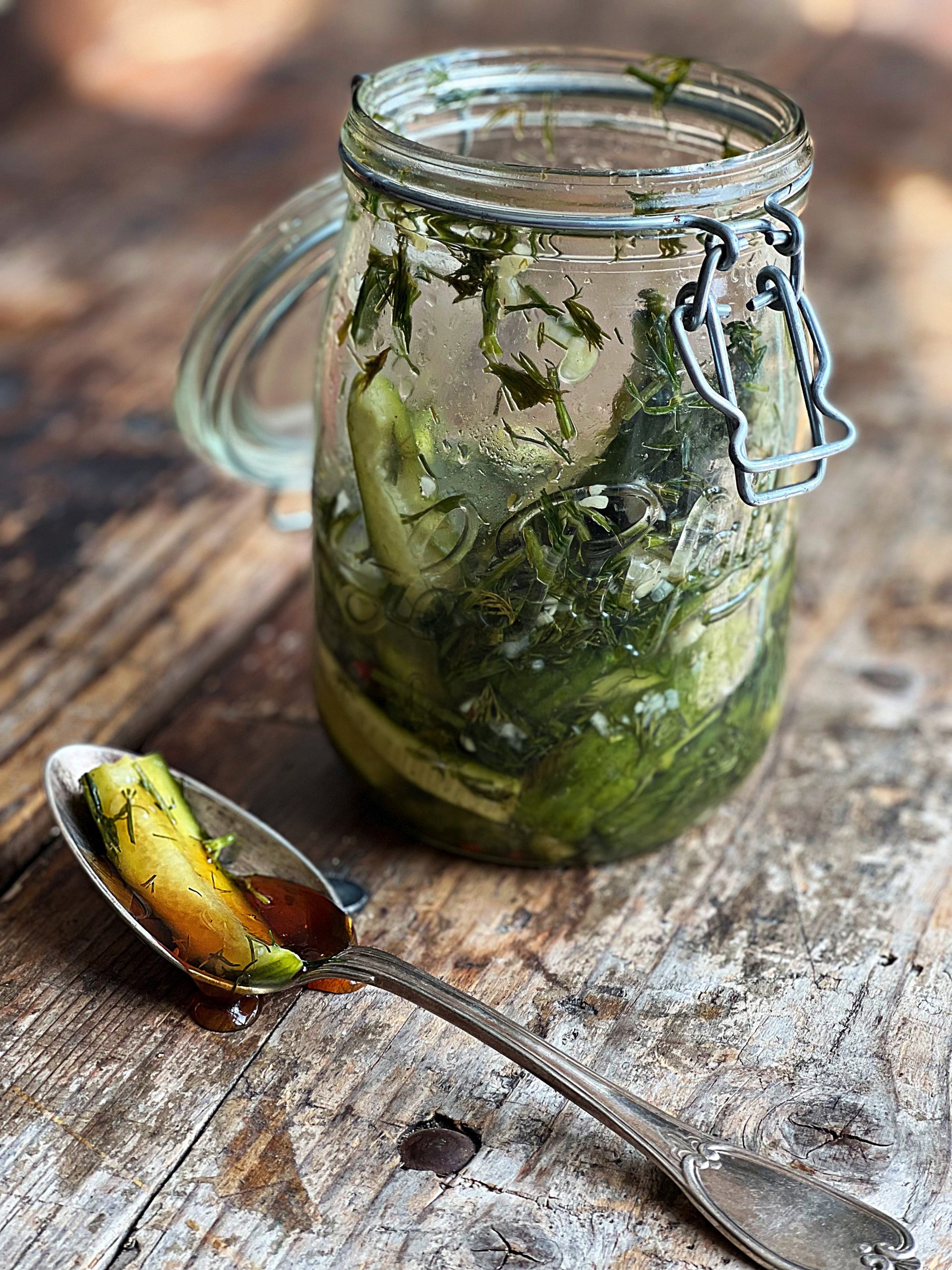 It was originally reported that a Ukrainian grandma downed a Russian drone by throwing a jar of cucumber pickles. Subsequently it was revealed that it was, in fact, a jar of pickled tomatoes. Pickles are very Ukrainian and it seems a particularly good weapon with which to combat an invader. I've stuck to cucumbers as they are easier to find than green tomatoes. These are quickly made and a wonderfully tonic side dish for any meal or even in soup. I've also read that Ukrainians dip the cucumbers in honey and eat them like that!If you have access to oak leaves or blackcurrant leaves, add them as it will add crunchiness.