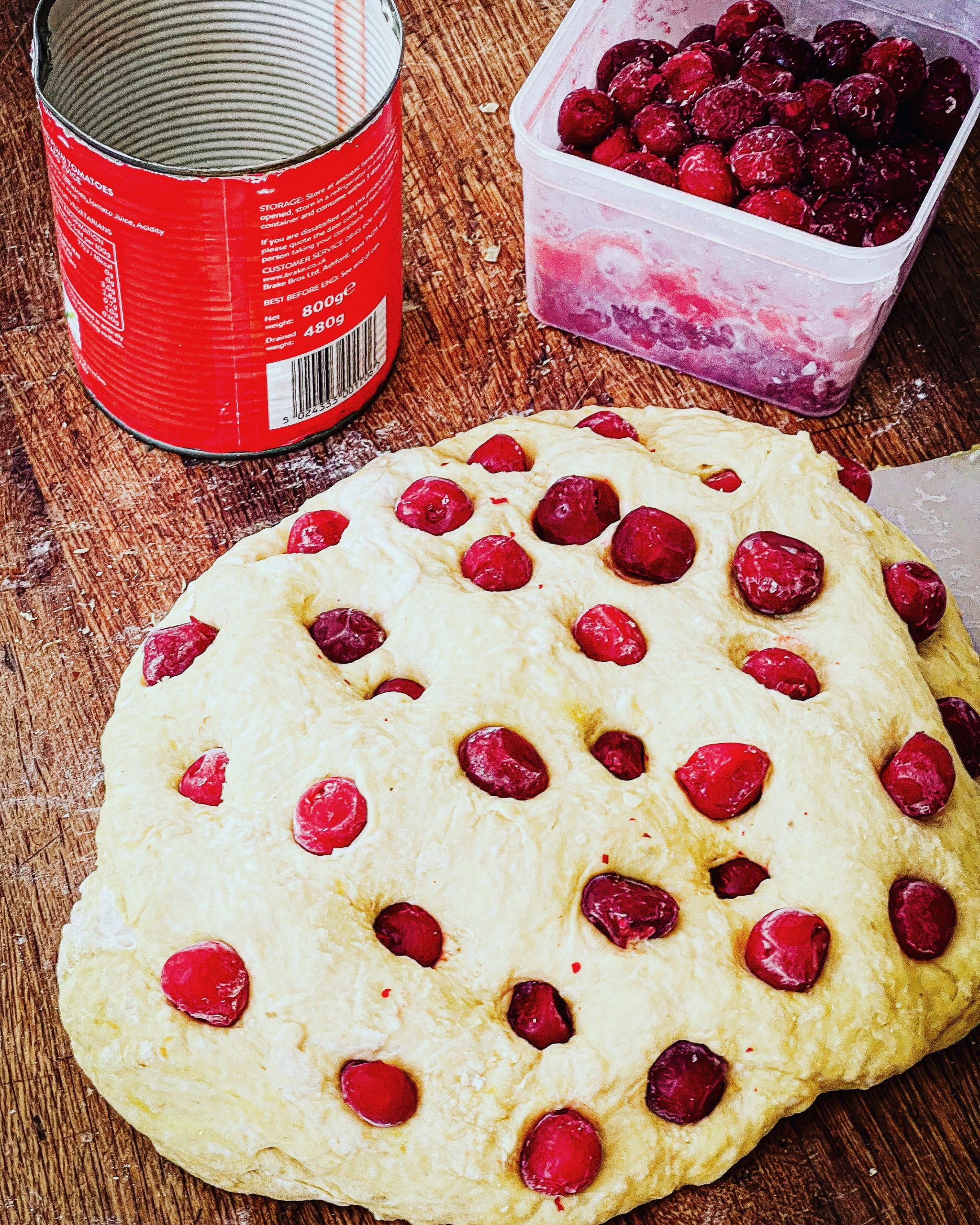 - Add in the flour, knead for 15 minutes, then fold in the dried cherries. Leave to rise for 2 hours.