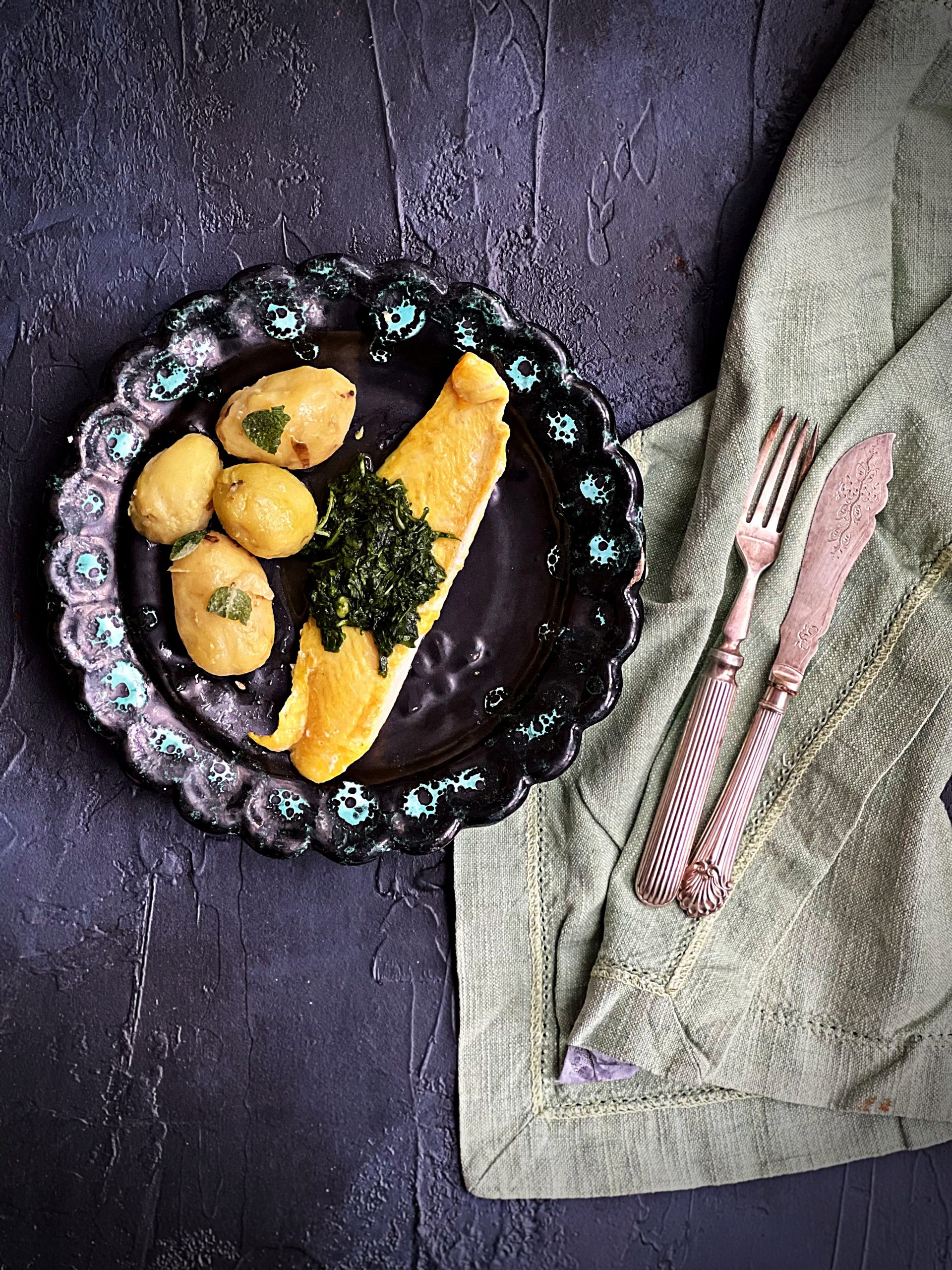 • Garnish the potatoes with more fresh mint. Drizzle the fish fillets with the 'pesto'. Serve hot.