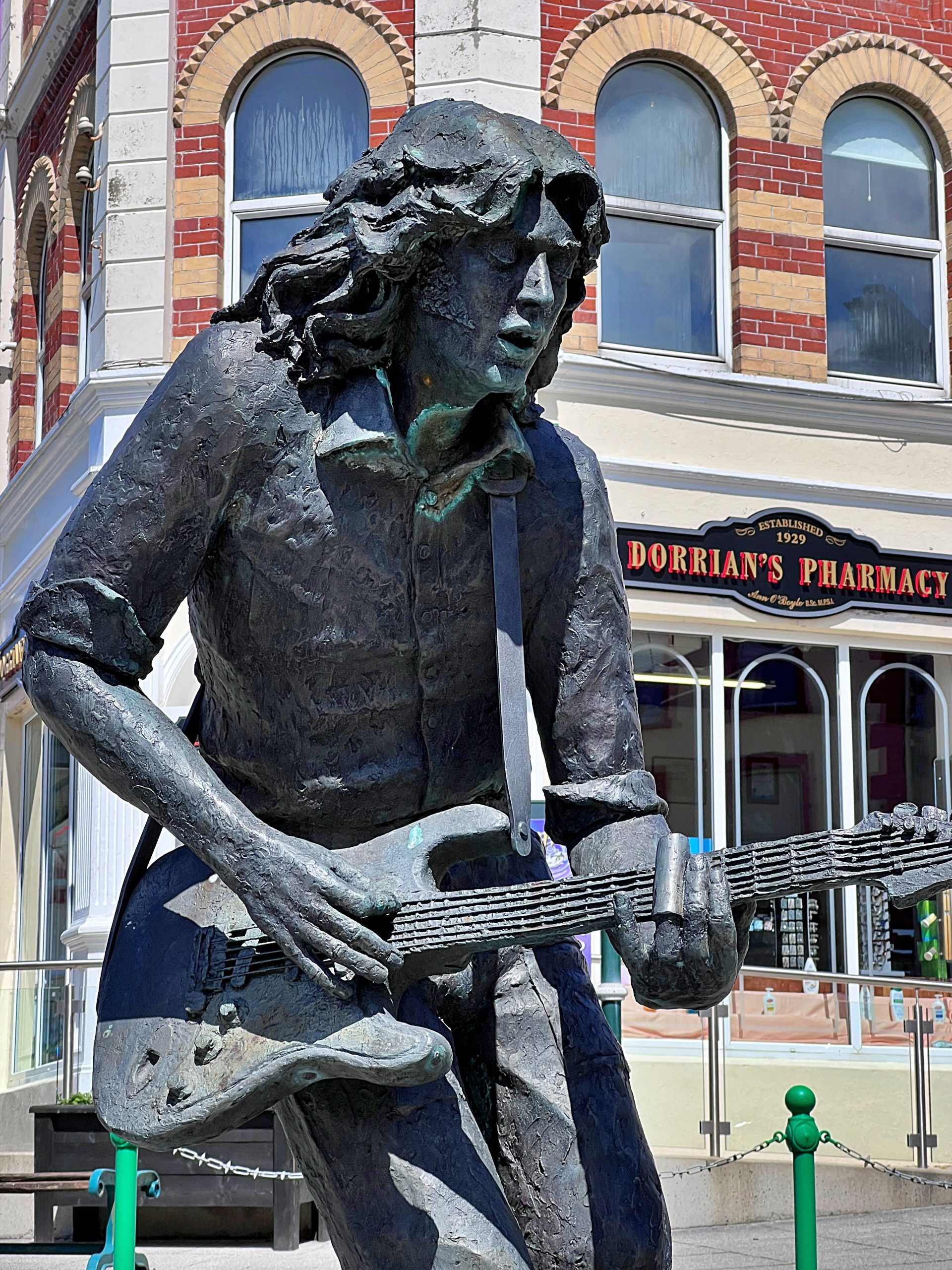 There is a statue of Rory Gallagher, who was big in the ’70s, playing his guitar in the ‘diamond’, or main square. He died of liver failure. ‘He liked a drink,’ said a biography. At the end he was embittered by the lack of attention from the music press and the fact U2 had made it big in America. I don’t blame him. As a punk I was a complete snob about long-haired progressive rock type musicians like him. When you are young and callow, you never think about the feelings of the last discarded pop trend.