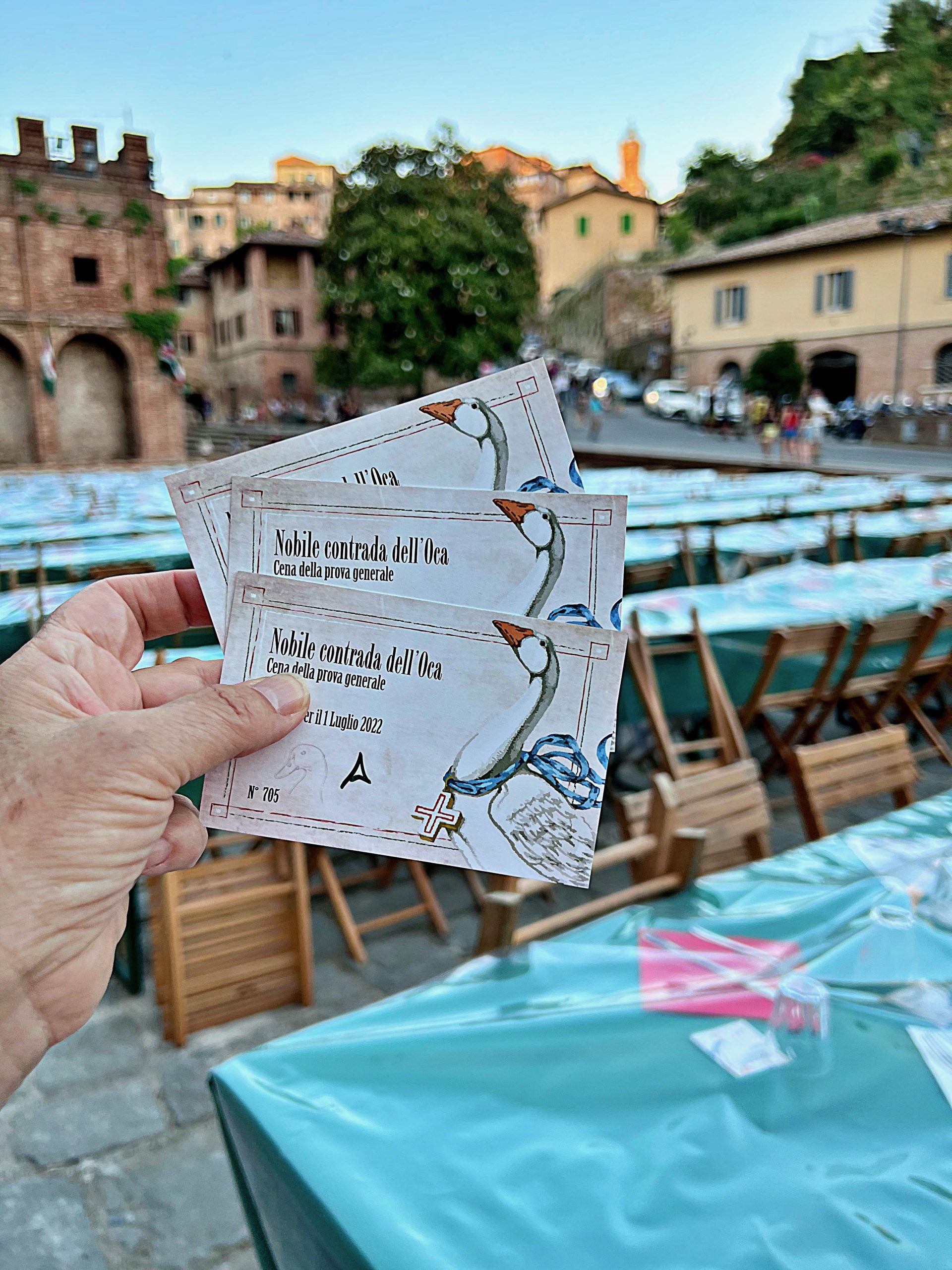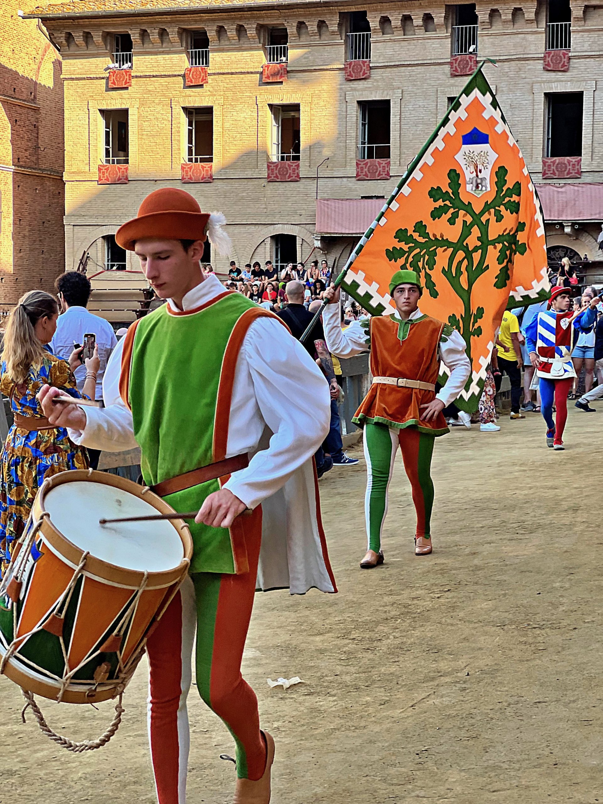 This year, I am part of the oca, wearing the scarf depicting the heraldry, a white goose with a blue ribbon around the neck, on a background of green, red and white. They were disqualified in 2019 for insulting and harassing the Torre. This is the first Palio since the pandemic, so this means they will not be running this year.