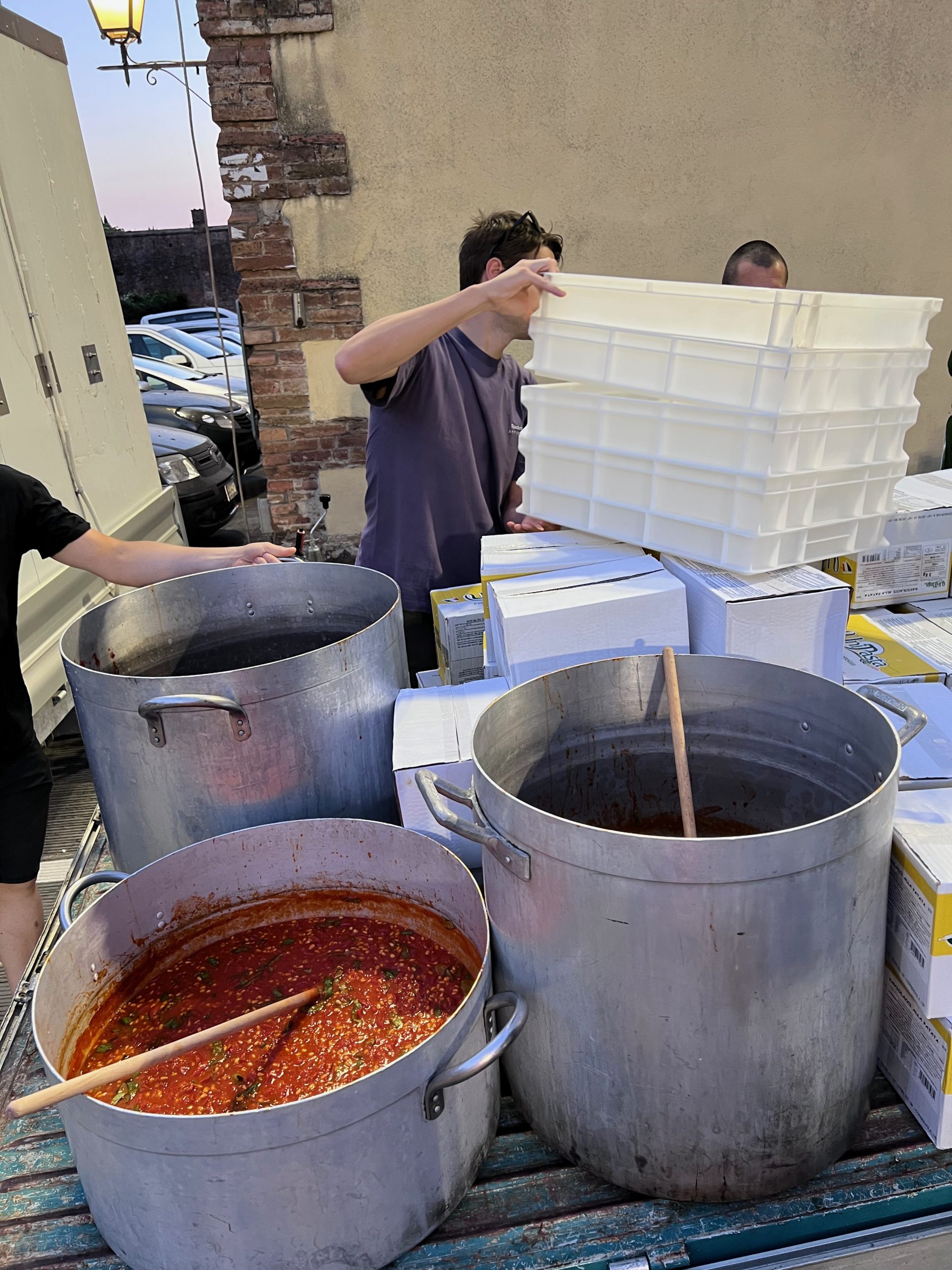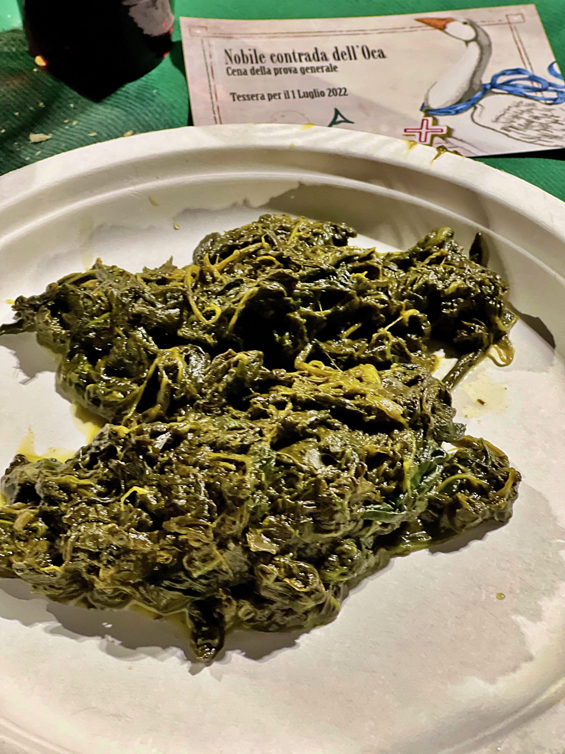 I managed to procure rare tickets (€35 per person), for the evening dinner, usually closed to tourists, in the Oca contrada, around via Santa Catarina. On this occasion, 800 diners are seated in rows of tables in the street. During years when the Oca compete, this total doubles to 1,600, spreading into passageways, alleys, courtyards, piazzas and roads. It’s the biggest supperclub you can imagine. Around 20 cooks, both professional and amateur, cook for 800.