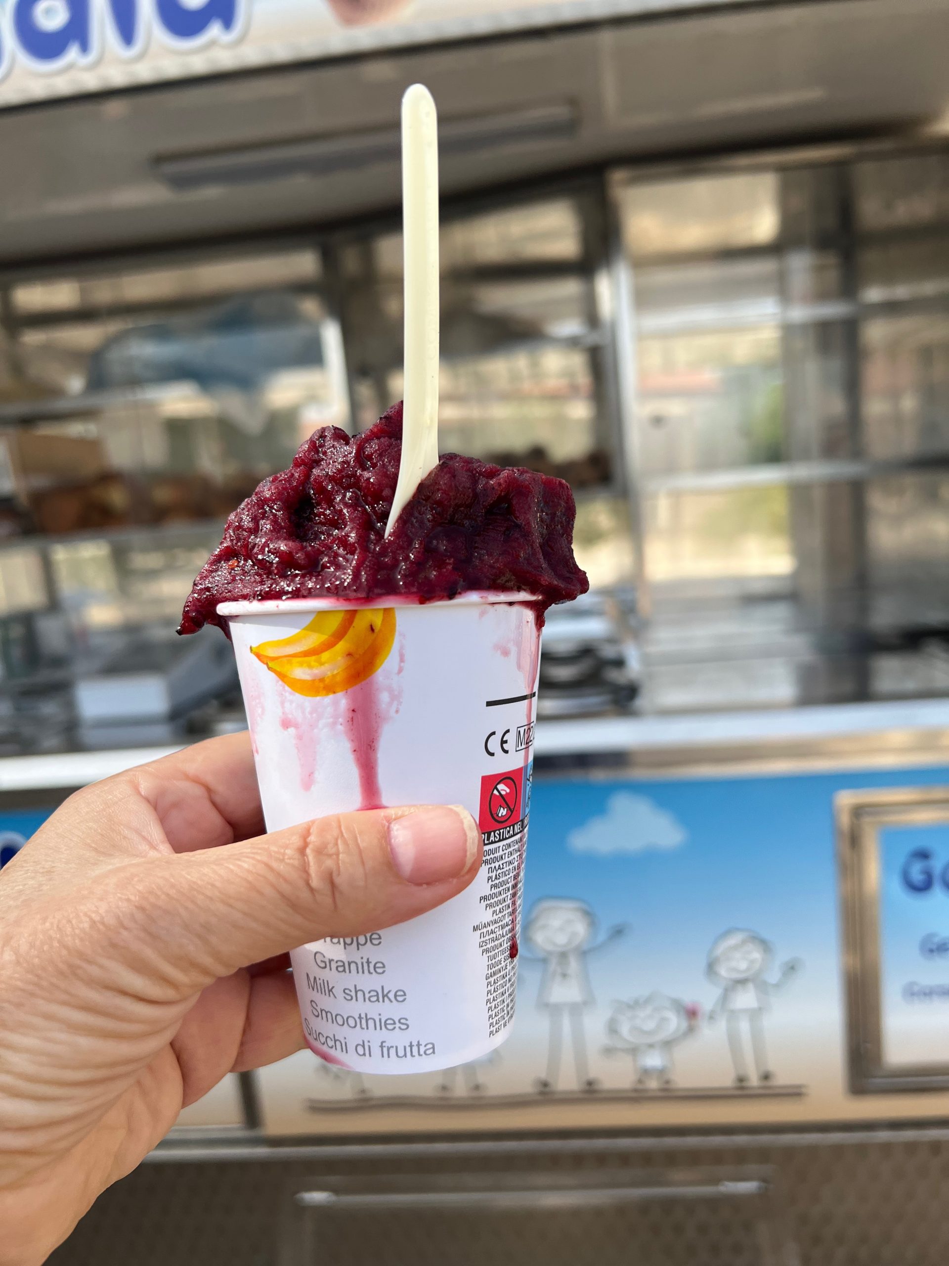 I am staying near Ragusa in a family farmhouse and guest house called Tenuta Cammarana. Owners Silvia La Padula and Guiseppe Pulvirenti, an architect and a sculptor, live the winter in Rome and from April in Sicily. The house is beautifully styled, with cookbooks and art books in the library, local ingredients such as the daily freshly-made still-warm ricotta from a neighbouring farming family ( I tasted it from the copper pot simmering on a fire) and the almond granita with brioche, delivered every afternoon by their own personal ice cream man. Granita and gelato are socially acceptable as breakfast or lunch in Sicily, it’s often too hot to eat anything else.