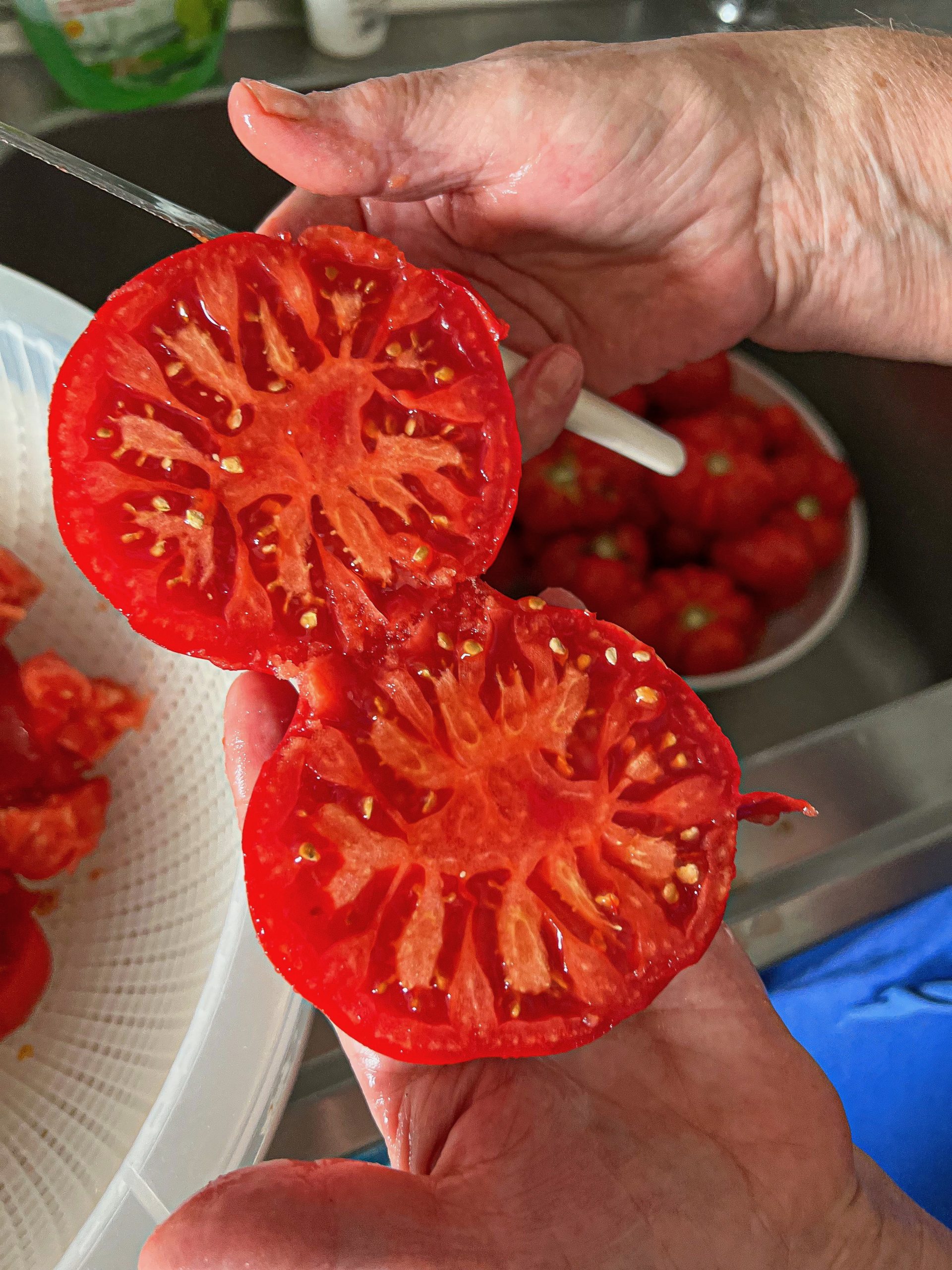 - Cut up the tomatoes into chunks, taking out any damaged bits and the hard core. Add the onion.