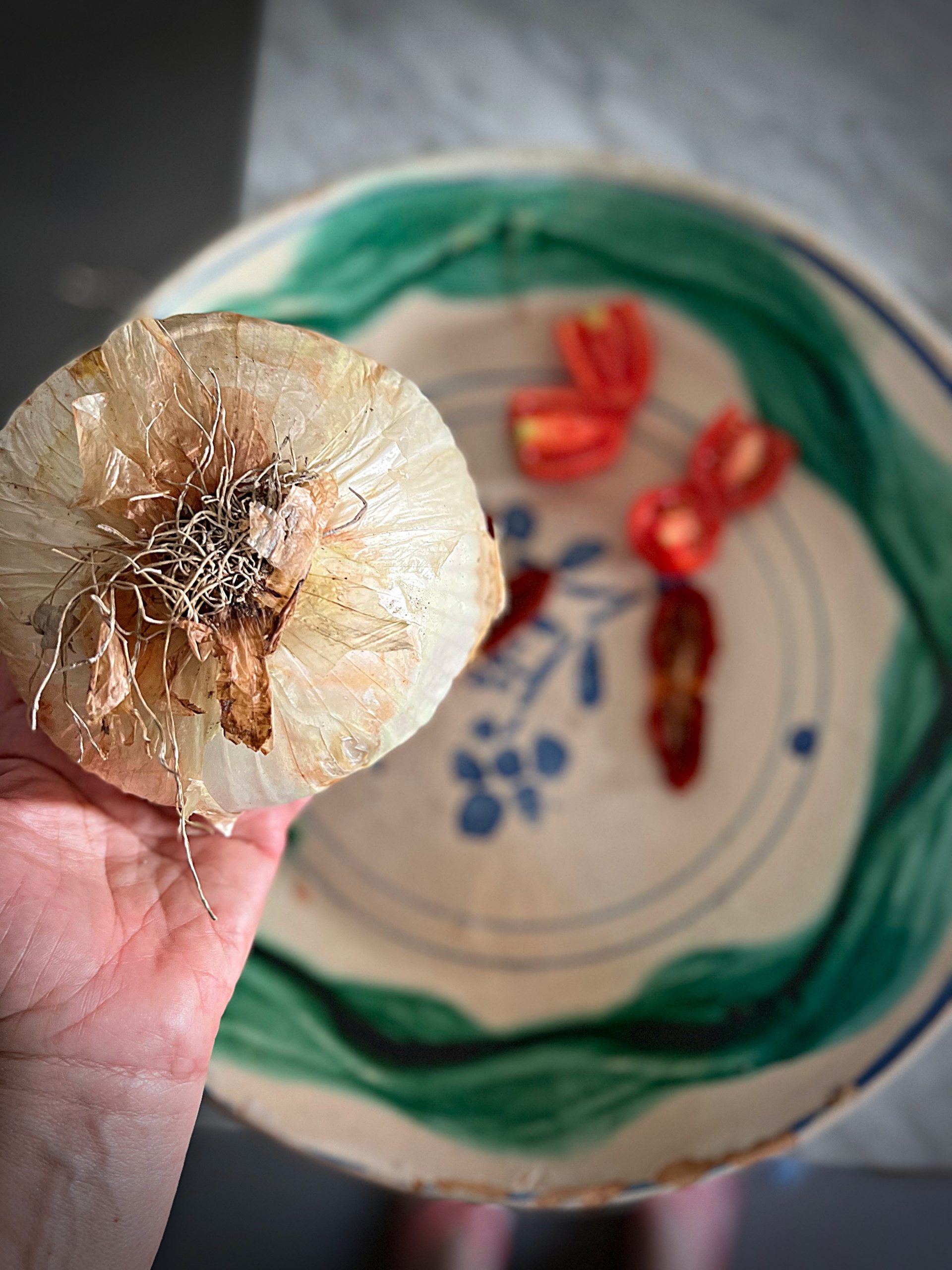 The Sicilians use two types of tomato: Rico di Parma, like beef heart tomatoes, and Piccadilly, more like plum tomatoes, which are native to Southern Italy despite their British-sounding name. If they consider the tomatoes too acidic, they will add a local white onion, enormous in size, from Giarratana village.