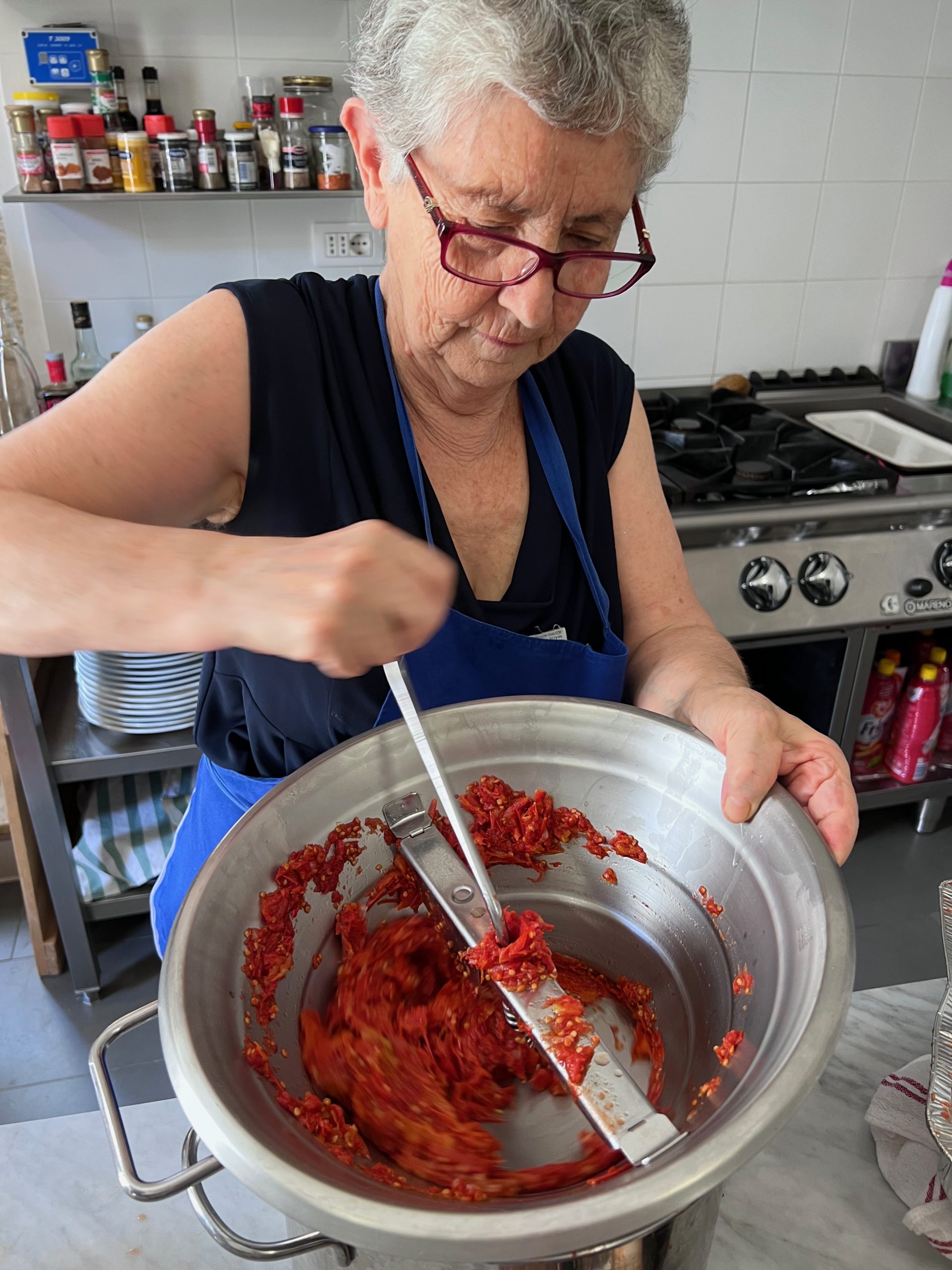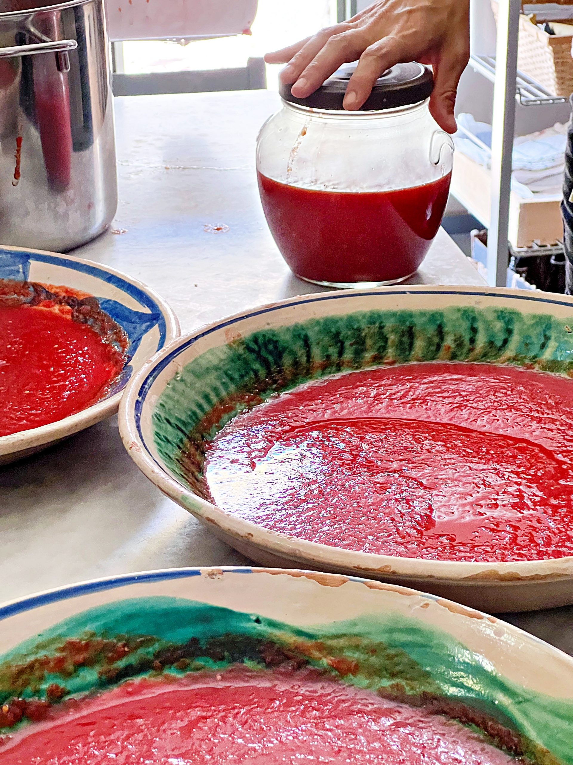 To make the tomato concentrate, special terracotta majolica dishes with a blue and yellow tin glaze, known in dialect as ‘fanguotto’, are used. These absorb the heat and aid in dehydrating the tomatoes. I’ve also seen it made on large wooden tables.