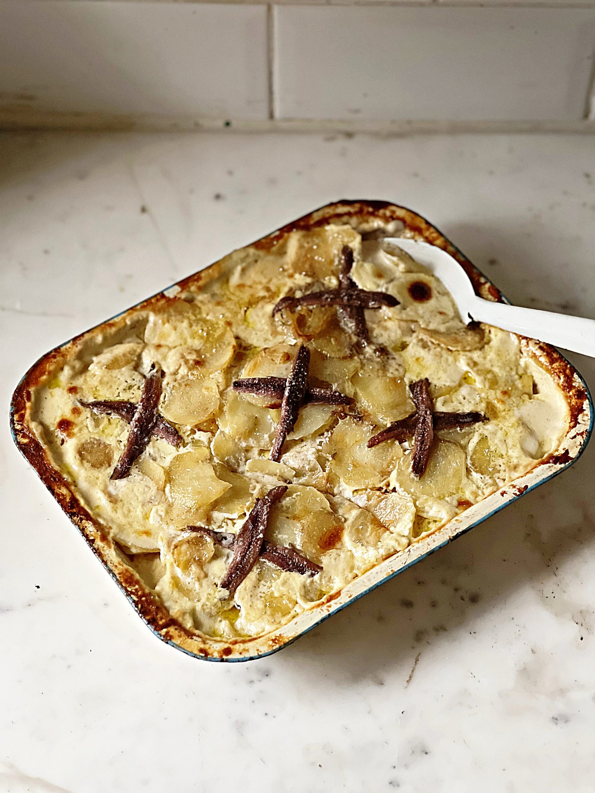 - Cover with foil and bake at 180ºC for 30 minutes until a fork goes through the potatoes easily. Add the rest of the cream and on top place the anchovies in criss-cross style. Uncover and bake for another 15 minutes.