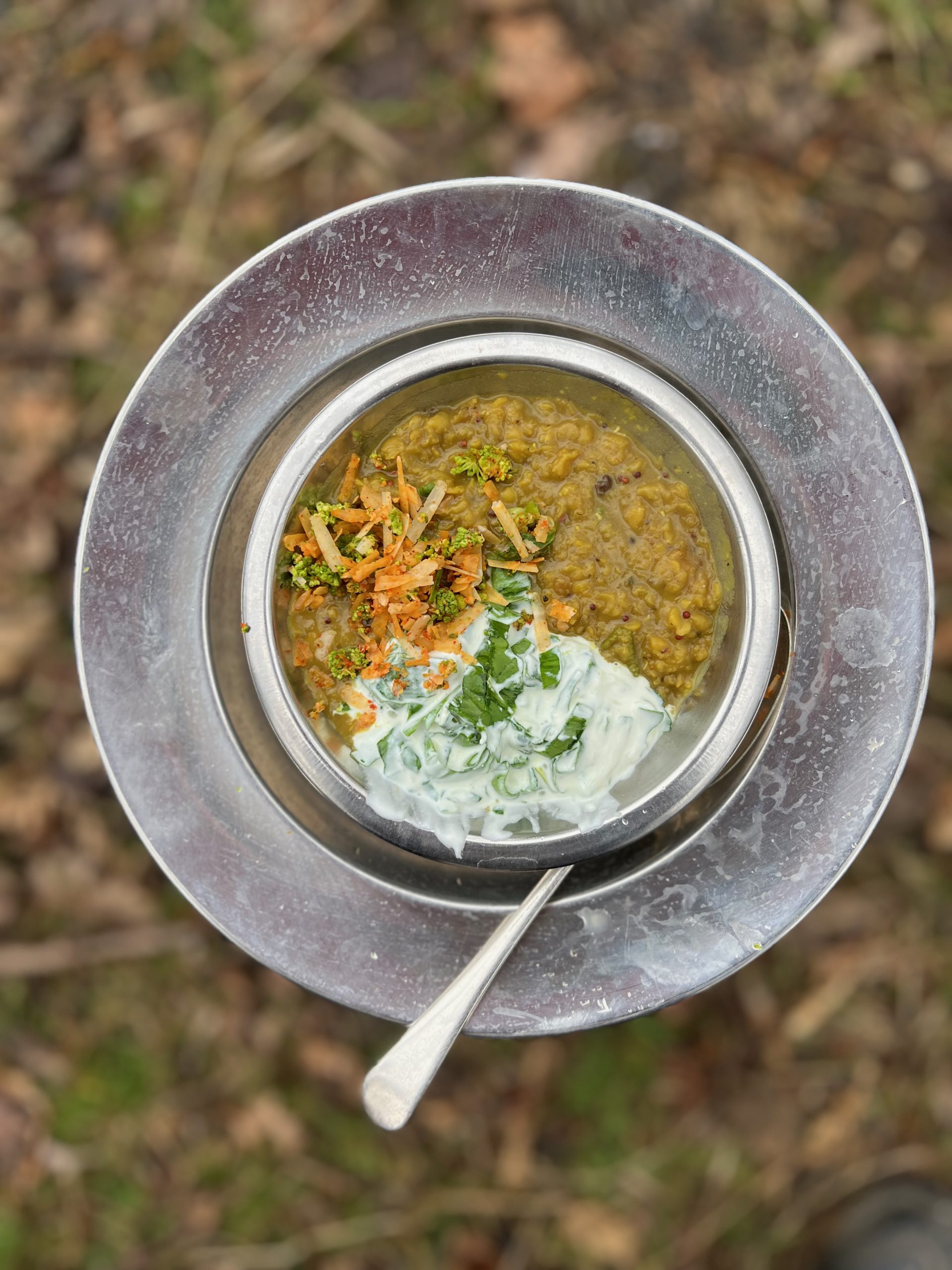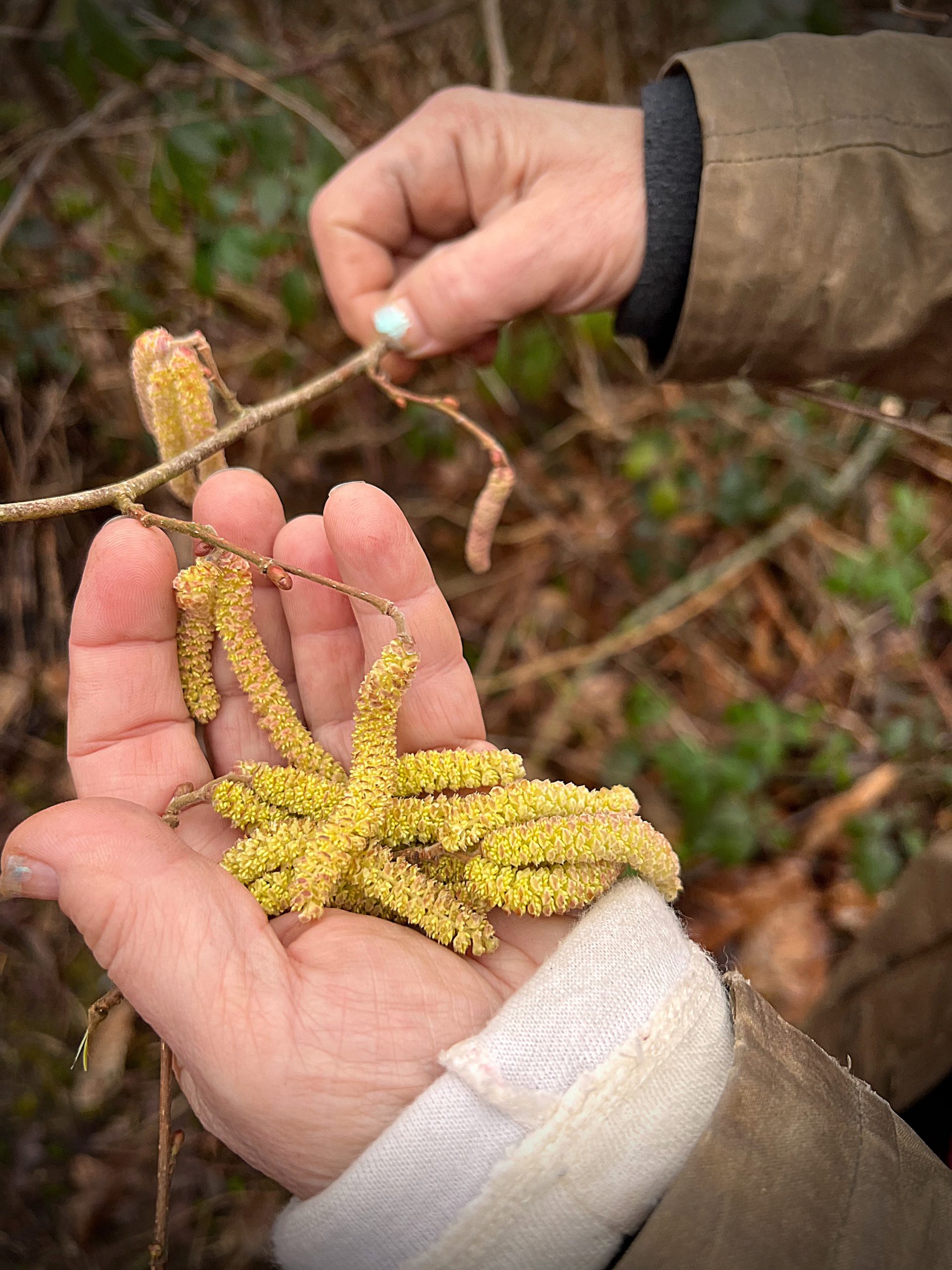 Chef Lucia Stuart of The Wild Kitchen then took over. We’d gone on a foraging walk, finding wild garlic, dock seeds (which can be made into flour), alexanders (a Roman plant that can be used in salad). She made a delicious dhal on the campfire, served with a wild garlic raita and an alexander and parmesan crumble. We drank tea made from hazel catkins and a refreshing cucumber-style ‘tonic’ from cleavers (the ‘velcro’ plant).