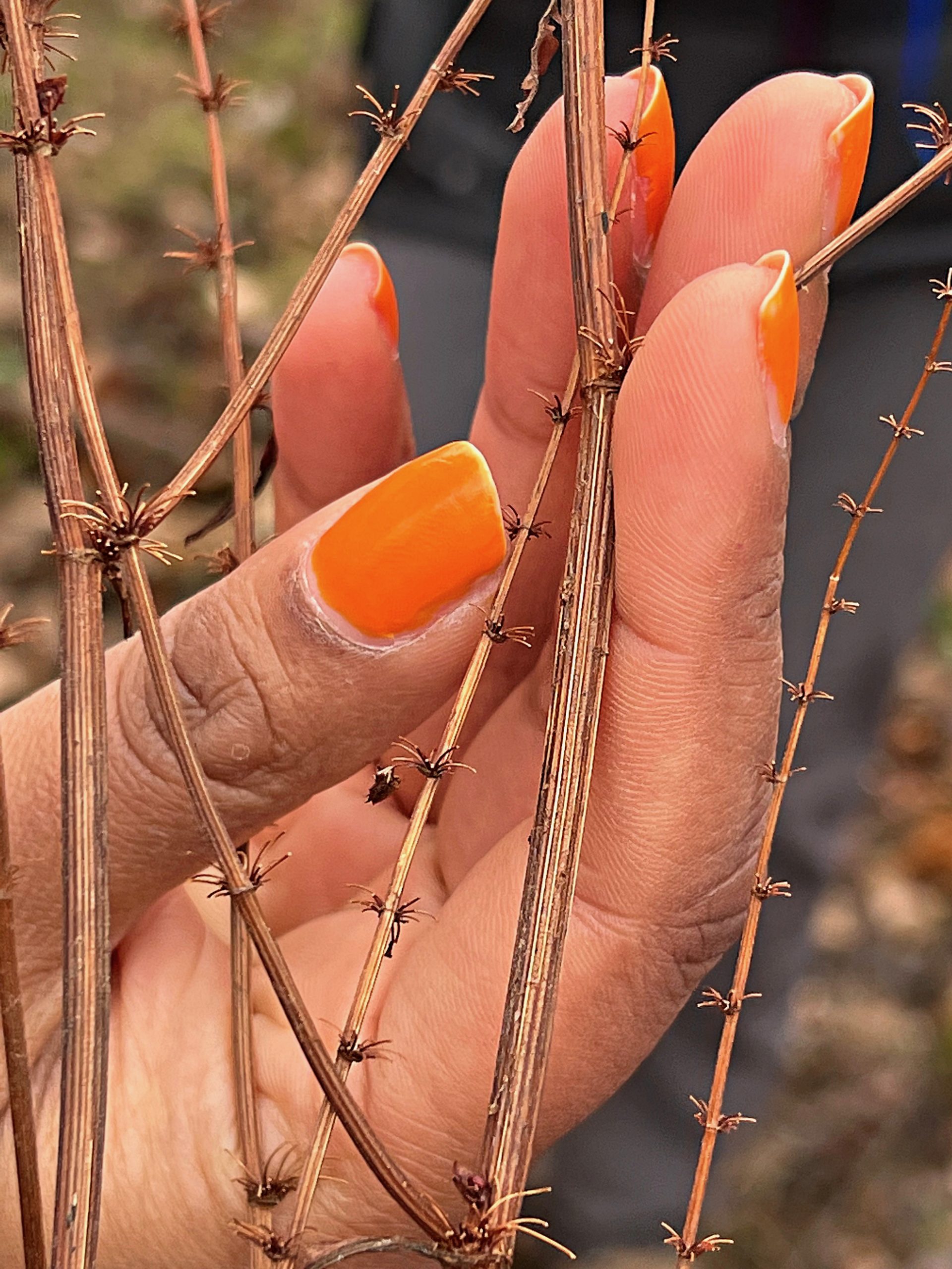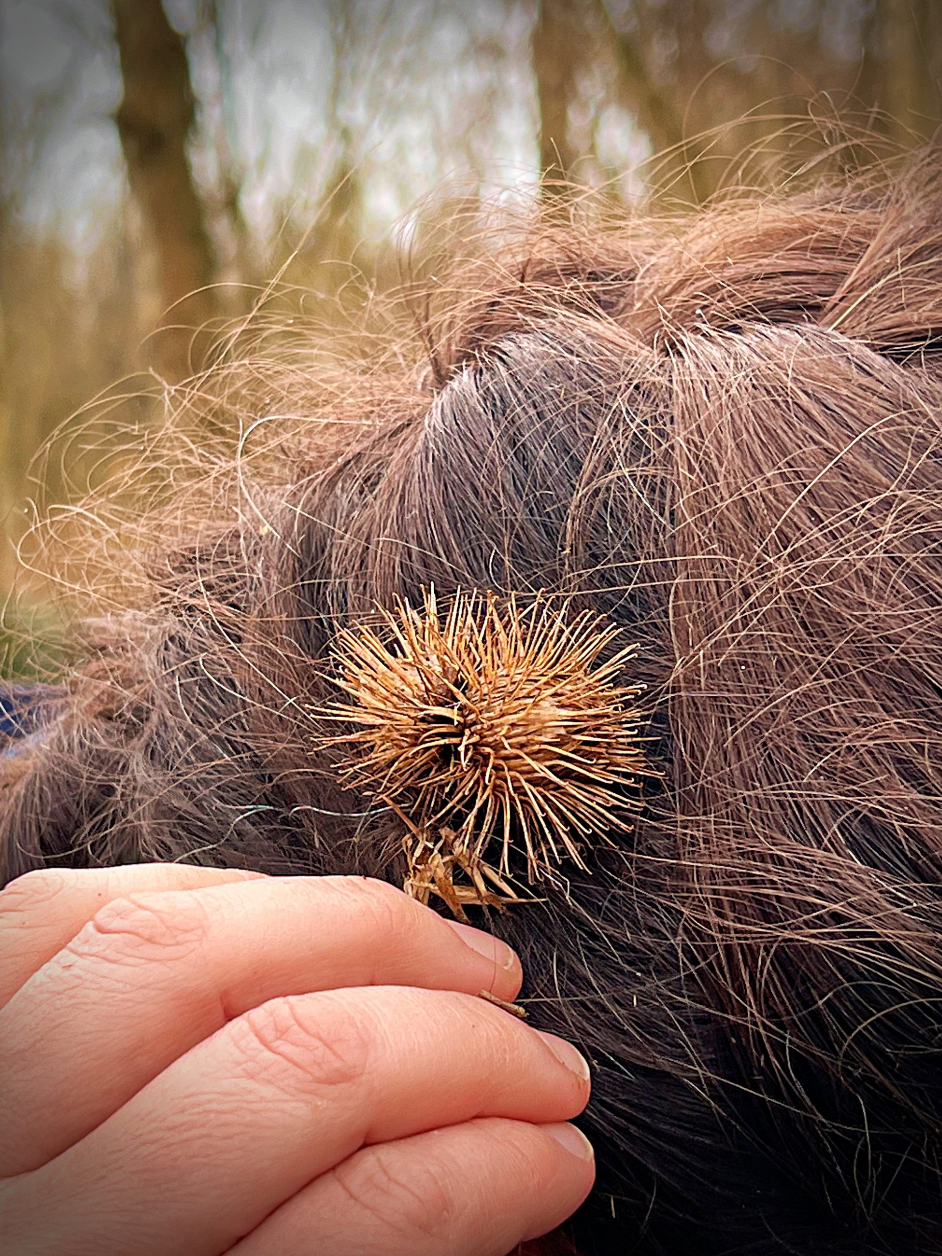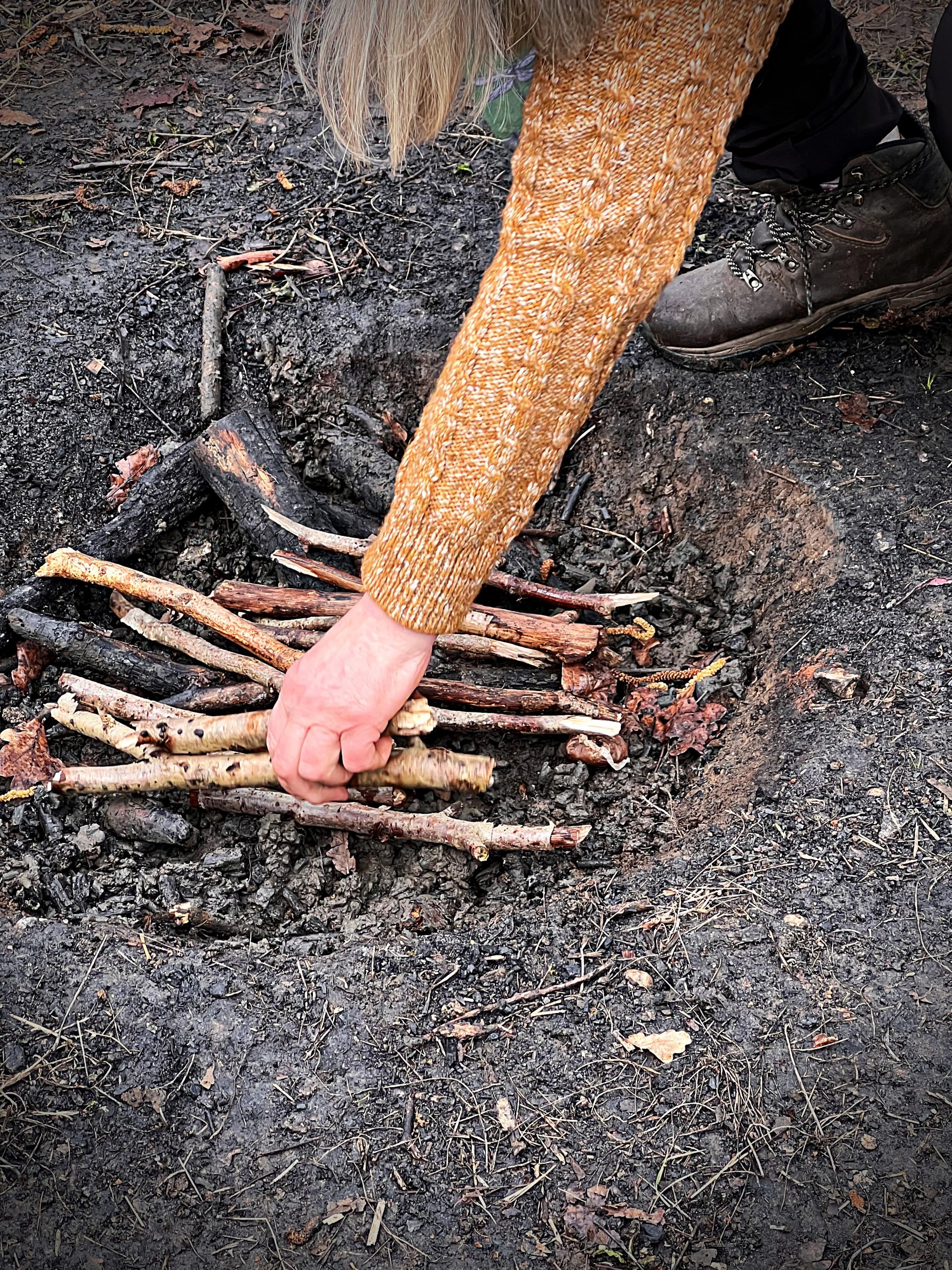 On this mini ‘experience’, we learnt to build a fire in the woods. First we gathered wood, dividing sticks into three sizes and thicknesses – matchsticks, pencils and fingers. Then we dug a circular pit, which we lined with more wooden sticks. It’s advisable to dig a pit when building a fire for three reasons: to protect the ground and ‘leave no trace’; to contain the boundaries of the fire; and to encourage the air to literally circulate. The matchsticks are propped up in the ground in a teepee form, then pencils and fingers are added. An opening is made within the teepee in which ‘Old Man’s Beard’ and other dry fluffy vegetation such as rosebay willowherb or fireweed is placed. You could also use ‘King Alfred’s cake’ or ‘cramp ball’, a knobbly fungus often found on ash trees, also known as nature’s fire starter.