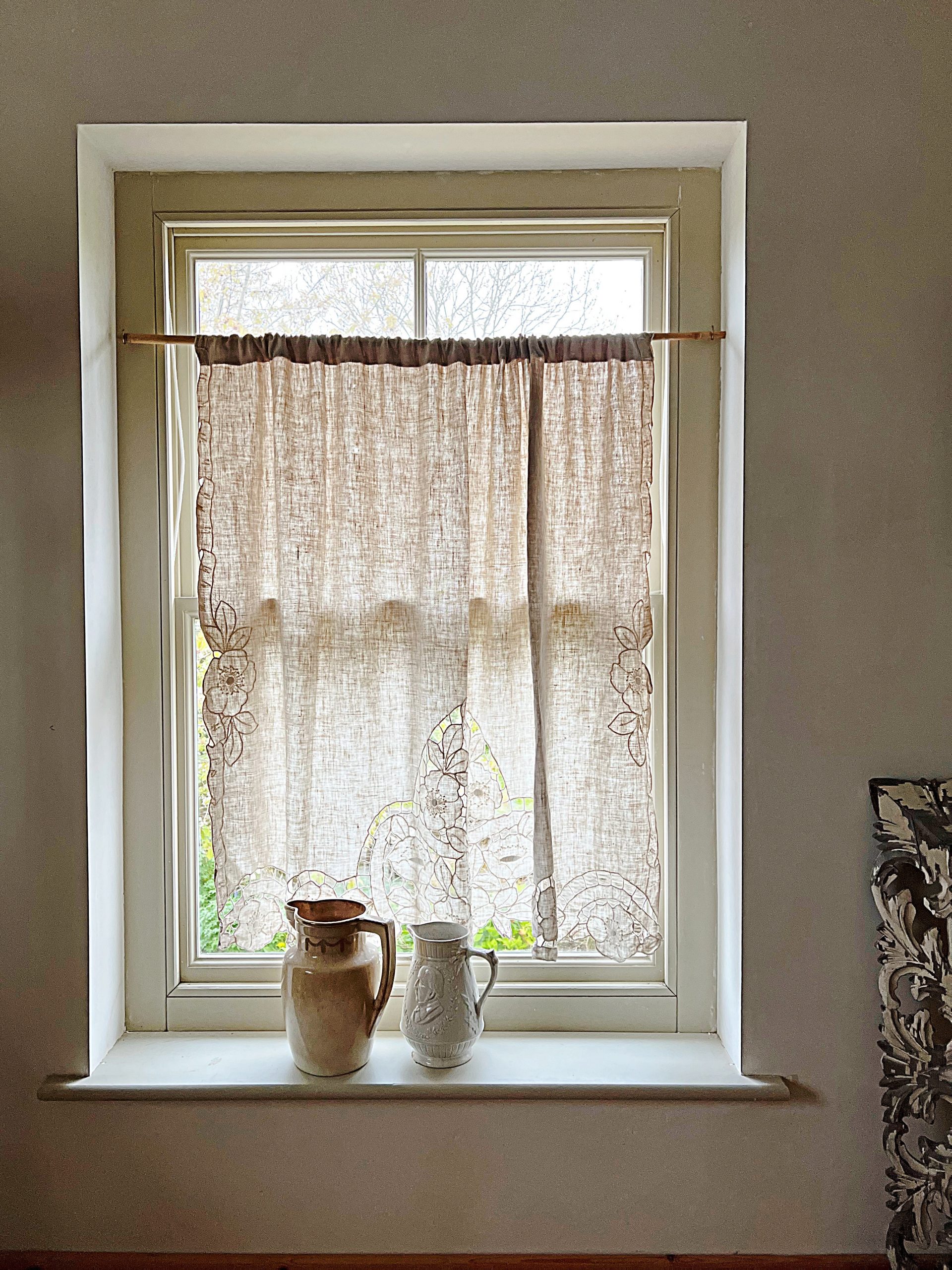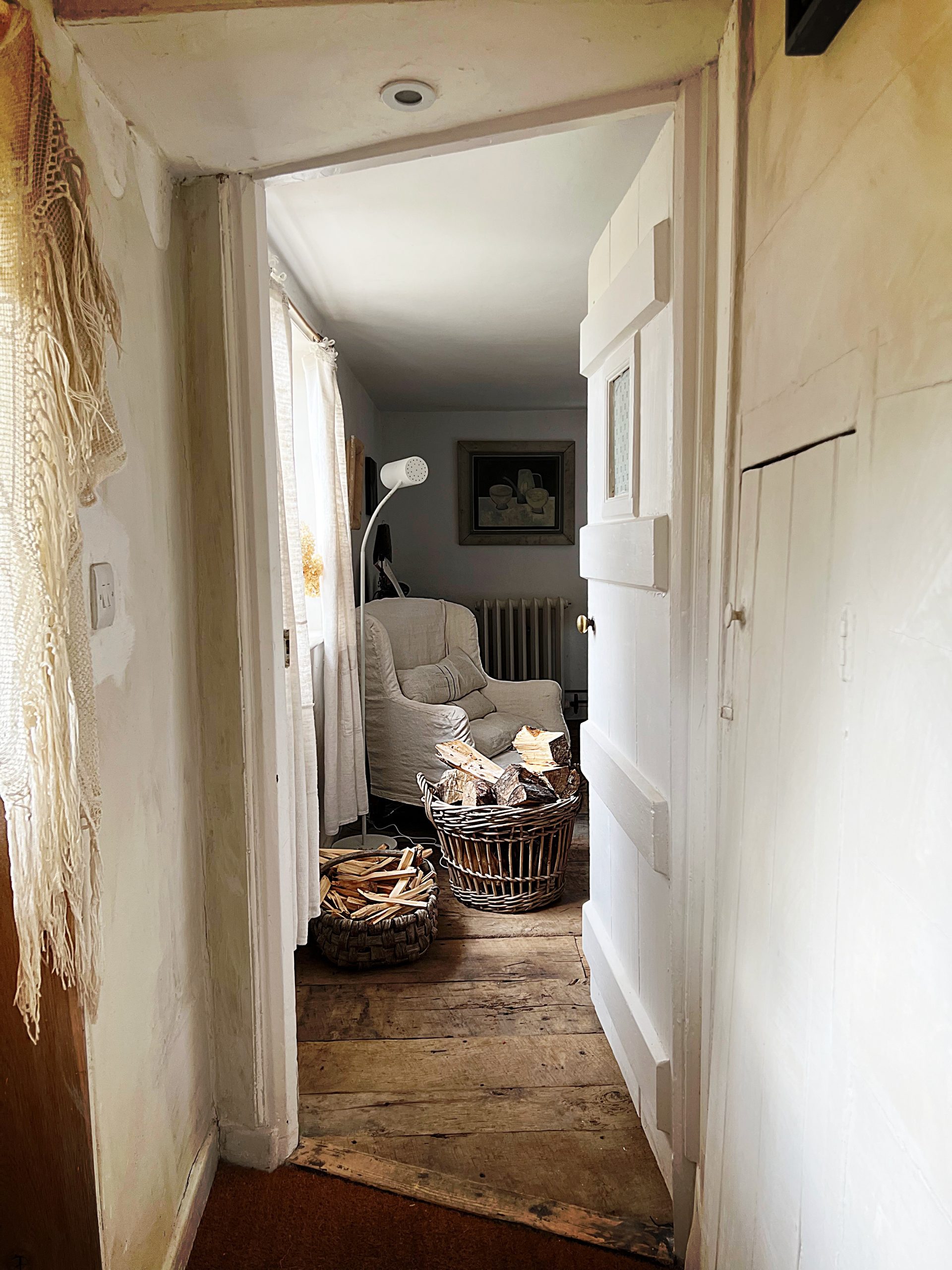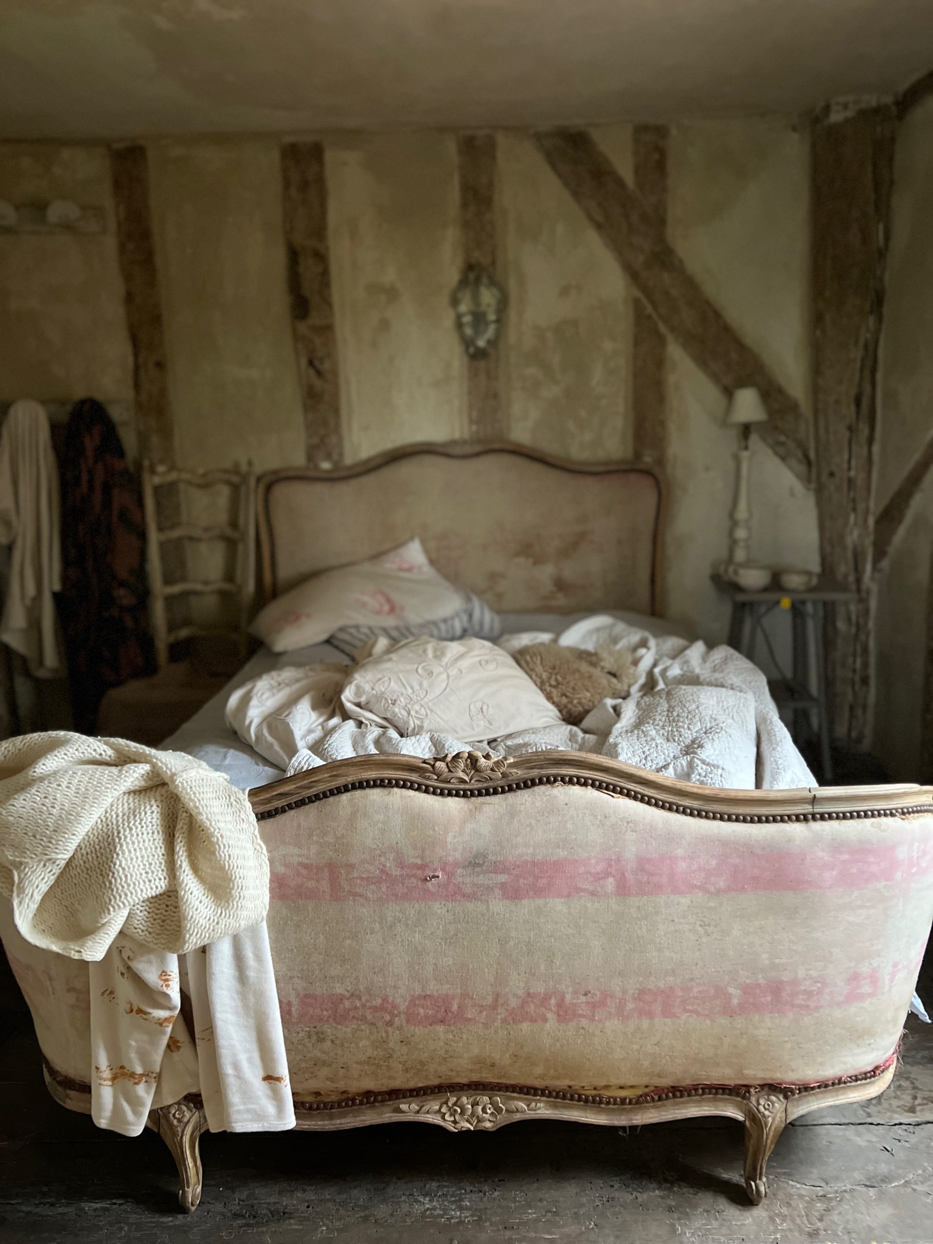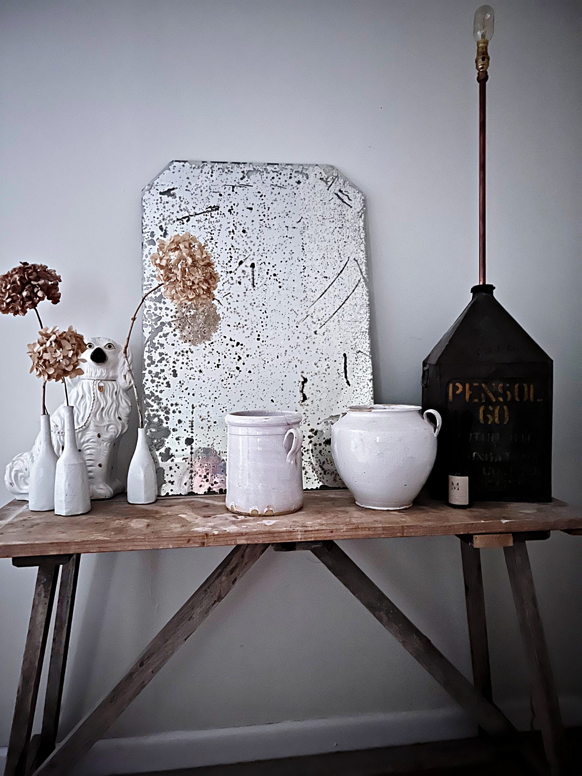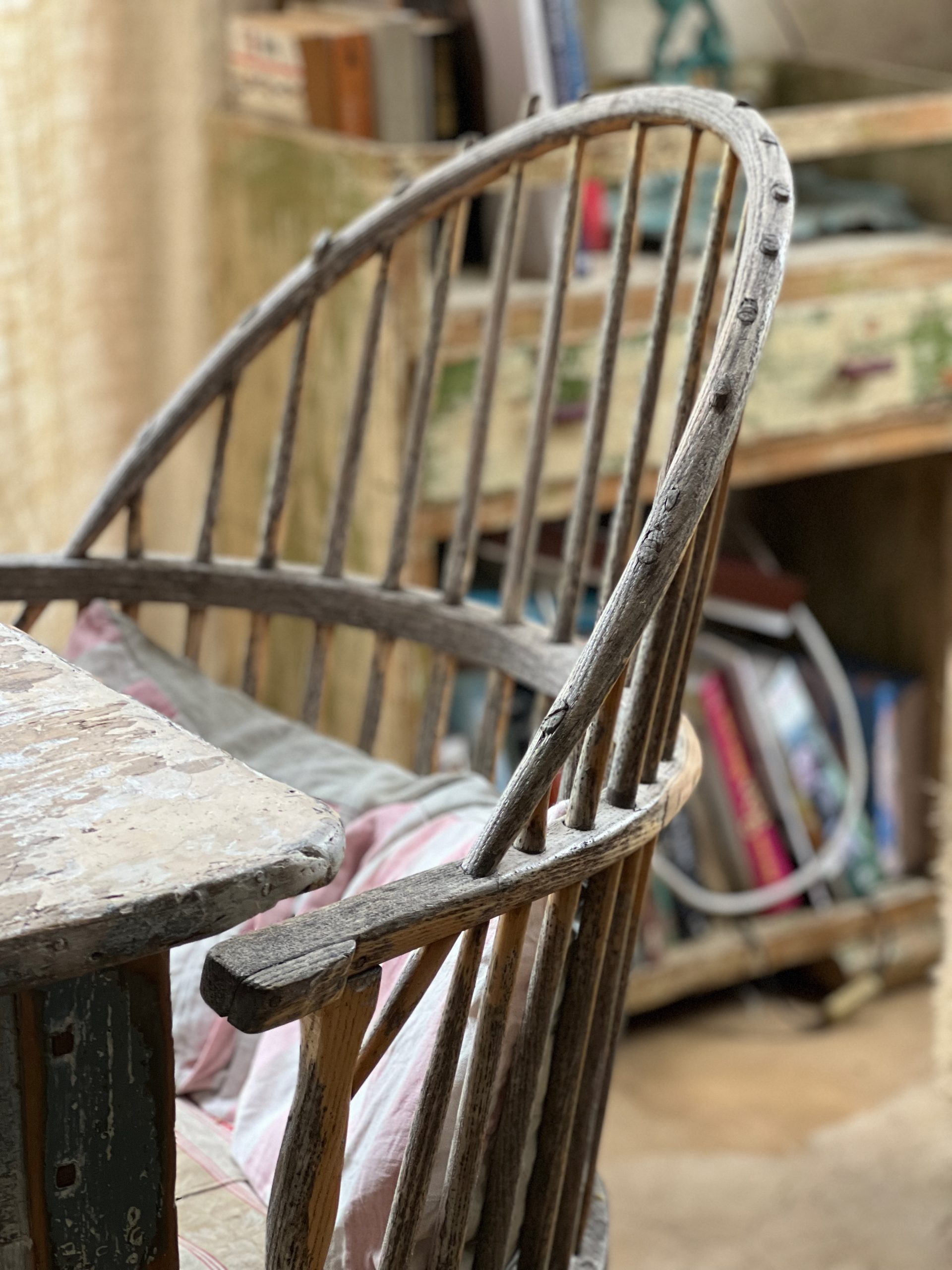 I drove to Norfolk last week to find a reclaimed window and stopped in at my friend Claire Halsey’s beautiful home in Suffolk. It’s an 18th century farmhouse and she has the most exquisite taste. Everything is white, cream, apricot, rustic. She’s a potter, a painter, an upholsterer, a recycler of furniture. The furniture is all chippy paint and pale wood. There are vintage linen and lace curtains, and all of her chairs have loose linen covers that she’s made. It’s beautiful. Every corner is a delight.