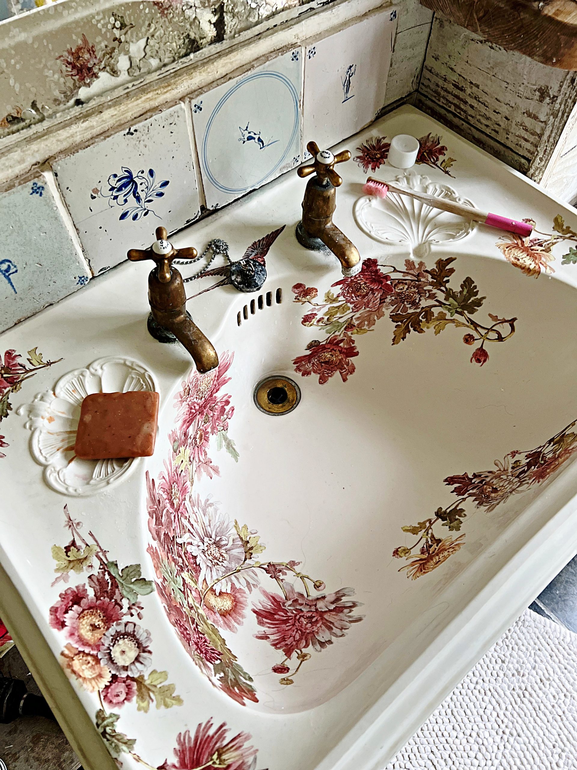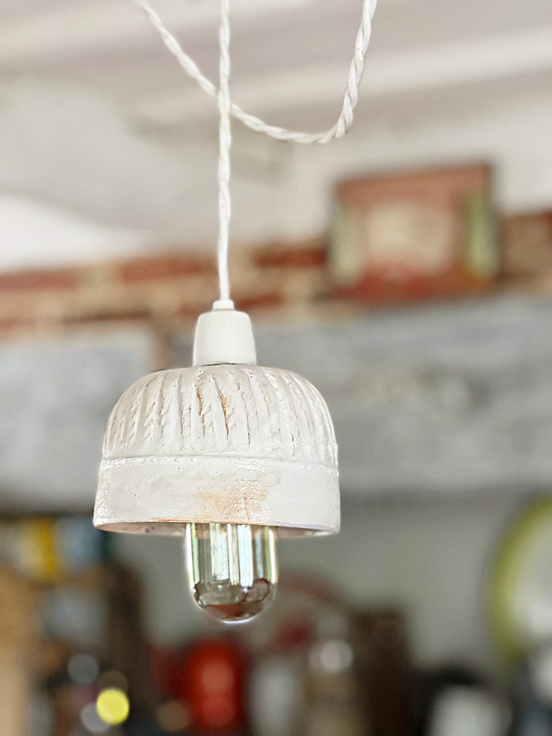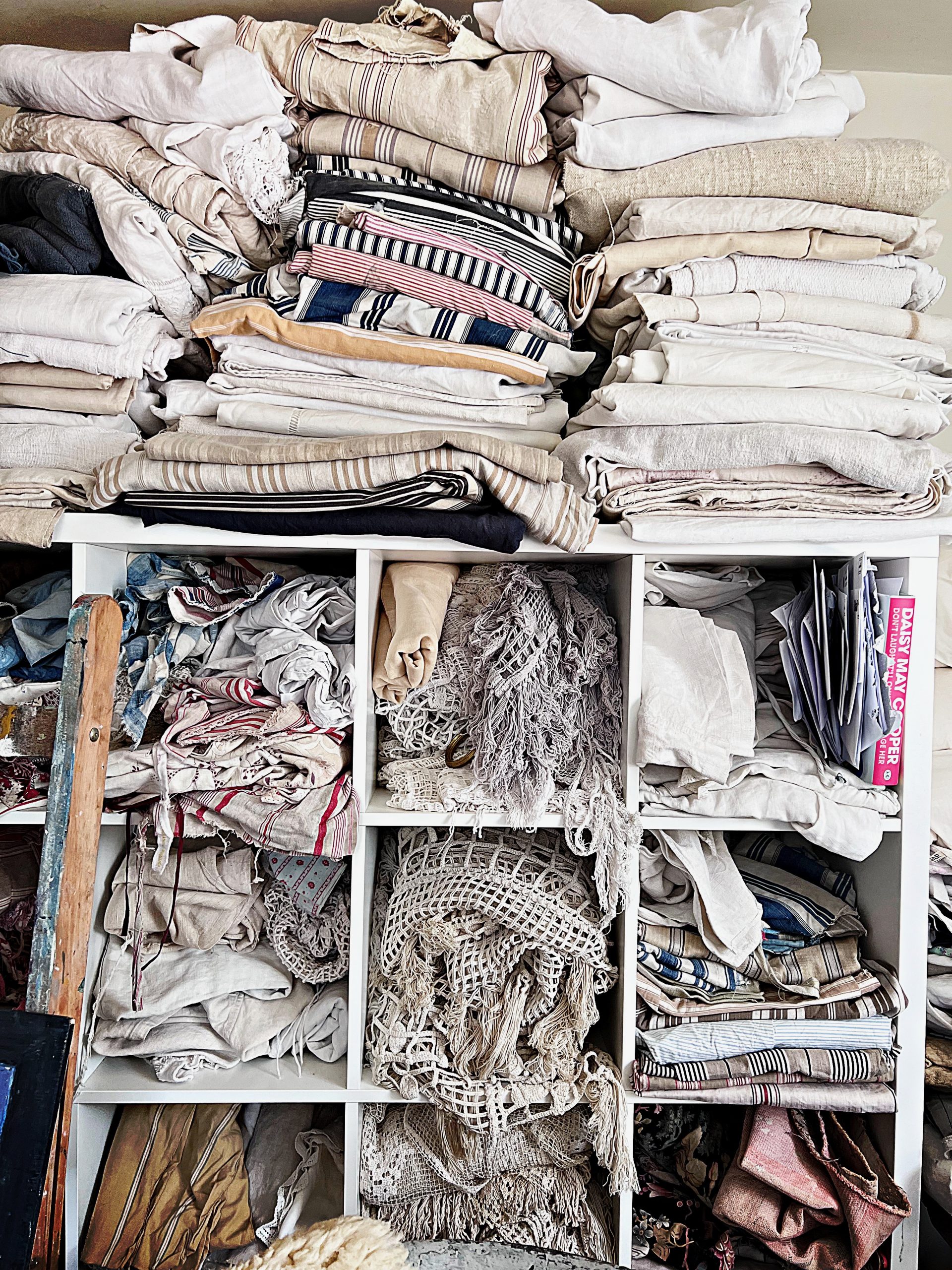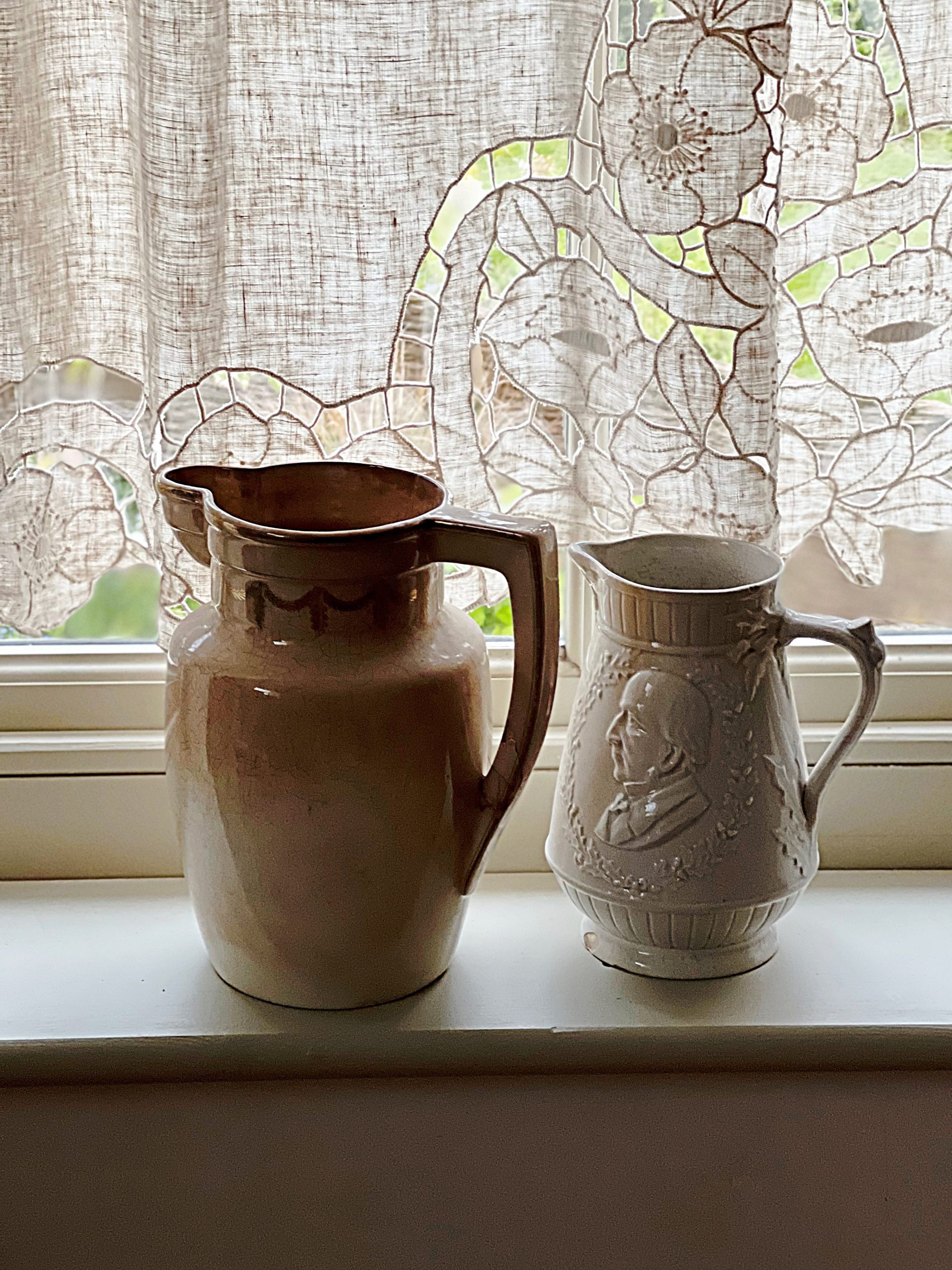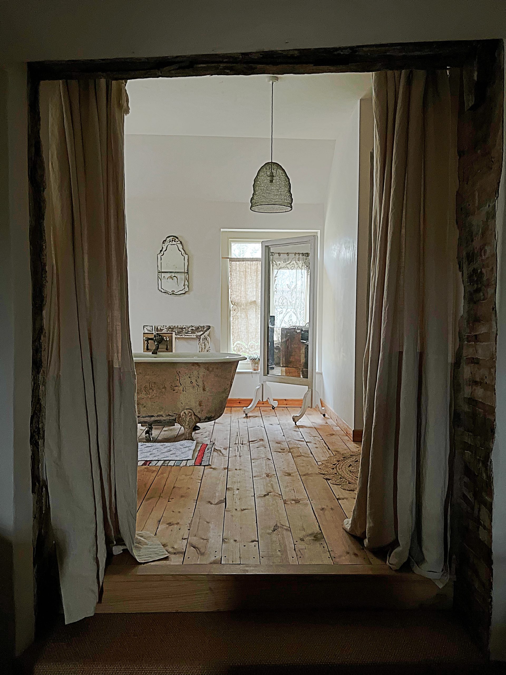 I drove to Norfolk last week to find a reclaimed window and stopped in at my friend Claire Halsey’s beautiful home in Suffolk. It’s an 18th century farmhouse and she has the most exquisite taste. Everything is white, cream, apricot, rustic. She’s a potter, a painter, an upholsterer, a recycler of furniture. The furniture is all chippy paint and pale wood. There are vintage linen and lace curtains, and all of her chairs have loose linen covers that she’s made. It’s beautiful. Every corner is a delight.