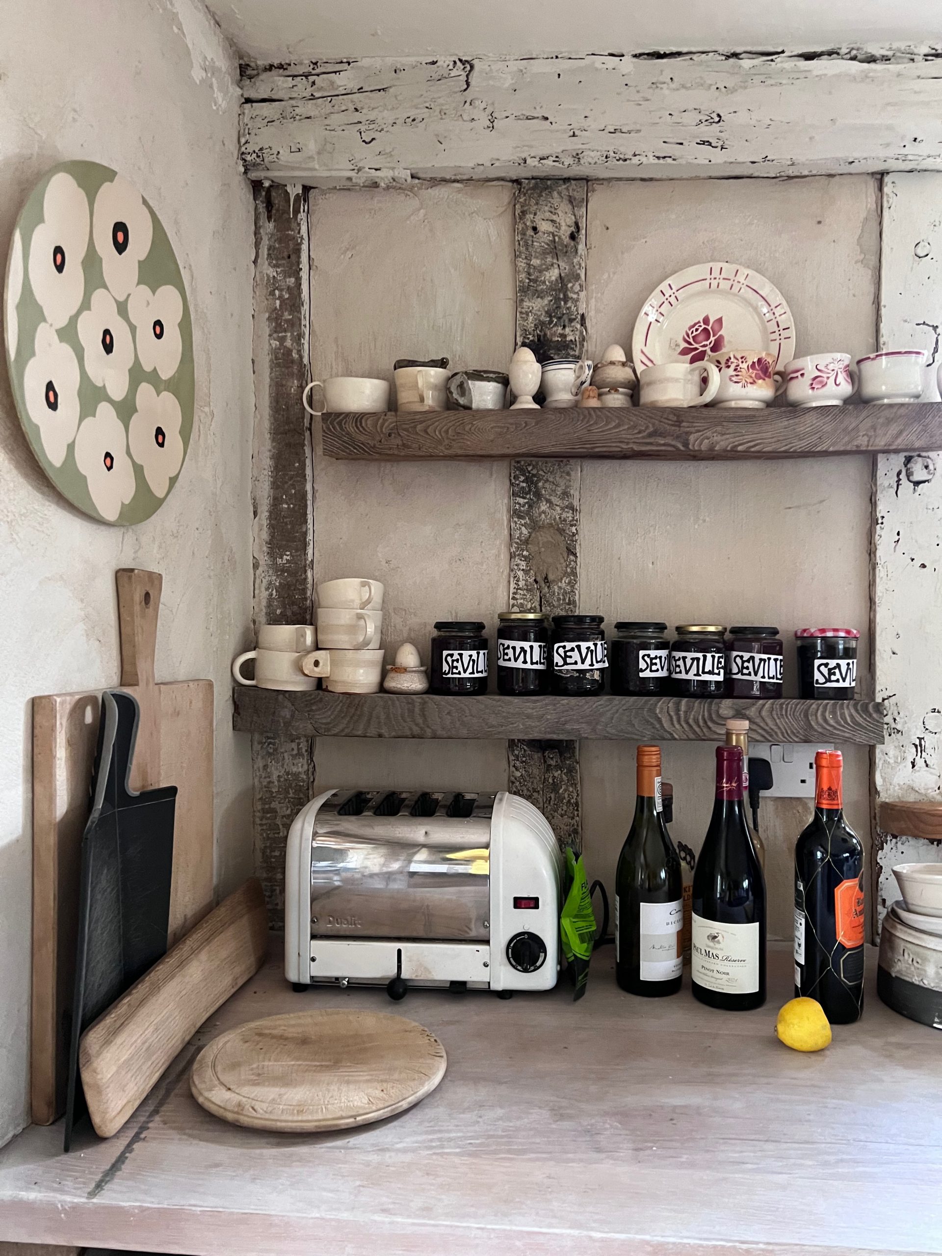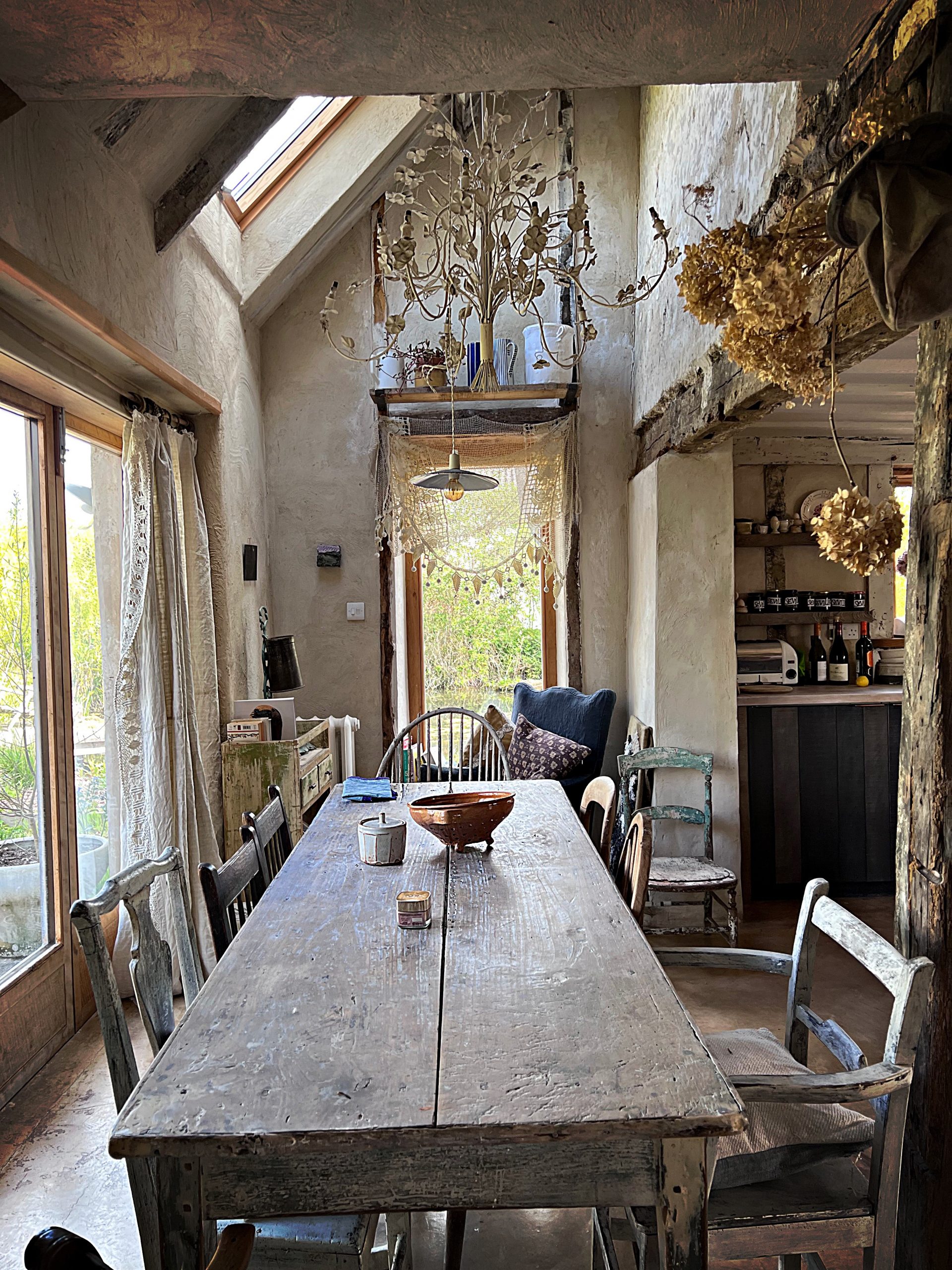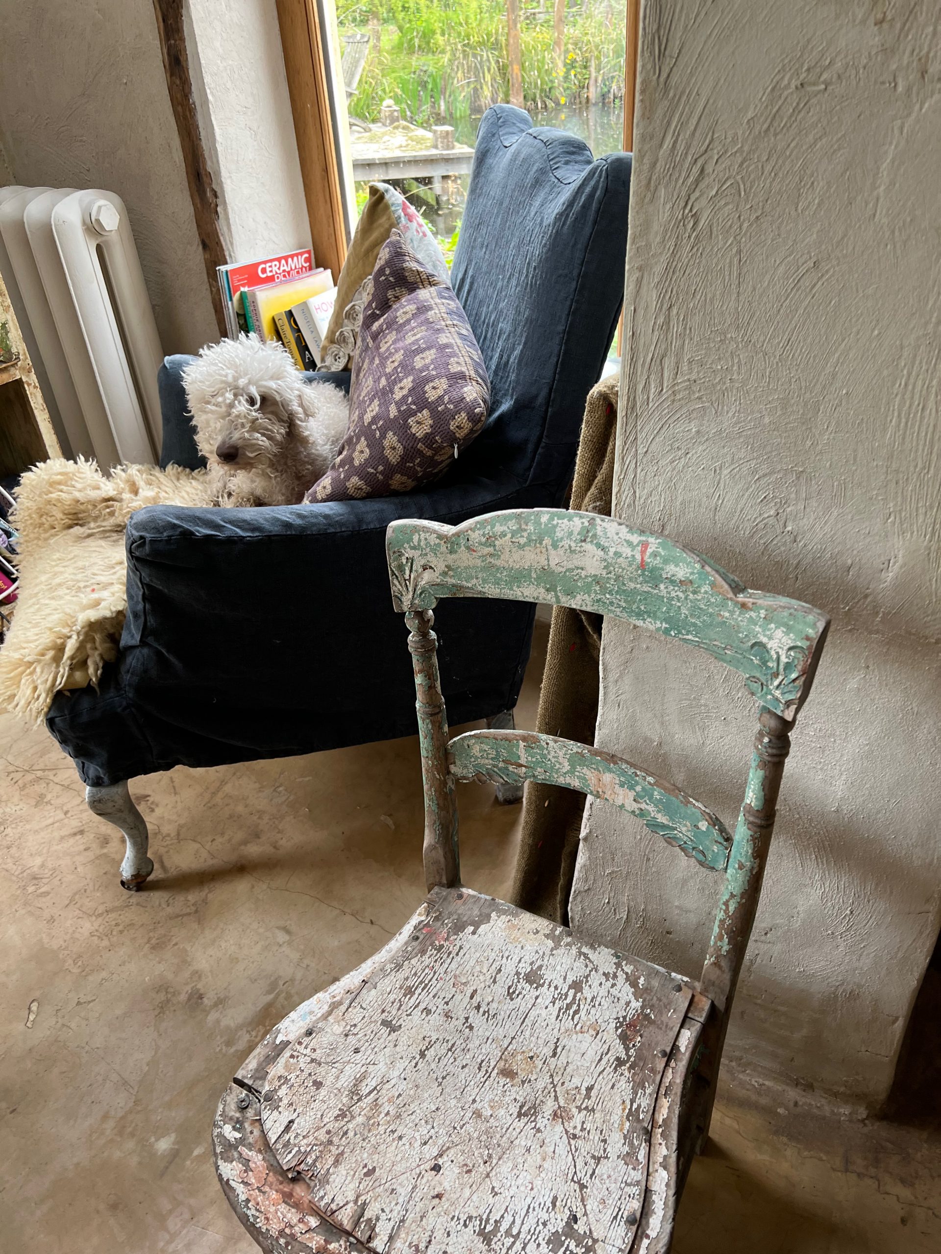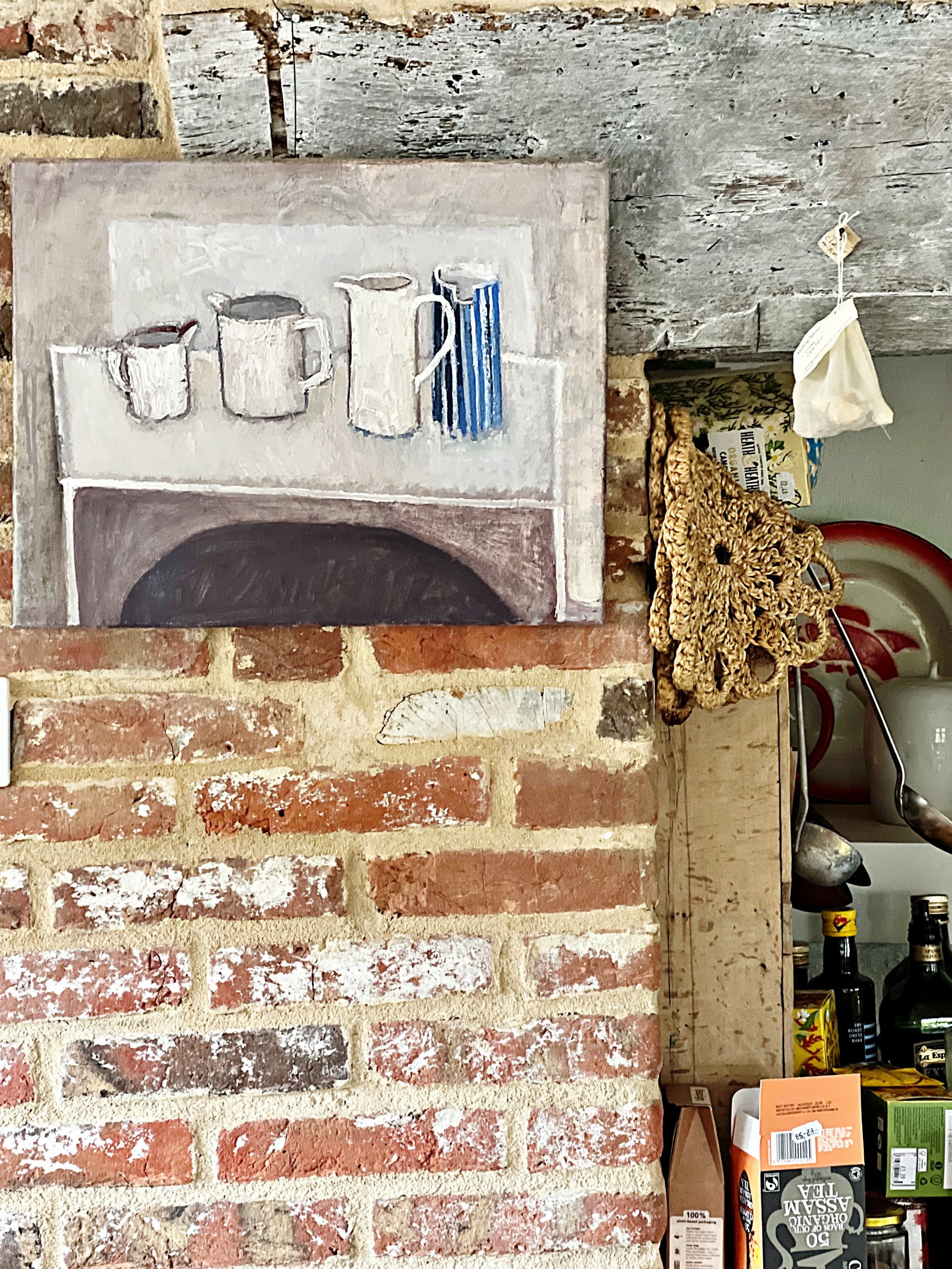Her pottery and paintings are thick and rustic, in clotted cream colours and pastels. She’s made every lampshade. She has an electric aga, converted from gas, upon which she makes endless cups of tea, which we drink from large terracotta cups in slip shades of ivory and white. It’s very House and Garden but better than that because the style is not bought, it’s made.