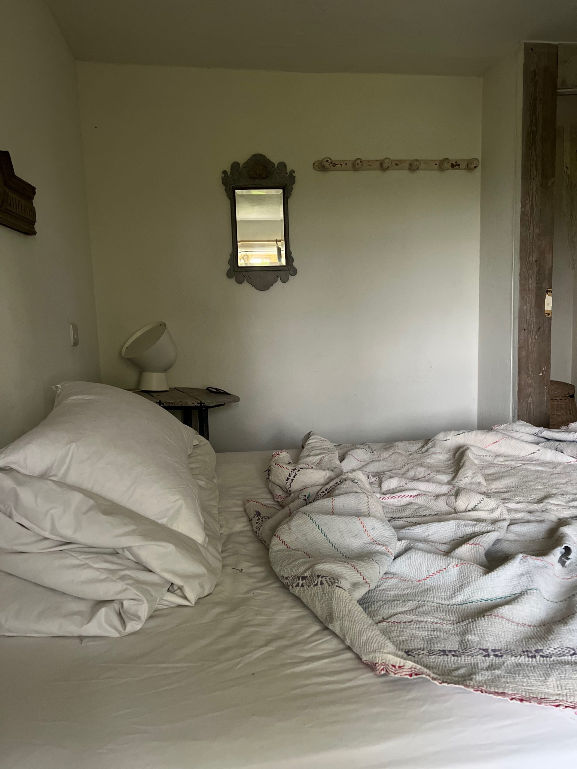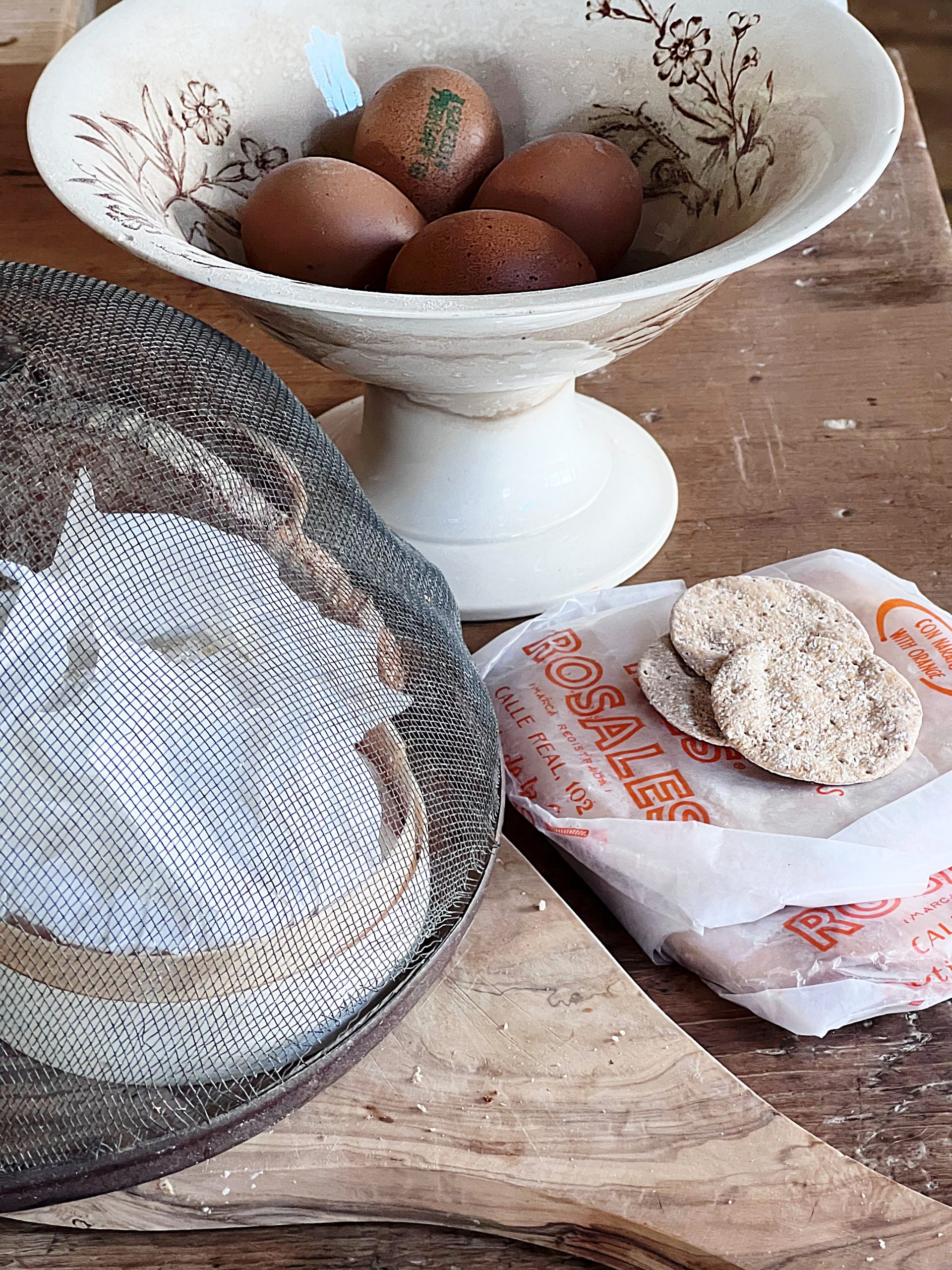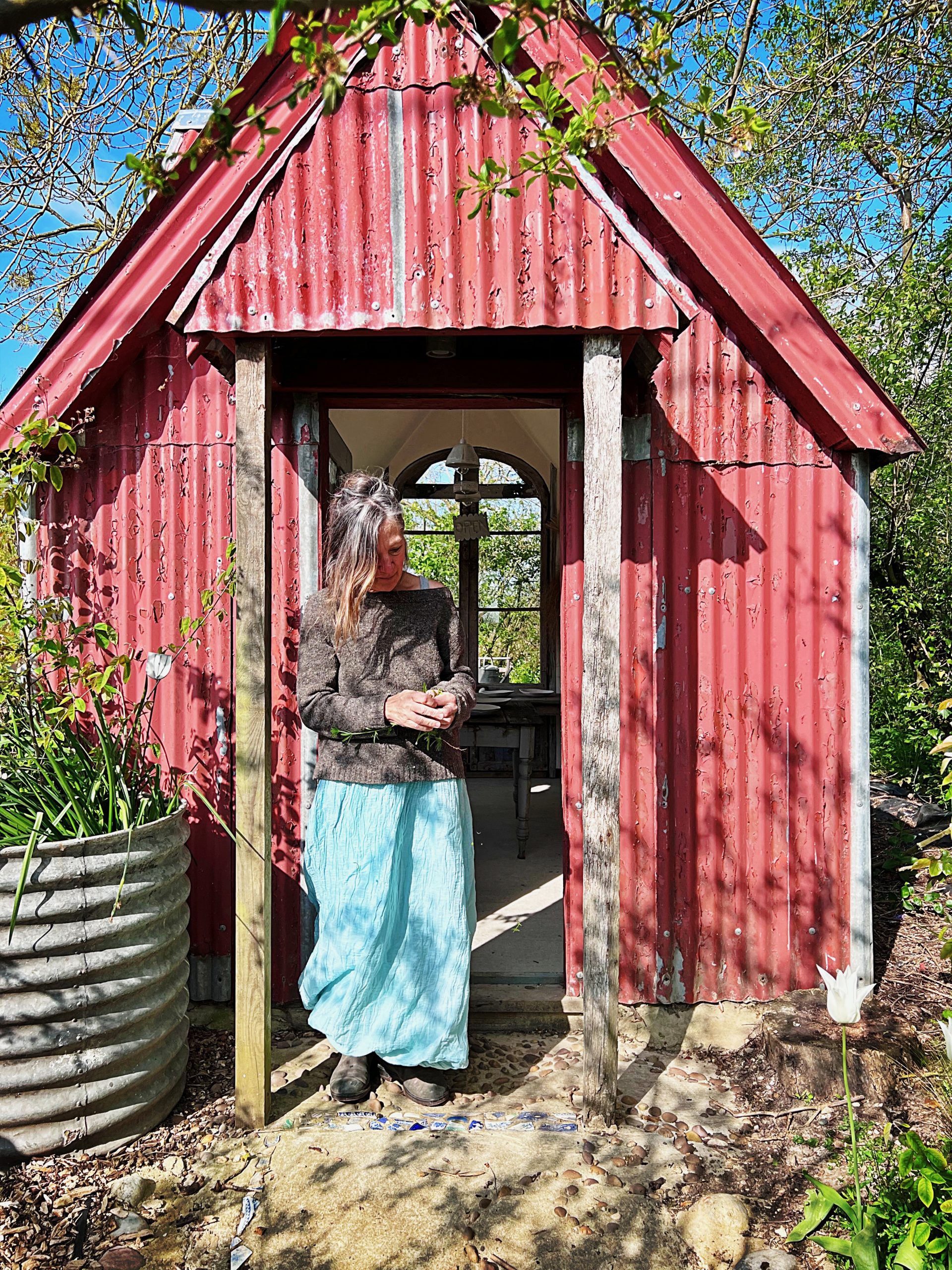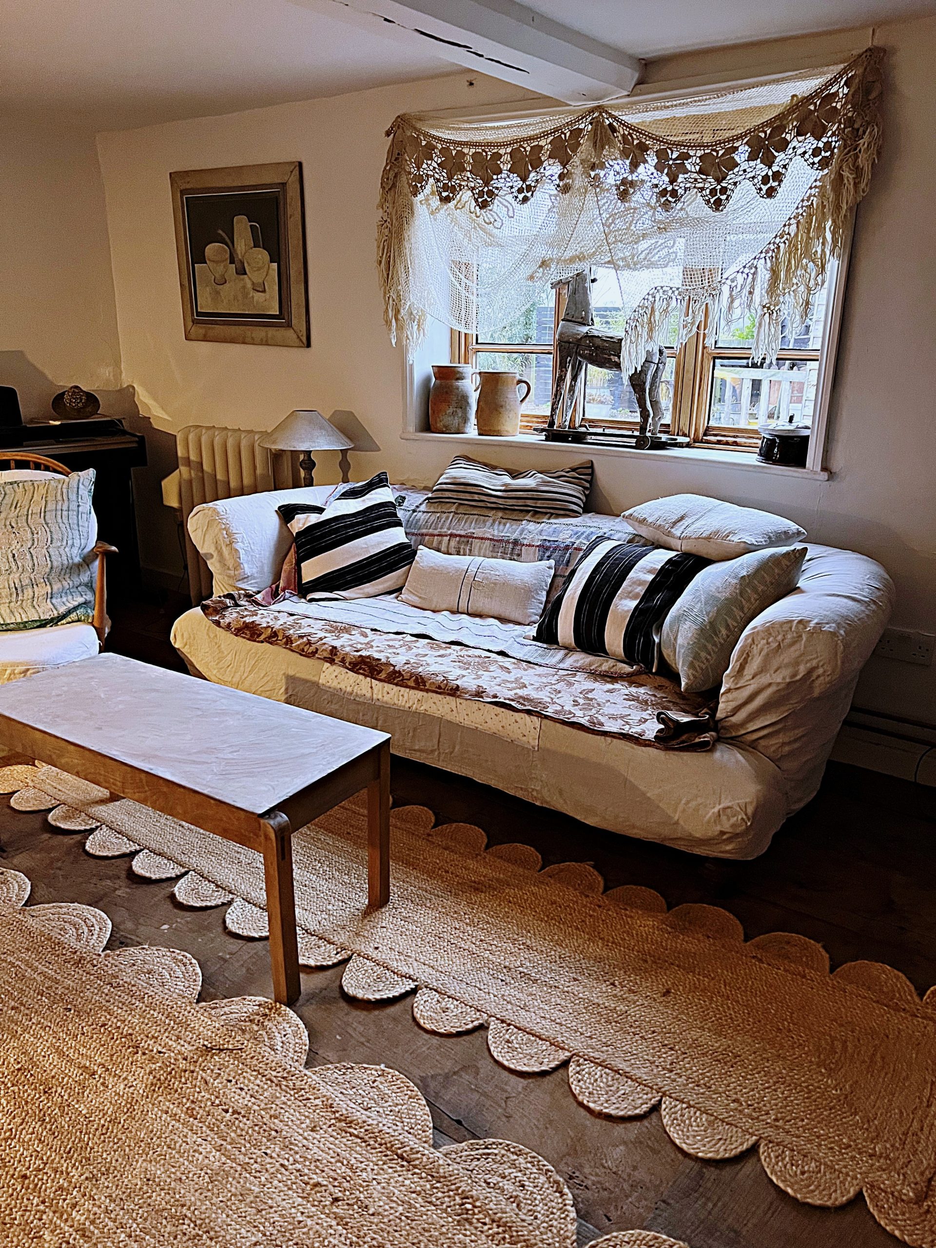 Her pottery and paintings are thick and rustic, in clotted cream colours and pastels. She’s made every lampshade. She has an electric aga, converted from gas, upon which she makes endless cups of tea, which we drink from large terracotta cups in slip shades of ivory and white. It’s very House and Garden but better than that because the style is not bought, it’s made.