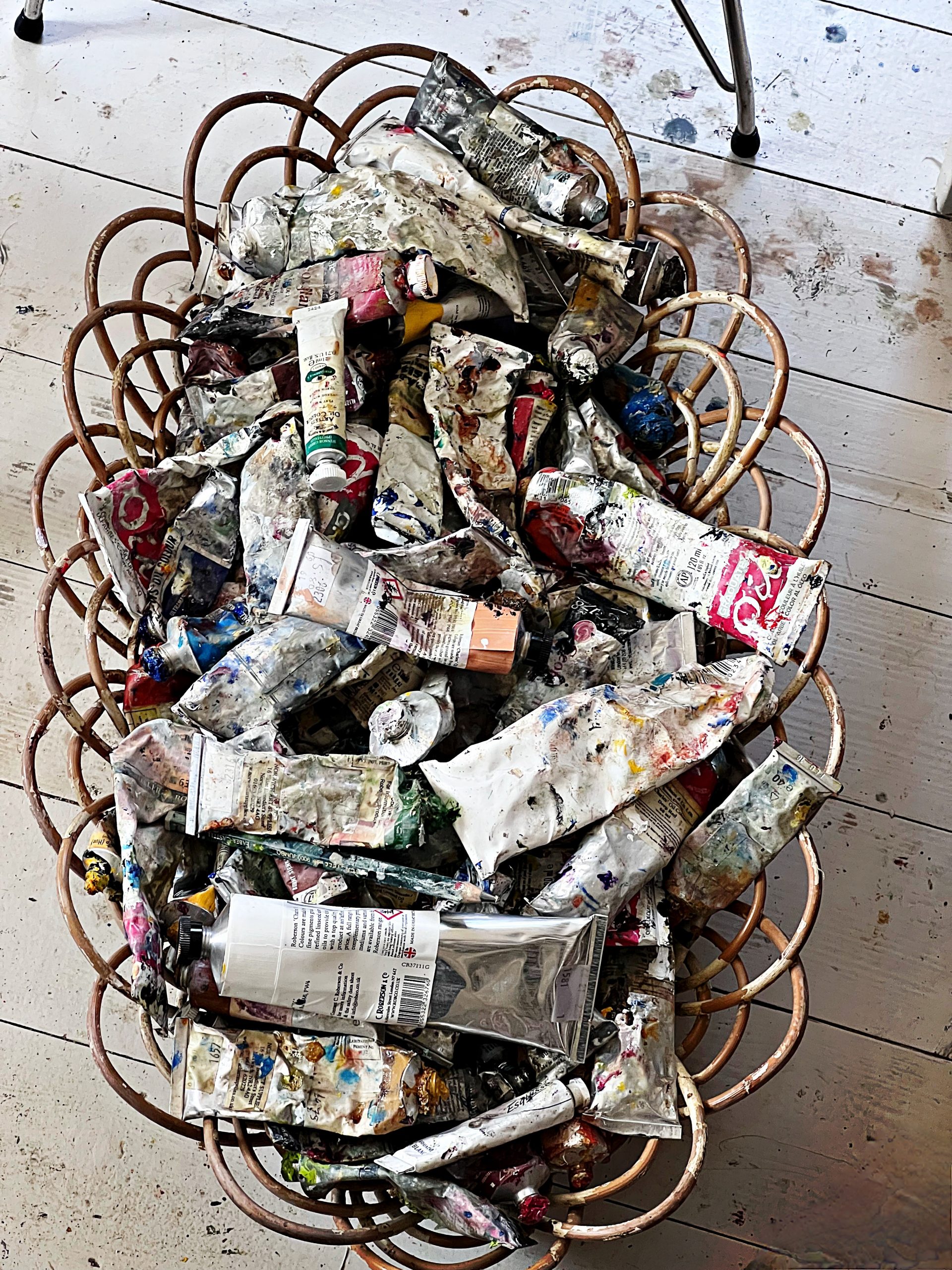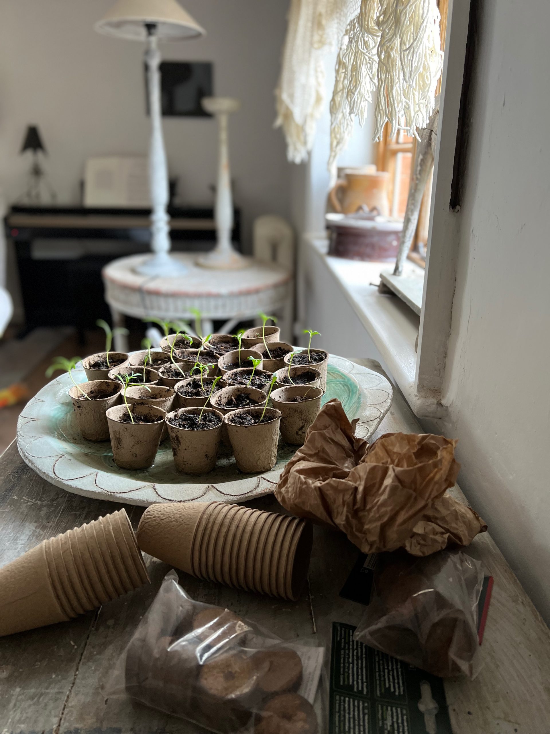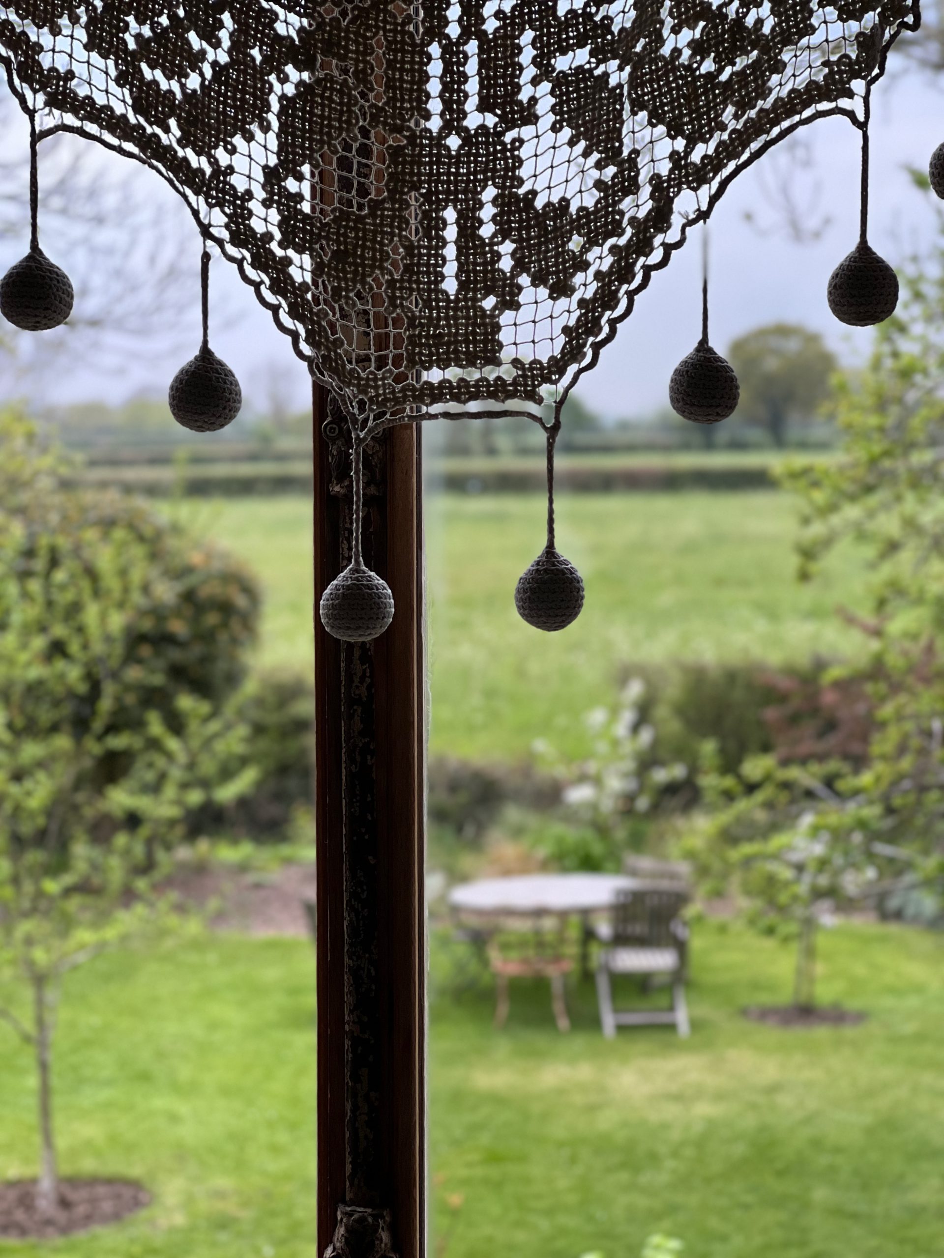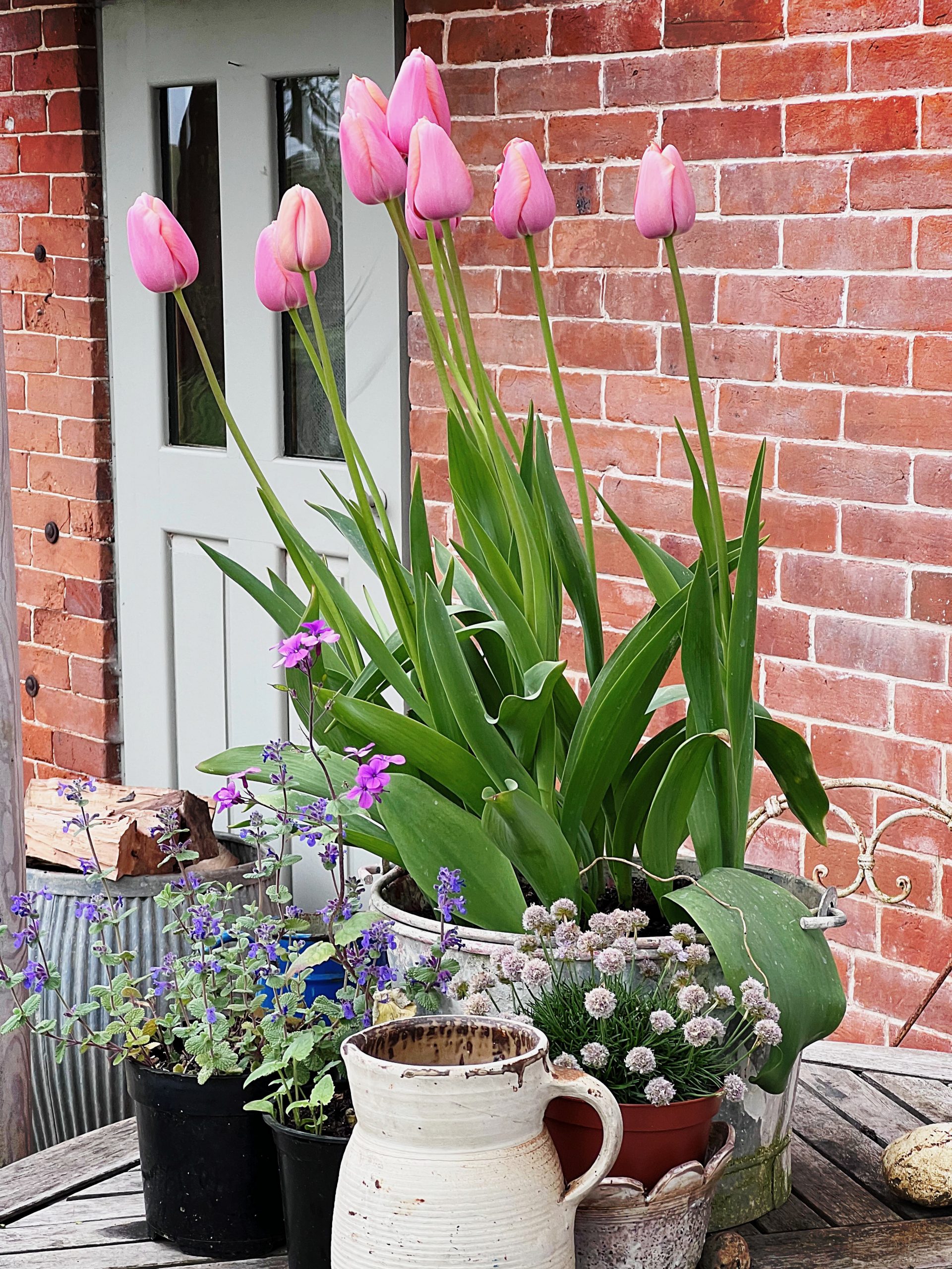 Her pottery and paintings are thick and rustic, in clotted cream colours and pastels. She’s made every lampshade. She has an electric aga, converted from gas, upon which she makes endless cups of tea, which we drink from large terracotta cups in slip shades of ivory and white. It’s very House and Garden but better than that because the style is not bought, it’s made.