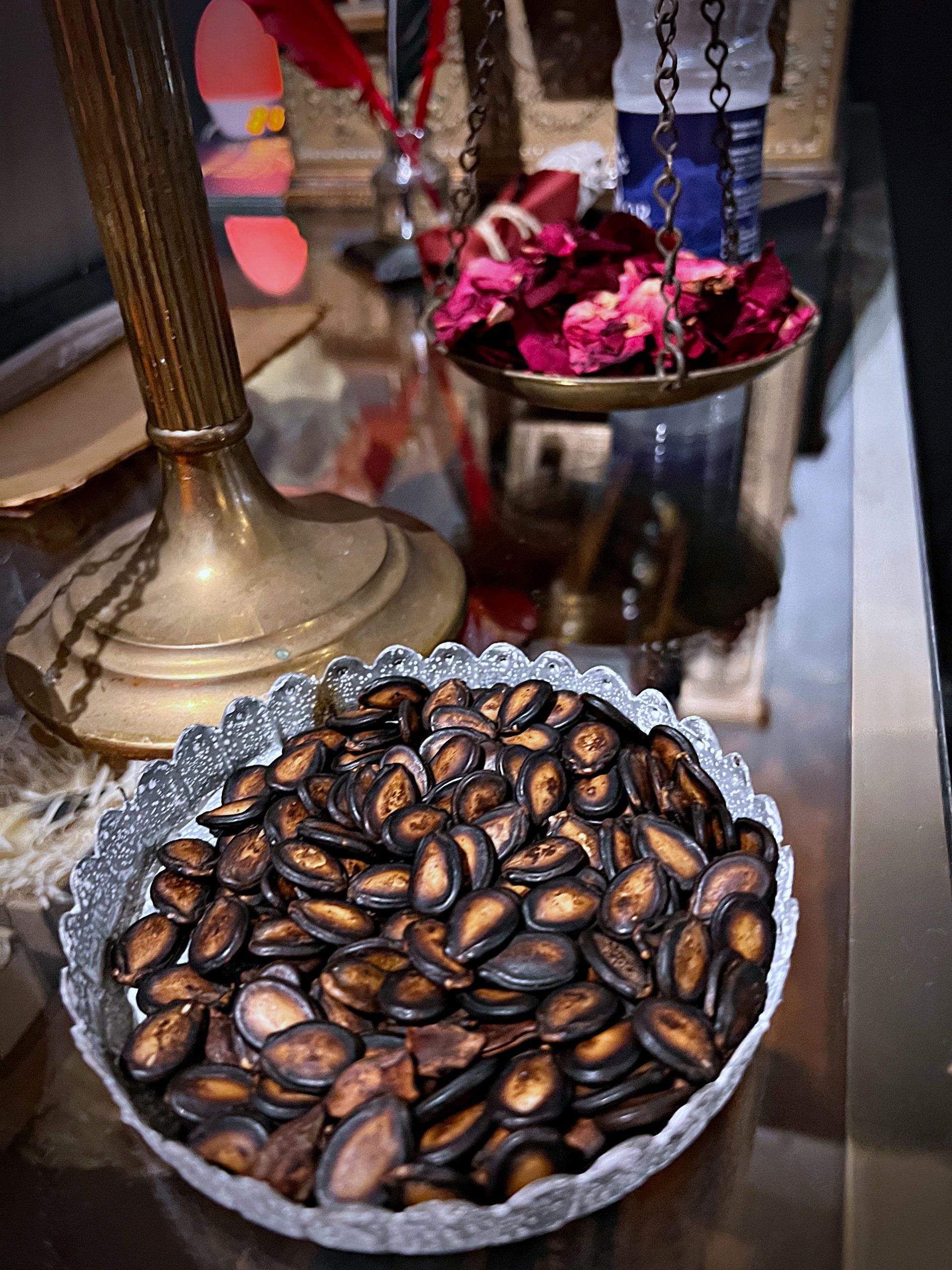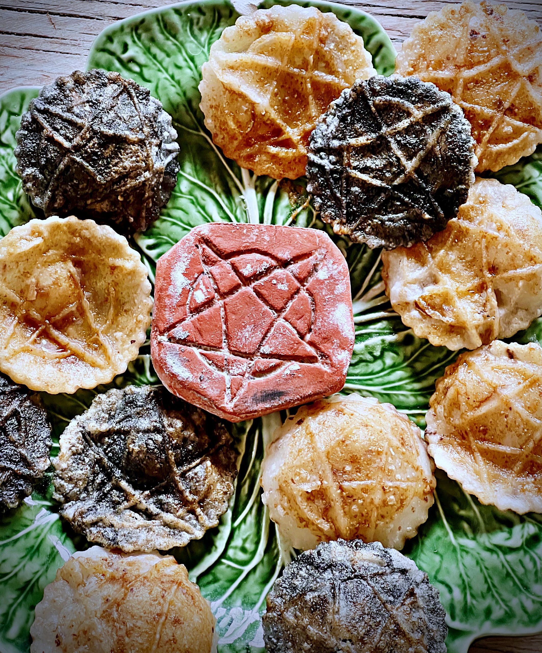 I tested the rice cracker recipe multiple times and wasn’t that happy with it, whether baked or fried. I even made the pentagram moulds from terracotta clay. Eventually I used Vietnamese black sesame rice crackers which I fried and broke into ‘horardric’ shards, seasoning with seaweed salt.