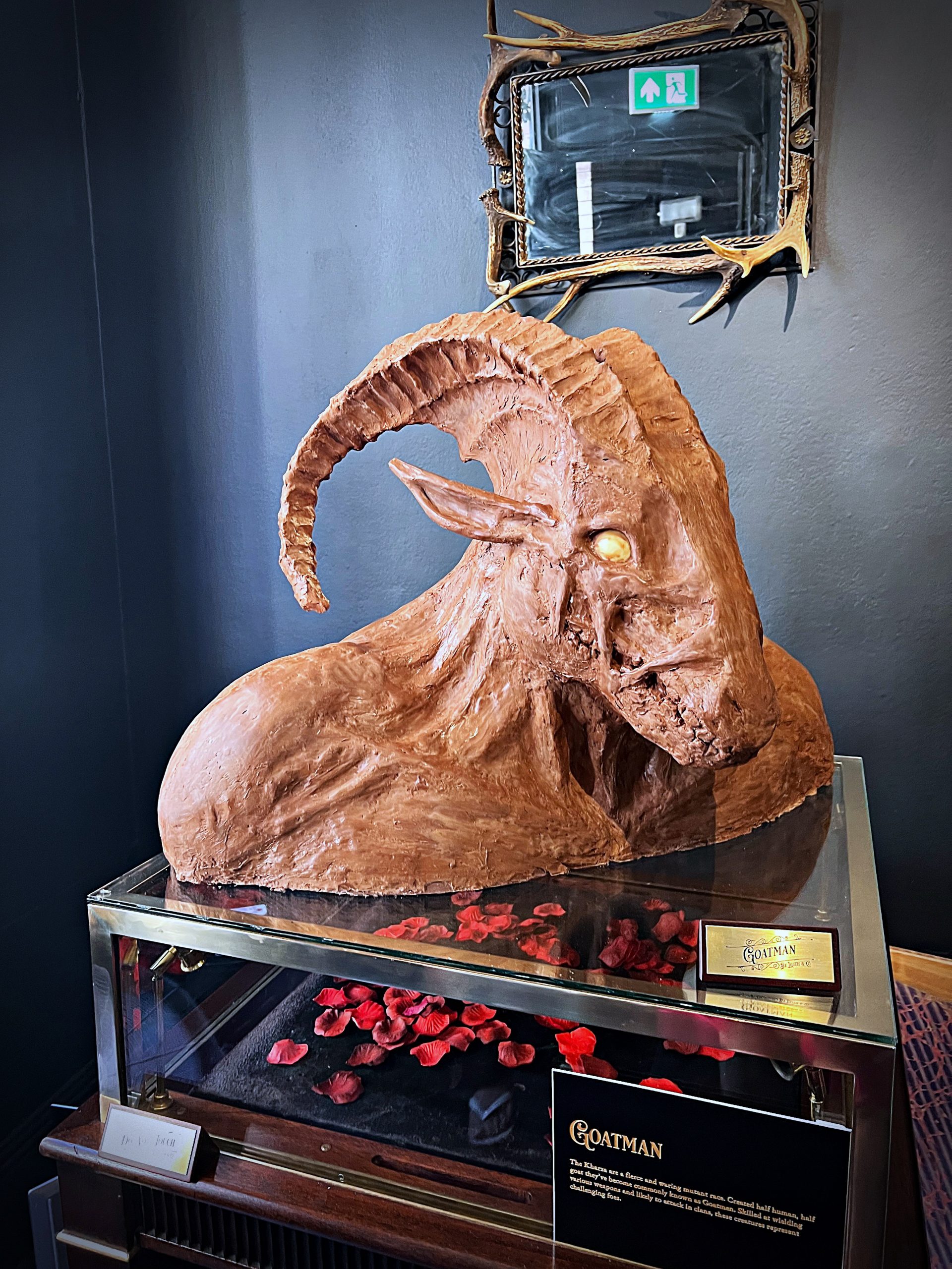 The venue, a chocolate shop called Lilith & Co, had been redecorated in dark colours for the launch party. Made by celebrated chocolatier, Sarah Harding life-size white chocolate skulls, swords and weapons were in glass cases. A giant demonic head turned out to be made of milk chocolate, and a huge horizontal figure with its guts spilling out was also chocolate. They looked so realistic.