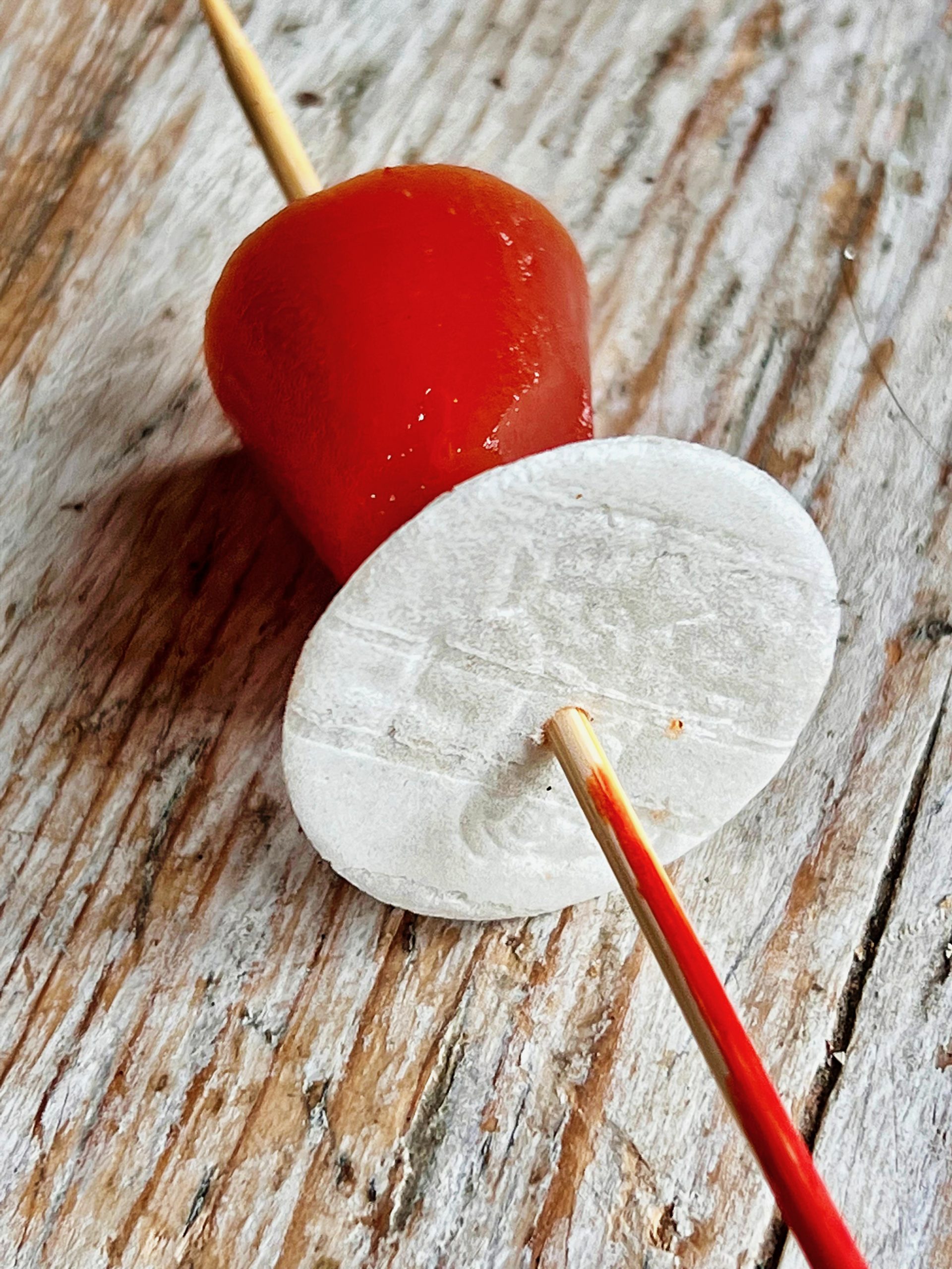 Everything took hours to make. For the skulls I found a great silicone mould, and used Violife Epic ‘cheddar’, melted with some oat milk. But it was difficult to fill the moulds via the small hole at the back. It took me two days to make 40. However they tasted delicious, a bit like Dairylea processed cheese. The tiny pickled diablo red pepper were a spicy surprise in the middle.