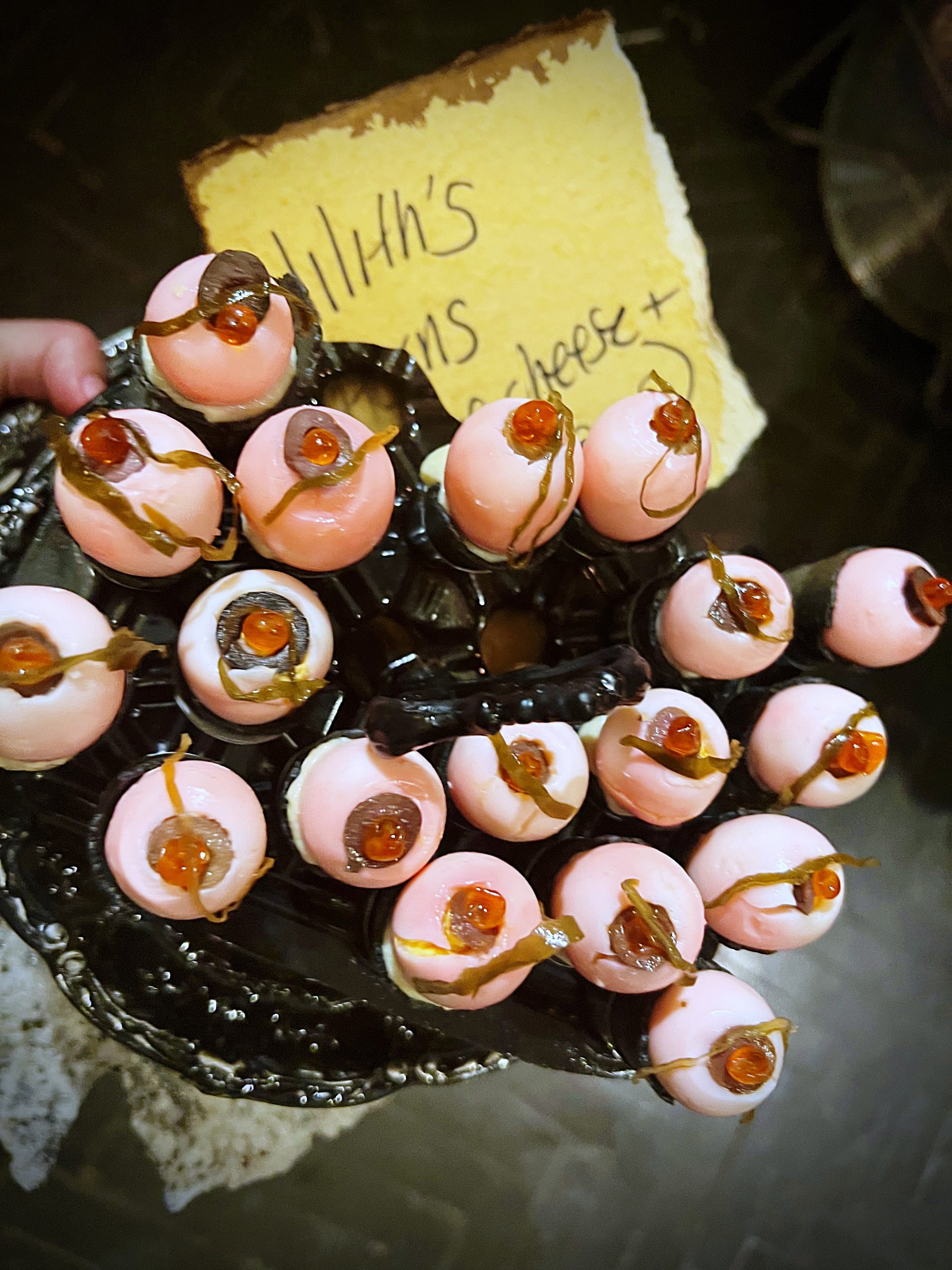 The quail egg eyeballs worked well. I hard-boiled them then after rinsing in cold water I cracked the shells and marinated them in red food colouring. Once you peel off the shell, the red ‘veins’ marbling the eggs were effective.