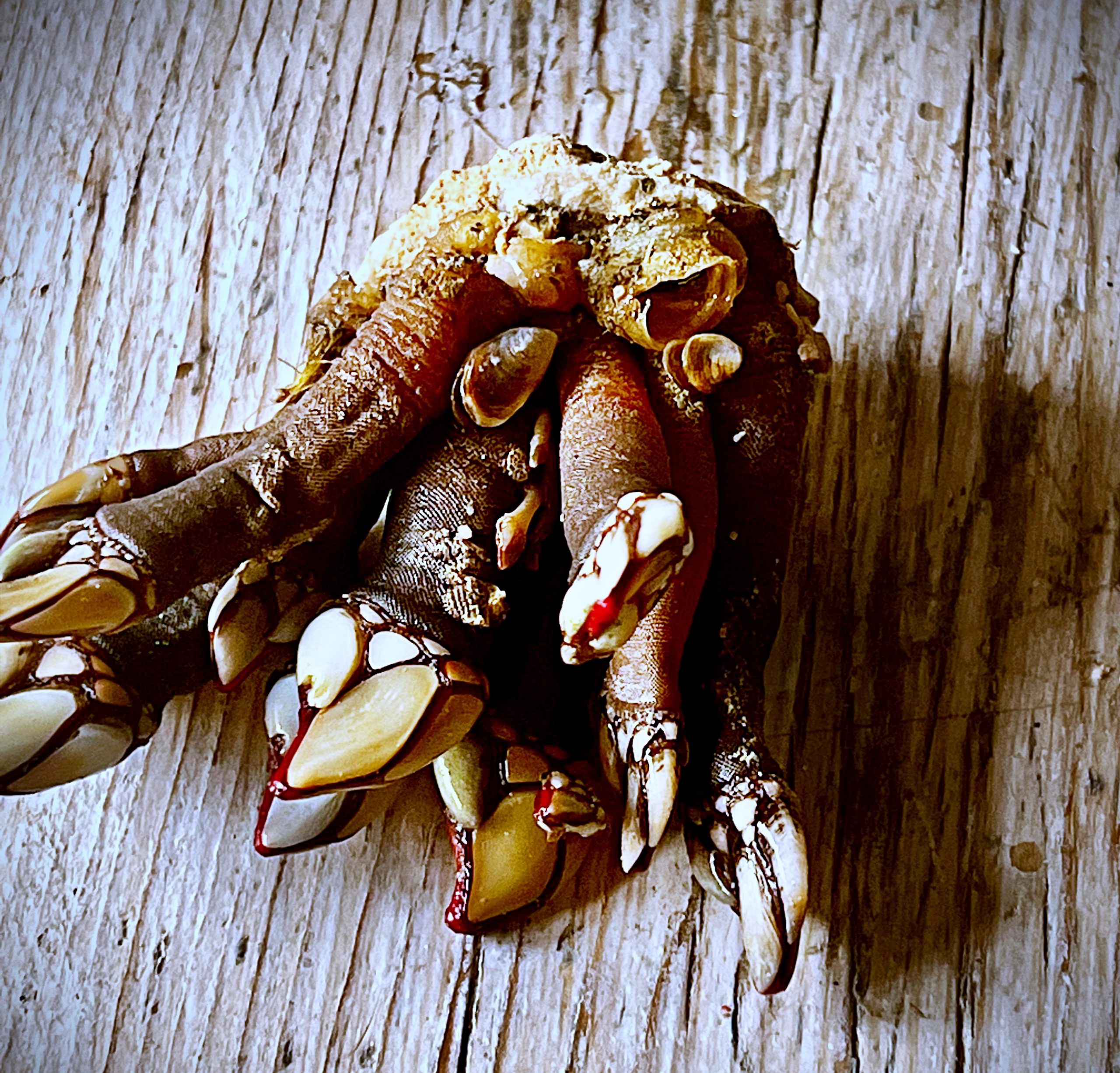 The Bat Nuts were replaced with another weird ingredient: goose neck barnacles or percebes. These are considered a delicacy in France, Spain and Portugal. I saw one in a tapas bar near Jerez de la Frontera – the weirdest thing I’ve ever seen, like a tiny dinosaur’s foot. They are dangerous to collect as people die climbing up cliffs while foraging. They are also very expensive. I imported three kilos from France.