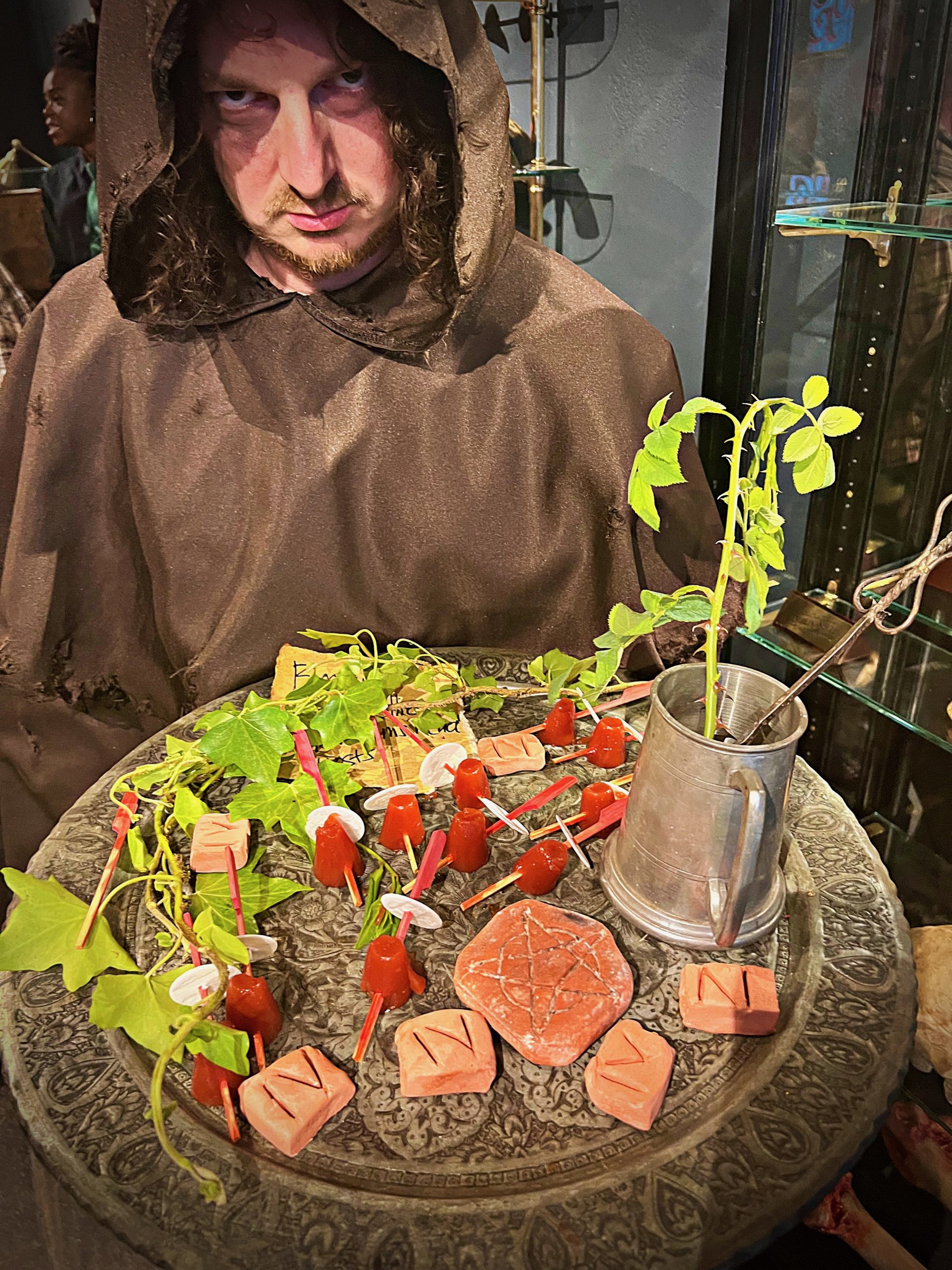 Bloody Mary jellies (in communion cups) with a ram’s head ‘host’ on skewers.
