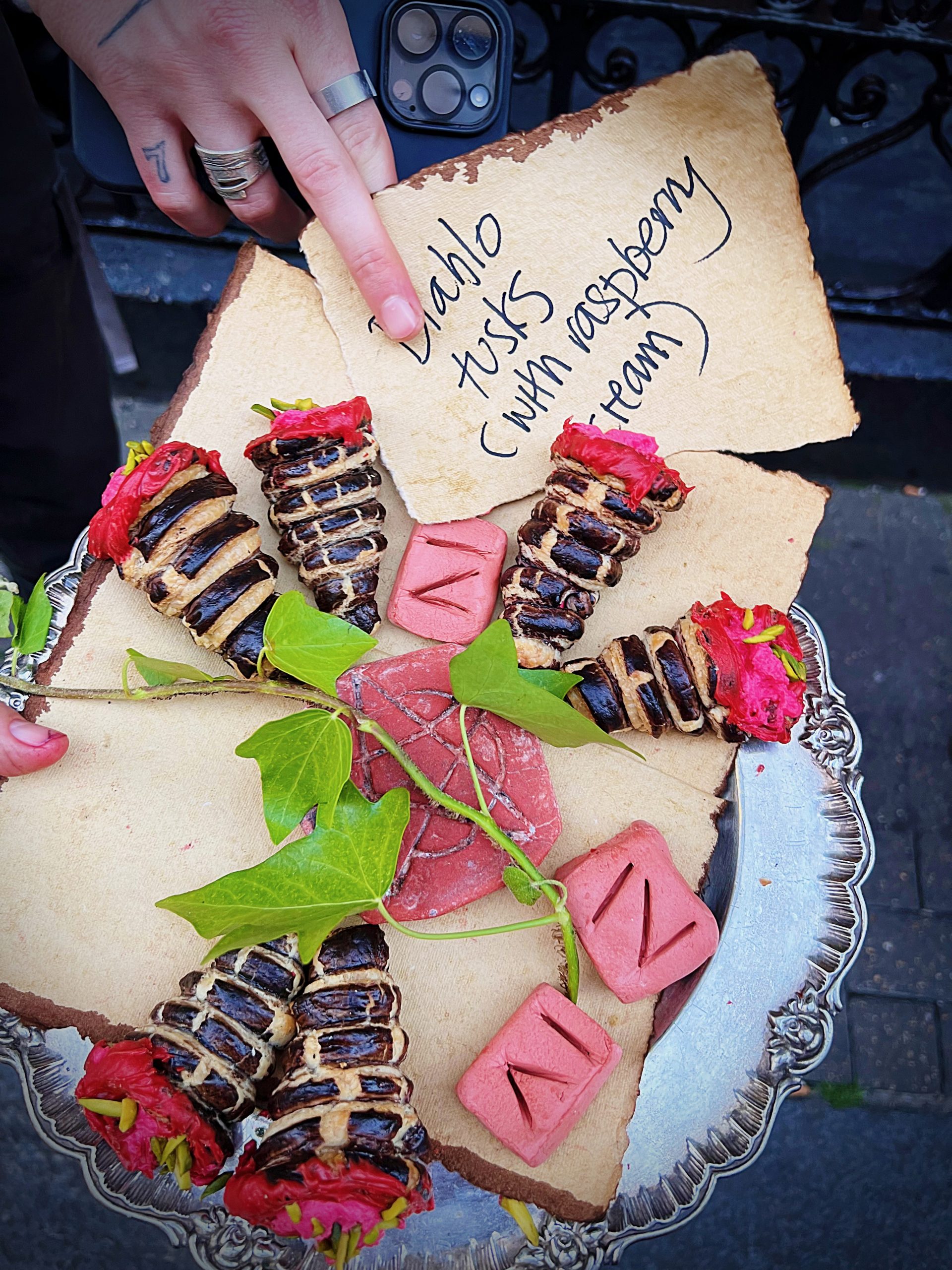 I had a recent commission (only two weeks in advance) to make canapés for the launch of the Diablo IV video game. I’m not a gamer myself, unless you count Wordle or Candy Crush. I looked at all the trailers for the game, and the Wiki page. The vibe is horror, goth, magic, hell, and horns. The main character, Lilith, has rams horns to frame her beautiful face.