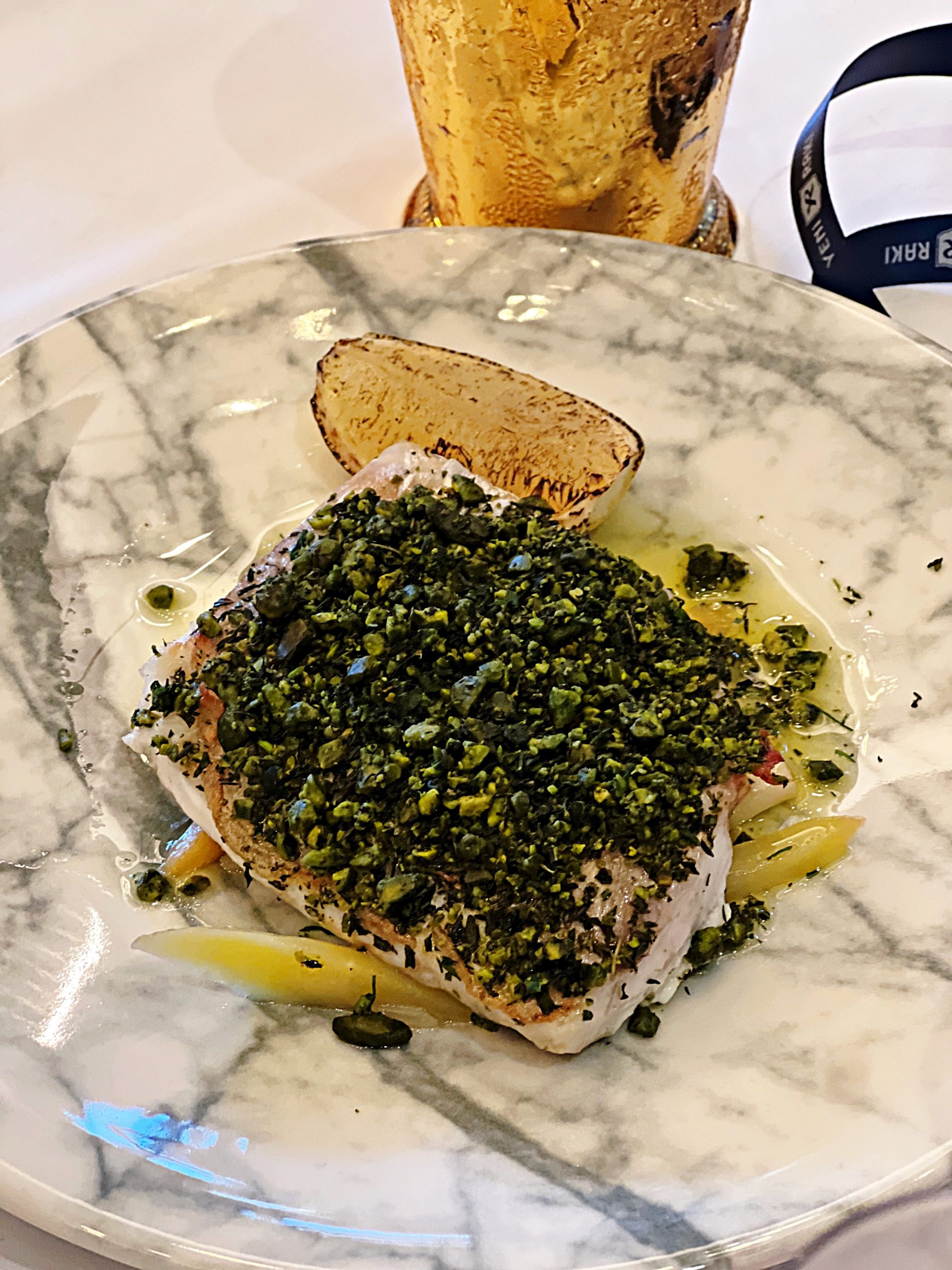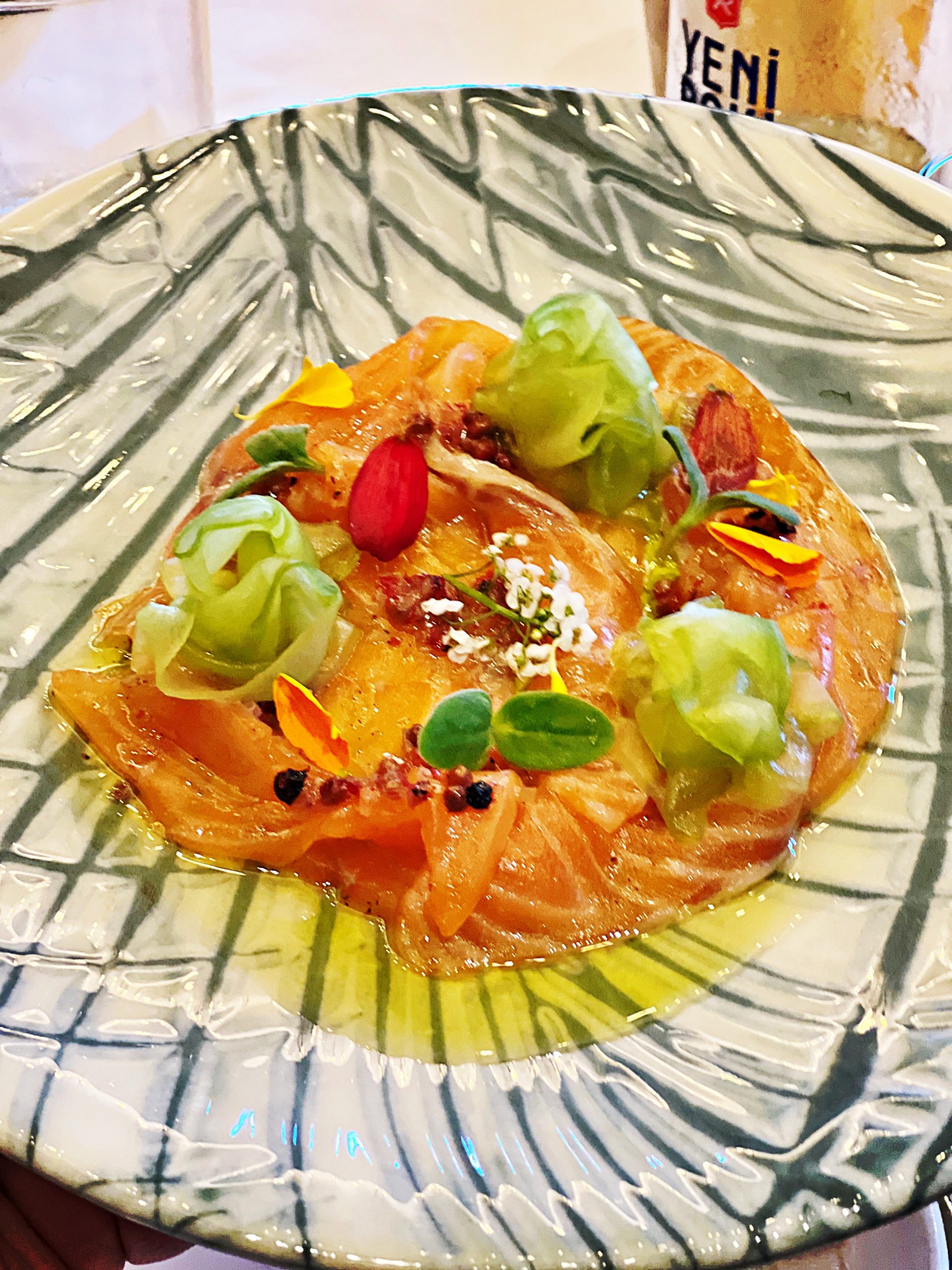 Finally sat at the table, many small dishes were brought out: Turkish spoon salad, with finely chopped tomato, cucumber, herbs and pomegranate seeds; filet of sea bass thickly coated with a crust of pistachios; ‘Antep Fıstıklı Rafik’ a creamed feta, pistachio and goat’s cheese dip; sumac-cured smoked salmon with pink peppercorns; a delicate pistachio pilaf. The only dish I felt clashed with the raki was the truffle barley risotto.