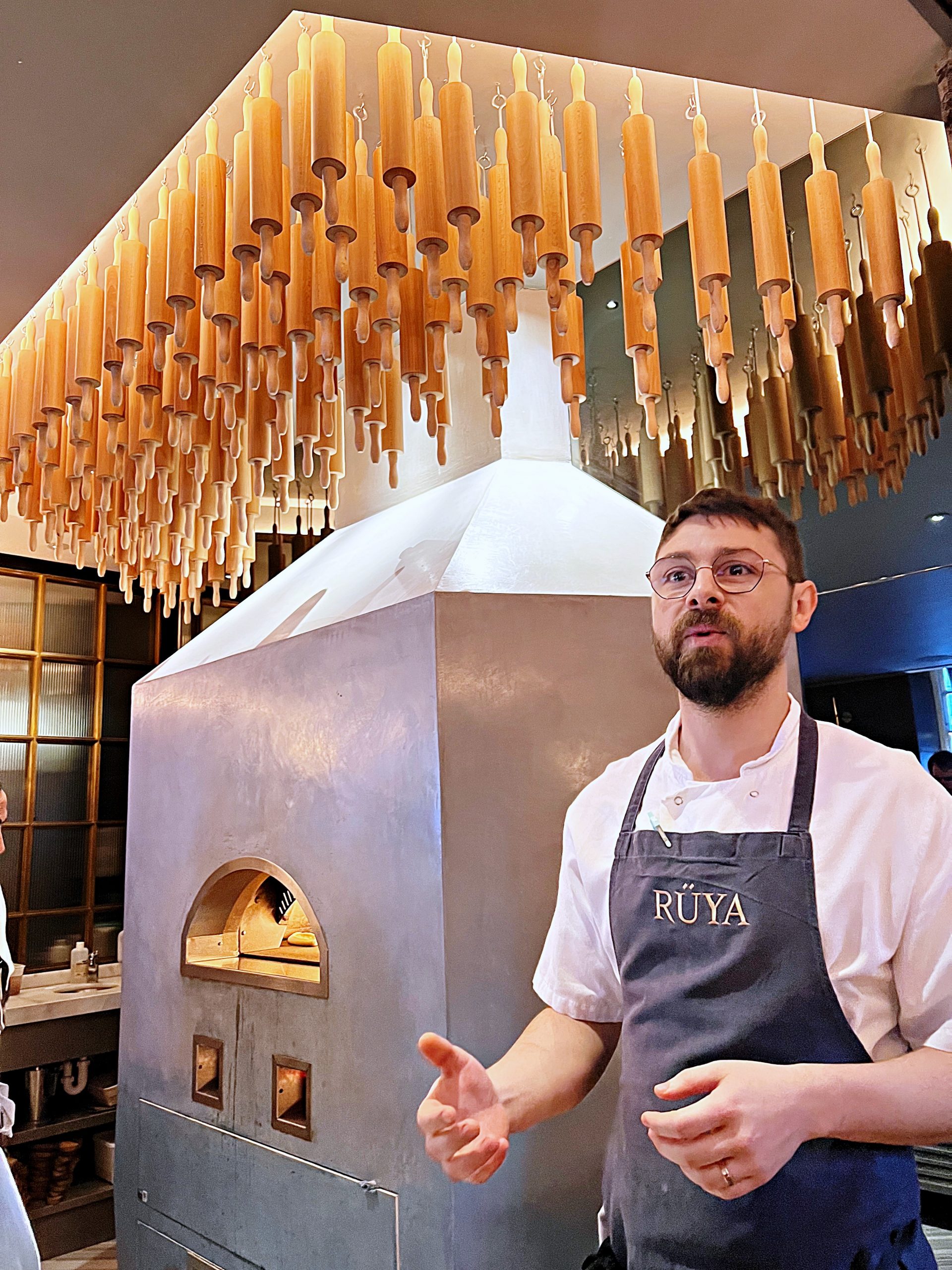 The bar fixed cocktails with expertise. After a refreshing ‘Istan-bull’ cocktail of raki, elderflower, ginger beer and cucumber we gathered around a flaming oven, the ceiling hung with a kind of rolling pin installation, to see a demonstration of Kasar bread making. Pide (or pitta) are the Turkish/Greek words for bread. So when we say pitta bread, we are actually saying bread bread.