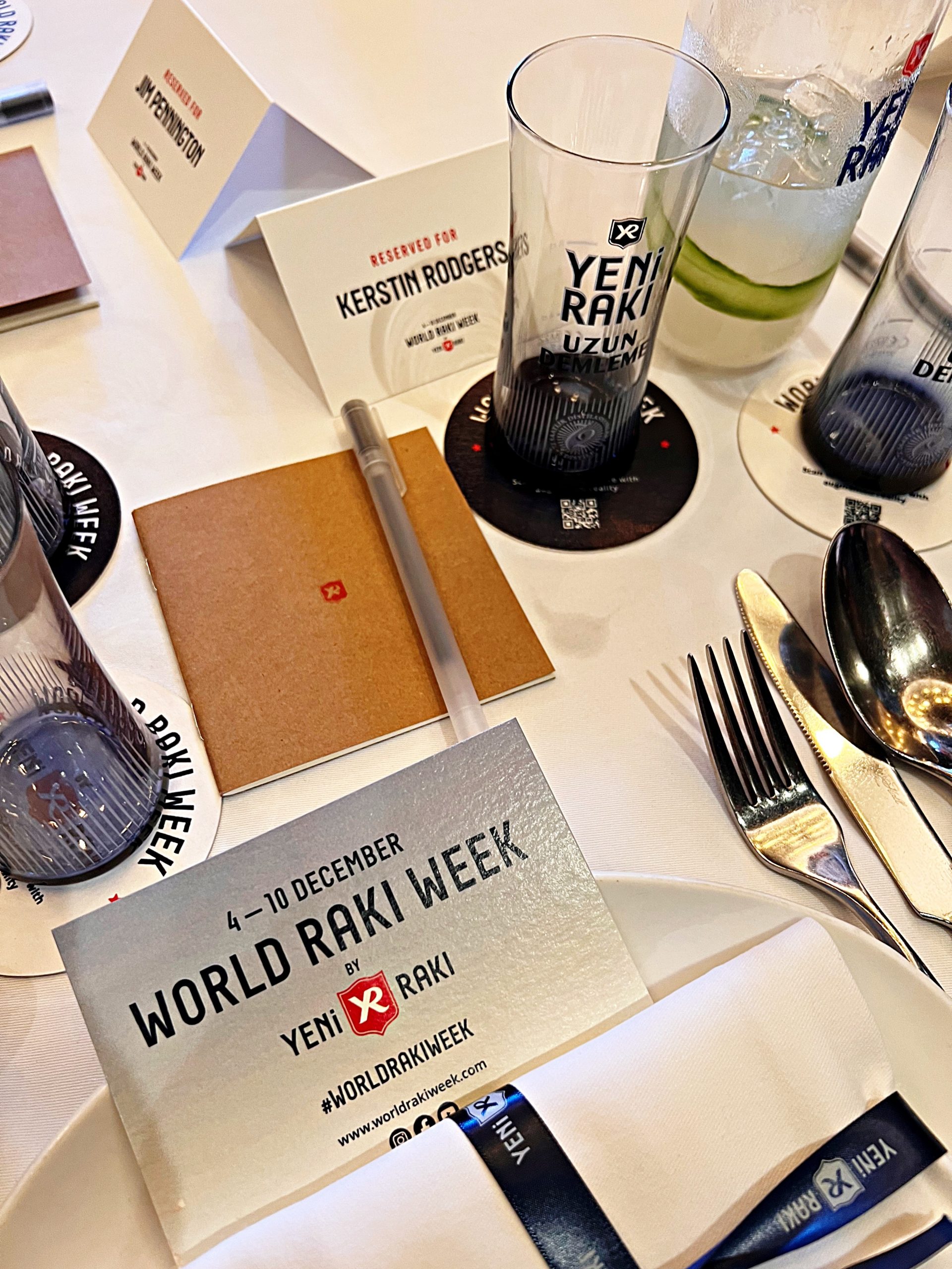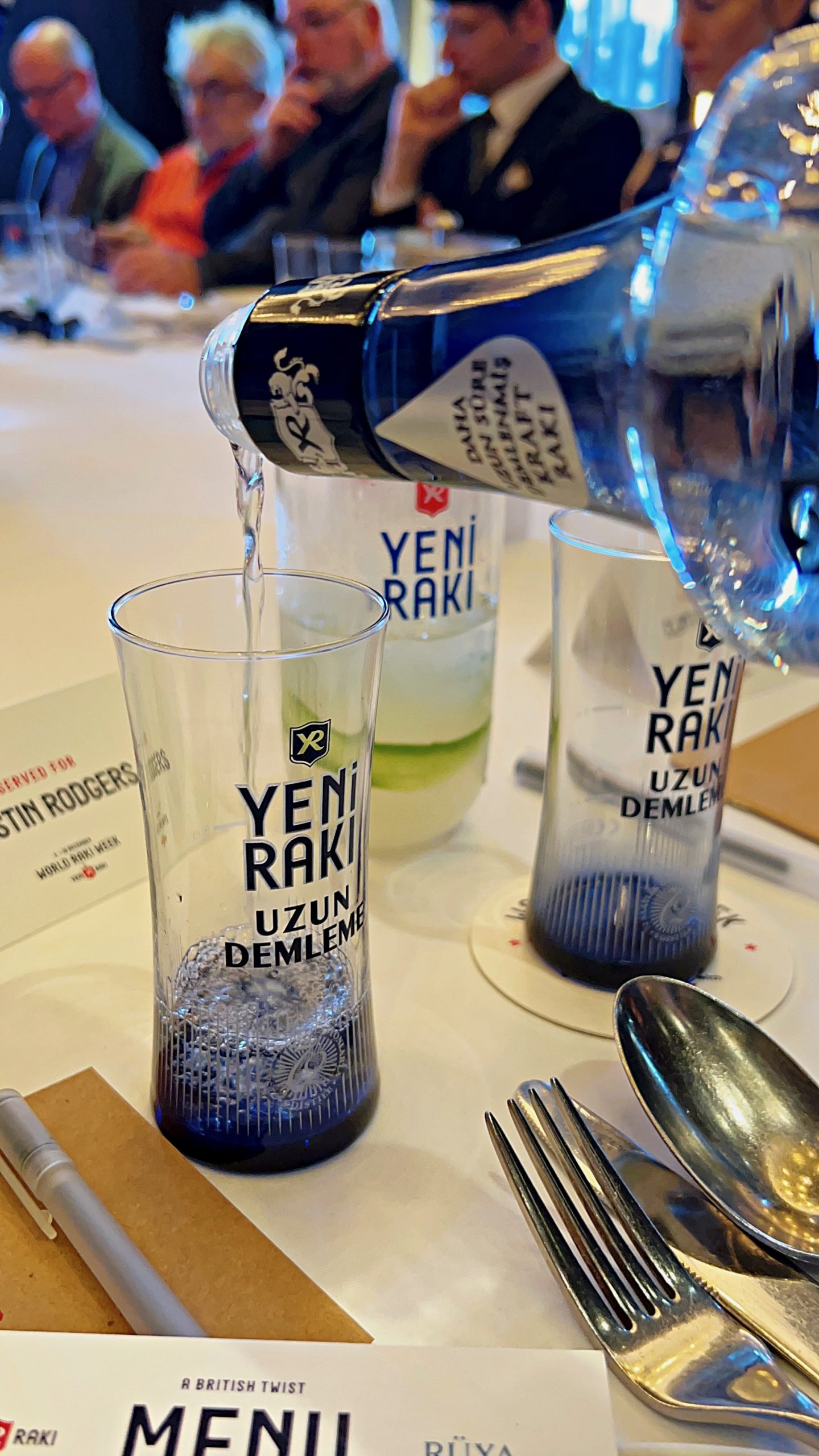 Now Yeni Raki have returned to London, this time to host a meal at Turkish restaurant Ruya near Park Lane. The design of the restaurant is opulent and stylish: copper stills line the walls, tables have turquoise ceramic tops and huge marble amphora are the wash basins in the toilets.