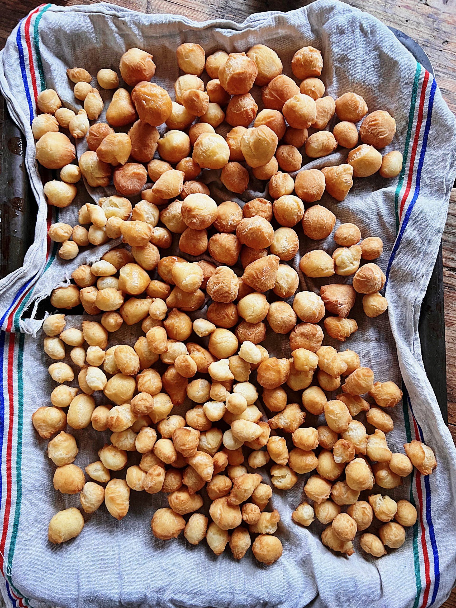 For the last two years I’ve been in Naples just before Christmas. Struffoli is a honey drenched ‘cake’ in the shape of a wreath. I saw large versions in bakeries but also small versions at the celebrated café Pasticceria Popella in the historic centre. I resolved to have a go myself.