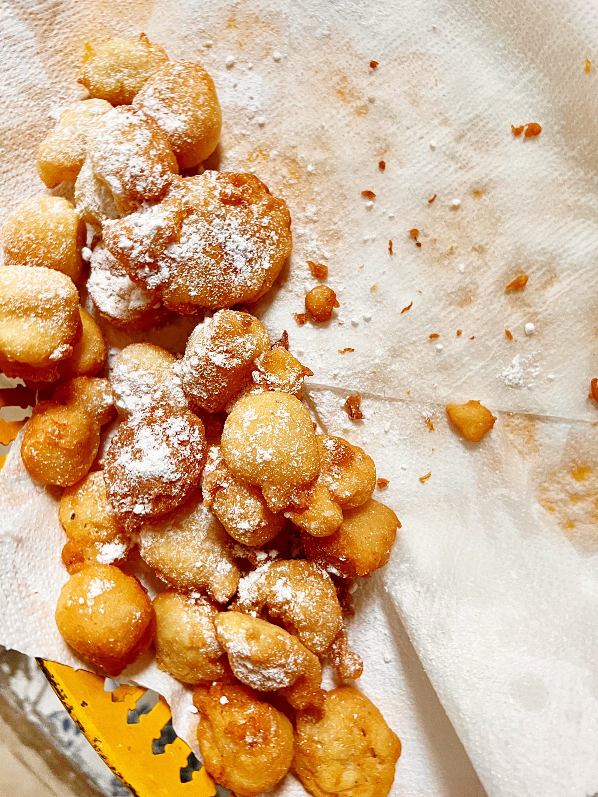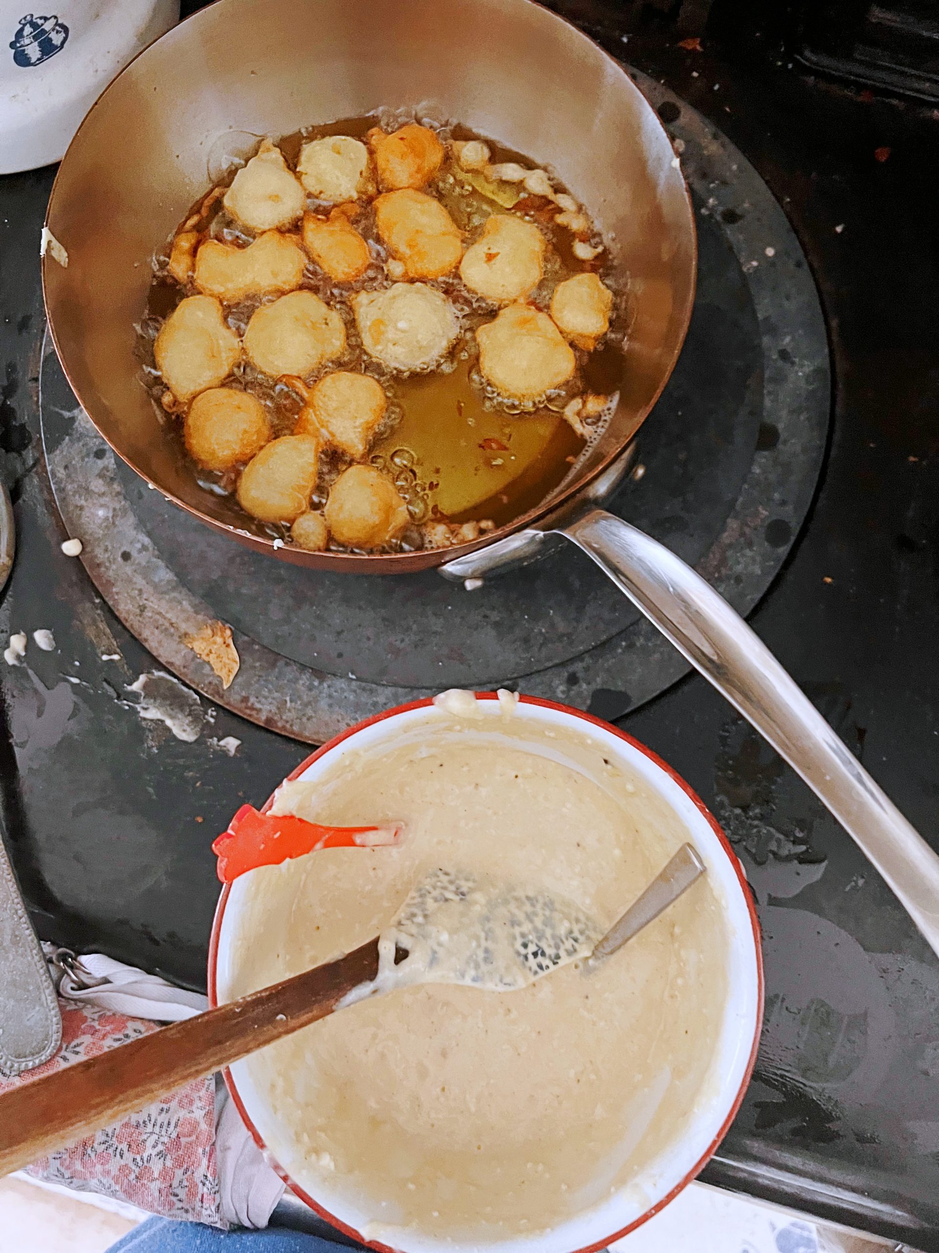 - When the fat is hot enough (use a thermometer), use a tablespoon to drop a ball of batter into the oil. Fry until both sides are light gold and floating.