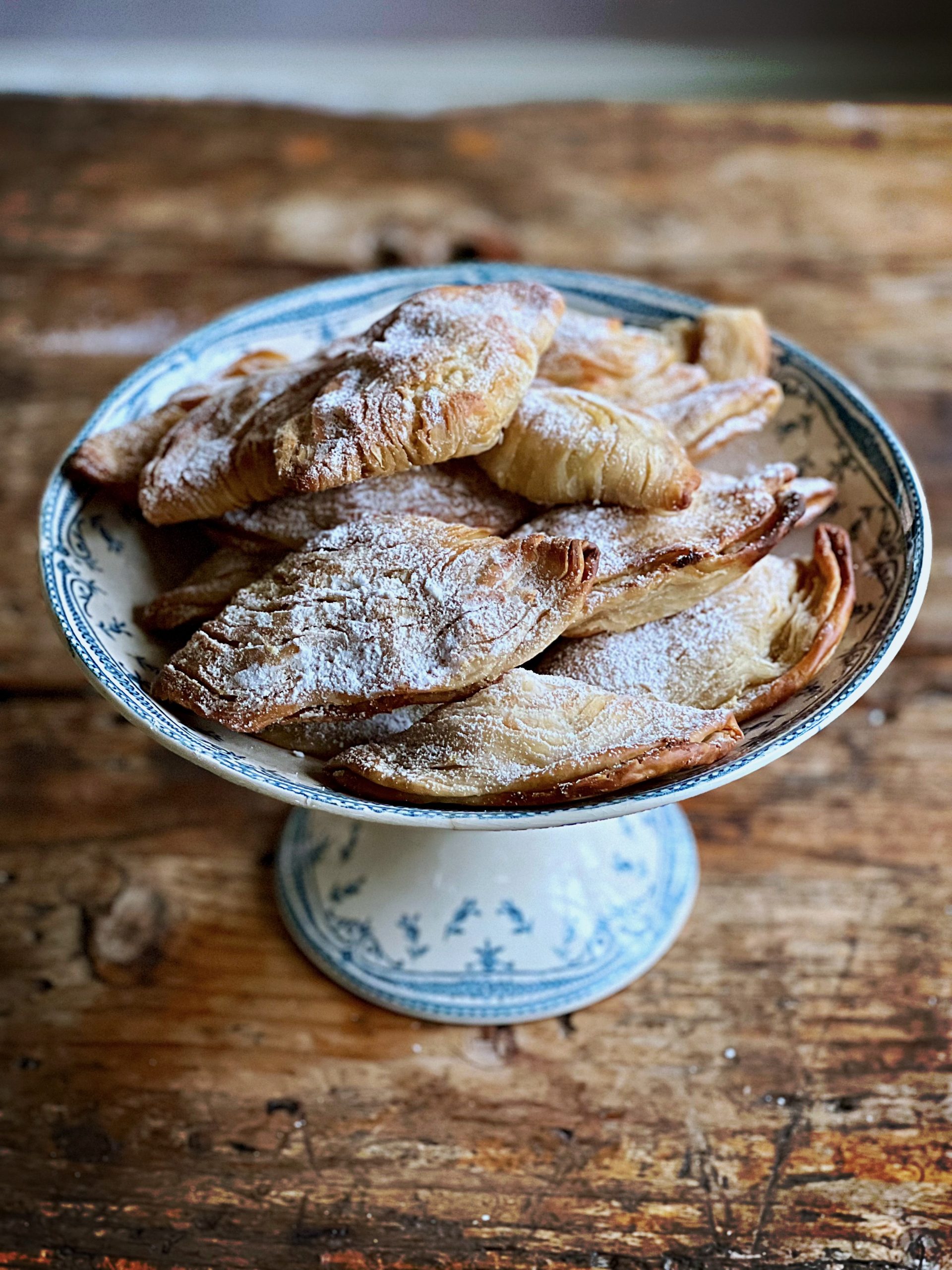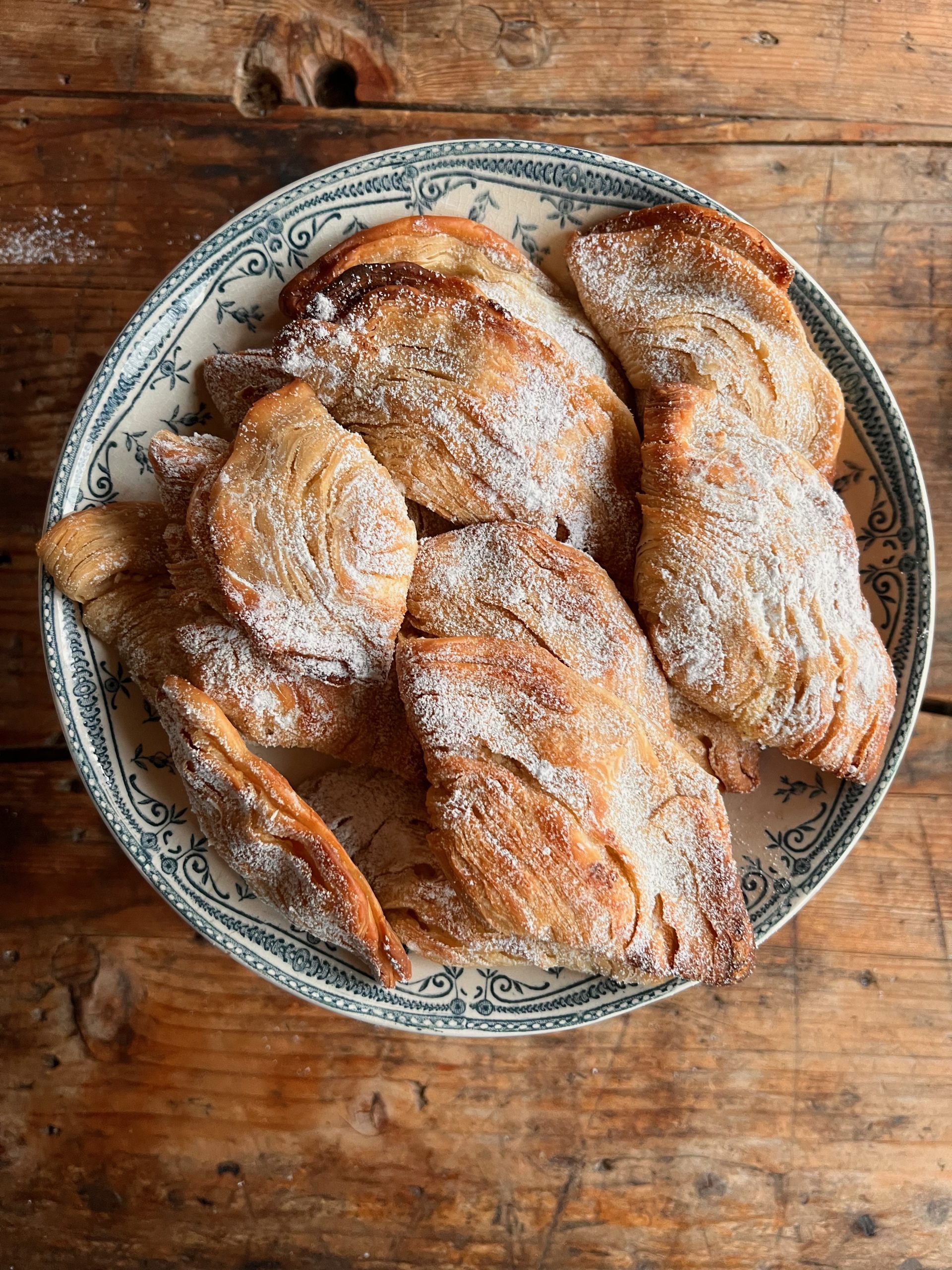 So, on a cold January day in London, I prepared the dough on a long table lined with silpats. I followed a couple of online recipes, but I advise looking at Youtube videos to get a clearer idea. The hardest bit was making the cones. Here I somewhat failed. But not bad for a first attempt. Next time however, I will roll the dough even thinner, or perhaps stretch it out more, and really make sure I butter the doughy layers.