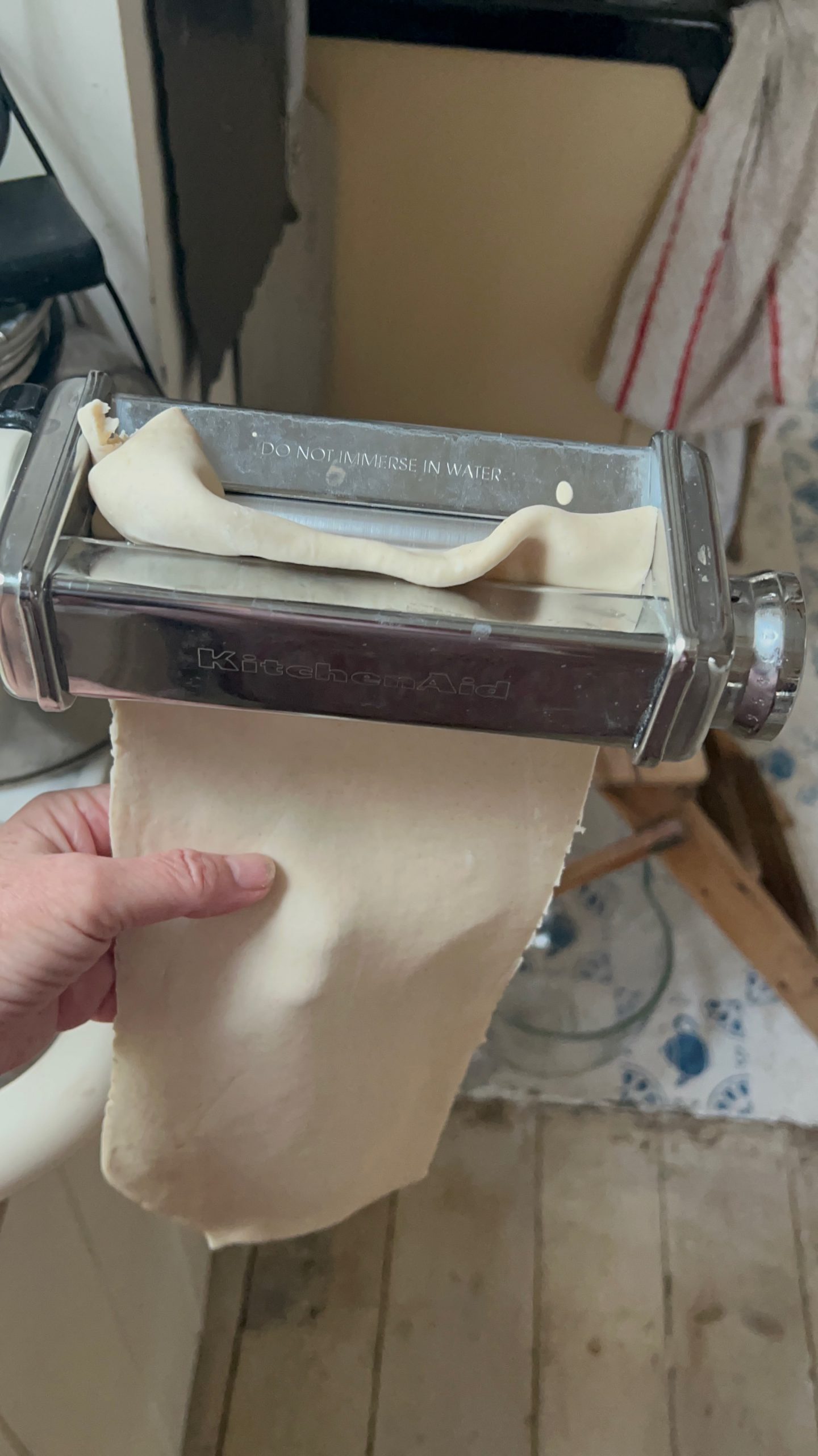- Get out your pasta machine. Prepare a long table with silpats. Or use a rolling pin to roll the dough around loosely. The sections of dough will be very long.