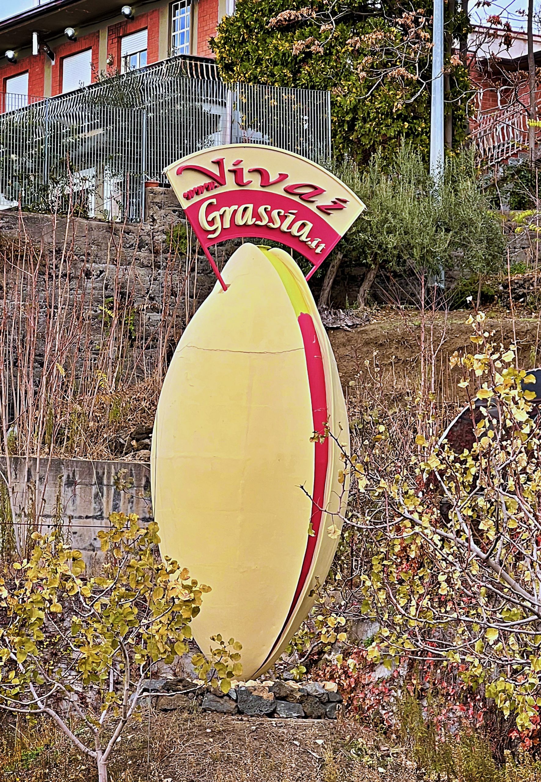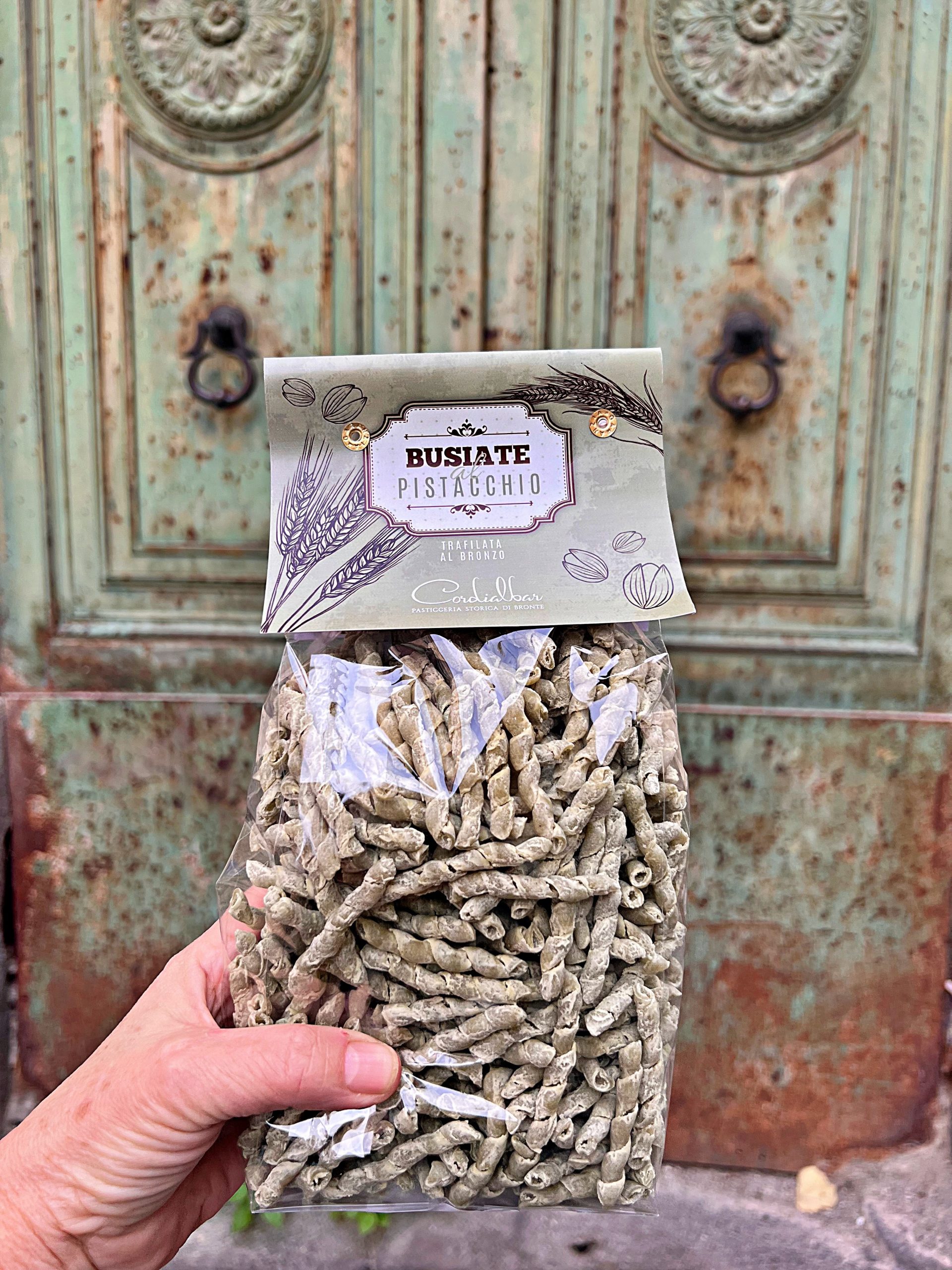 Bronte is the epicentre of the pistachio industry of Sicily. As I drove towards it, winding past a smoking but snow tipped Mount Etna, past the terrible litter, I saw the twisted branches of pistachio tree groves. Just before the sign into town, there is a giant pistachio.