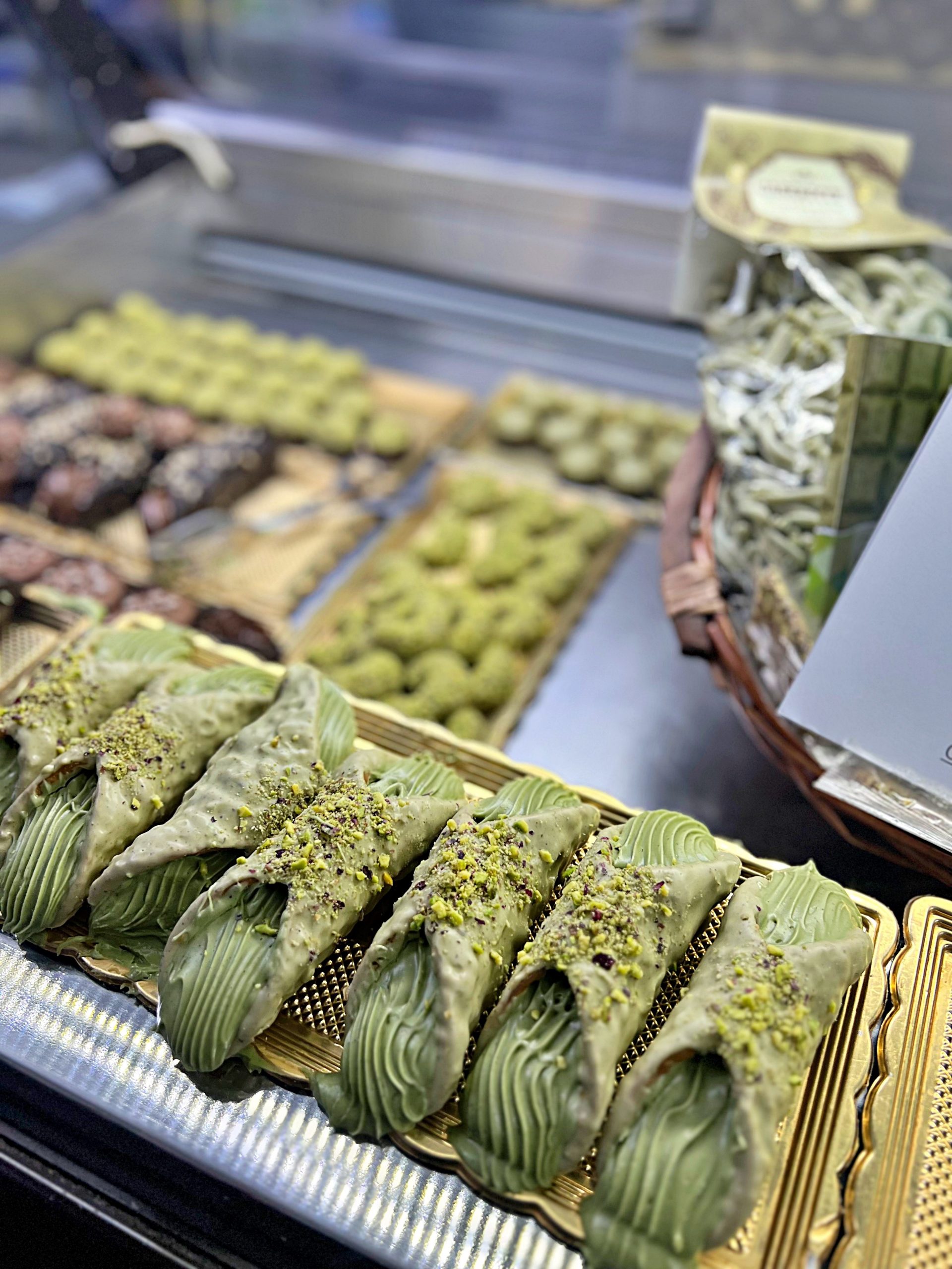 I got there on a Sunday so probably didn’t see Bronte in all its pale green splendour but I visited a bakery that sold pistachio pasta, pistachio cannoli, pistachio liqueur, pistachio pesto, pistachio gelato, pistachio ‘nutella’, pistachio chocolate and a pistachio panettone. Other cafés sell pistachio crépes for instance. I reckon virtually every food is available in pistachio flavour or with a pistachio crust. Bronte is considered to have the best pistachios in the world, and are a PDO, a protected designation of origin.