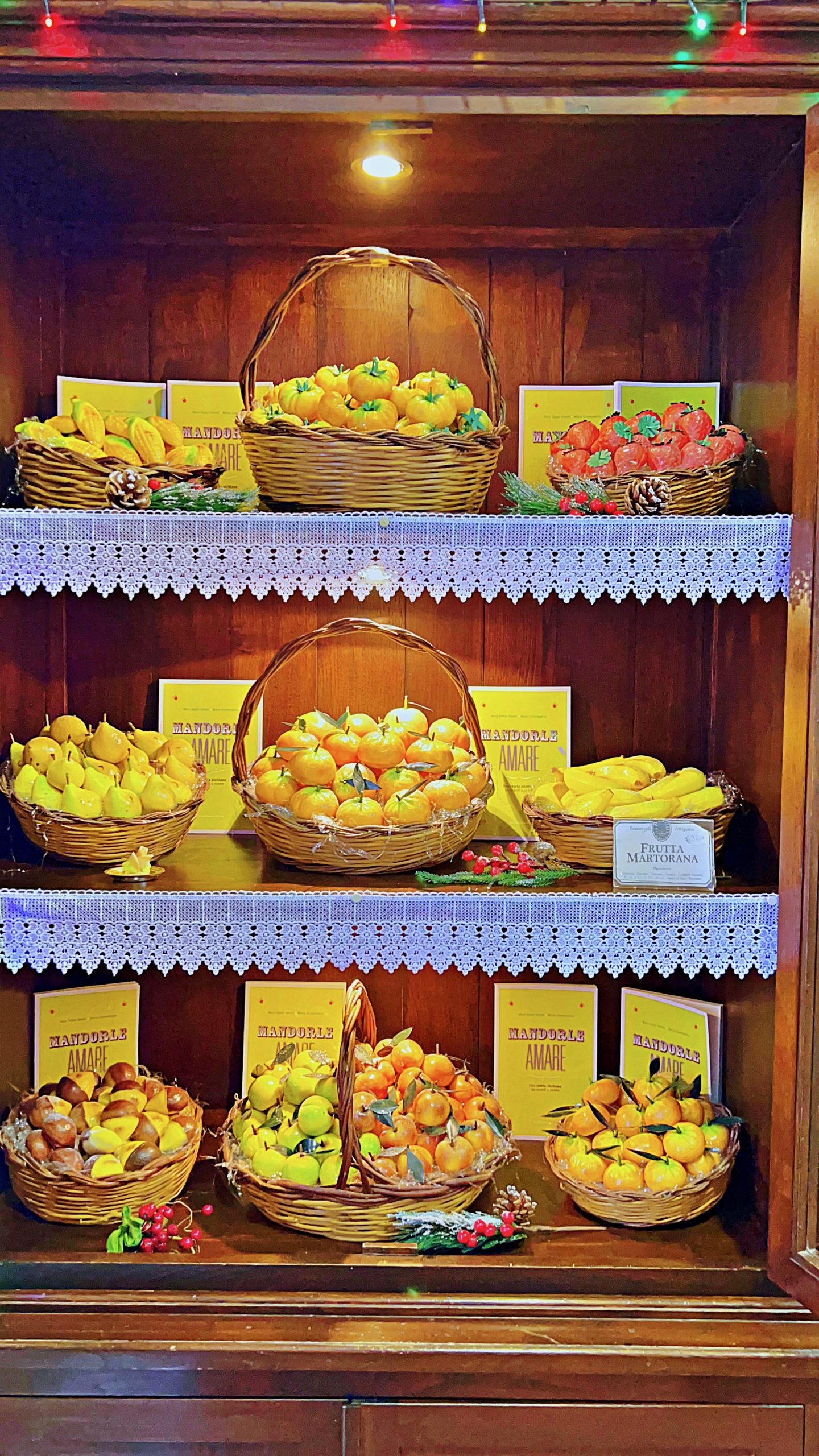 Every corner had a view of the sea, or a snow peaked mountain, a palm tree or a church or, it being near Christmas, a presepe nativity scene, secreted in a chapel or a niche in a wall. There are gift shops selling paintings, ceramic decorations, gorgeous rag and raffia rugs and grocery shops with beautifully packaged food and drinks such as tinned swordfish, capers from Pantelleria, jars of almond pesto.
