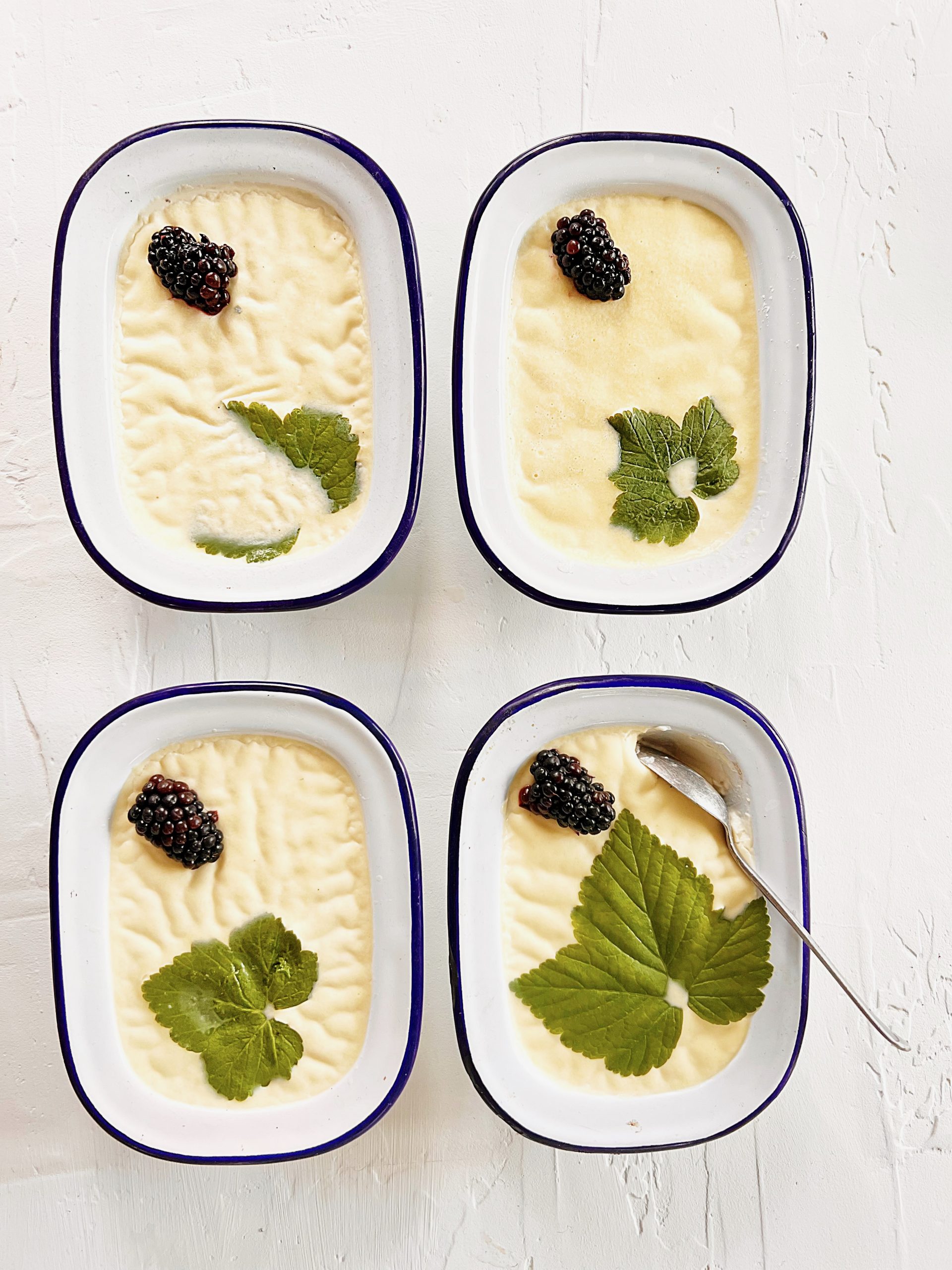 - Put into ramekins or small containers and leave until cool. I decorated the top with a small blackcurrant leaf. Then transfer to the fridge.