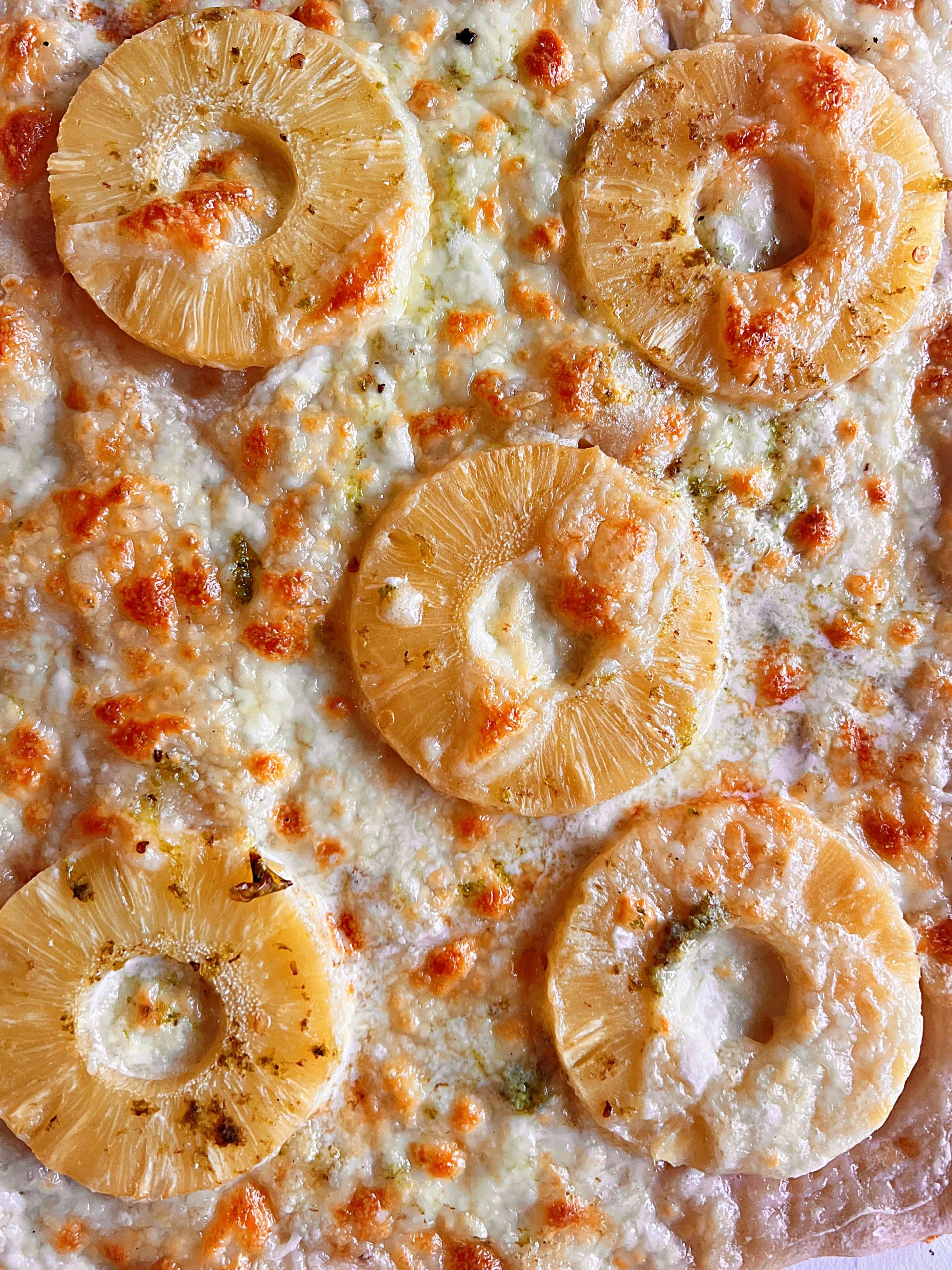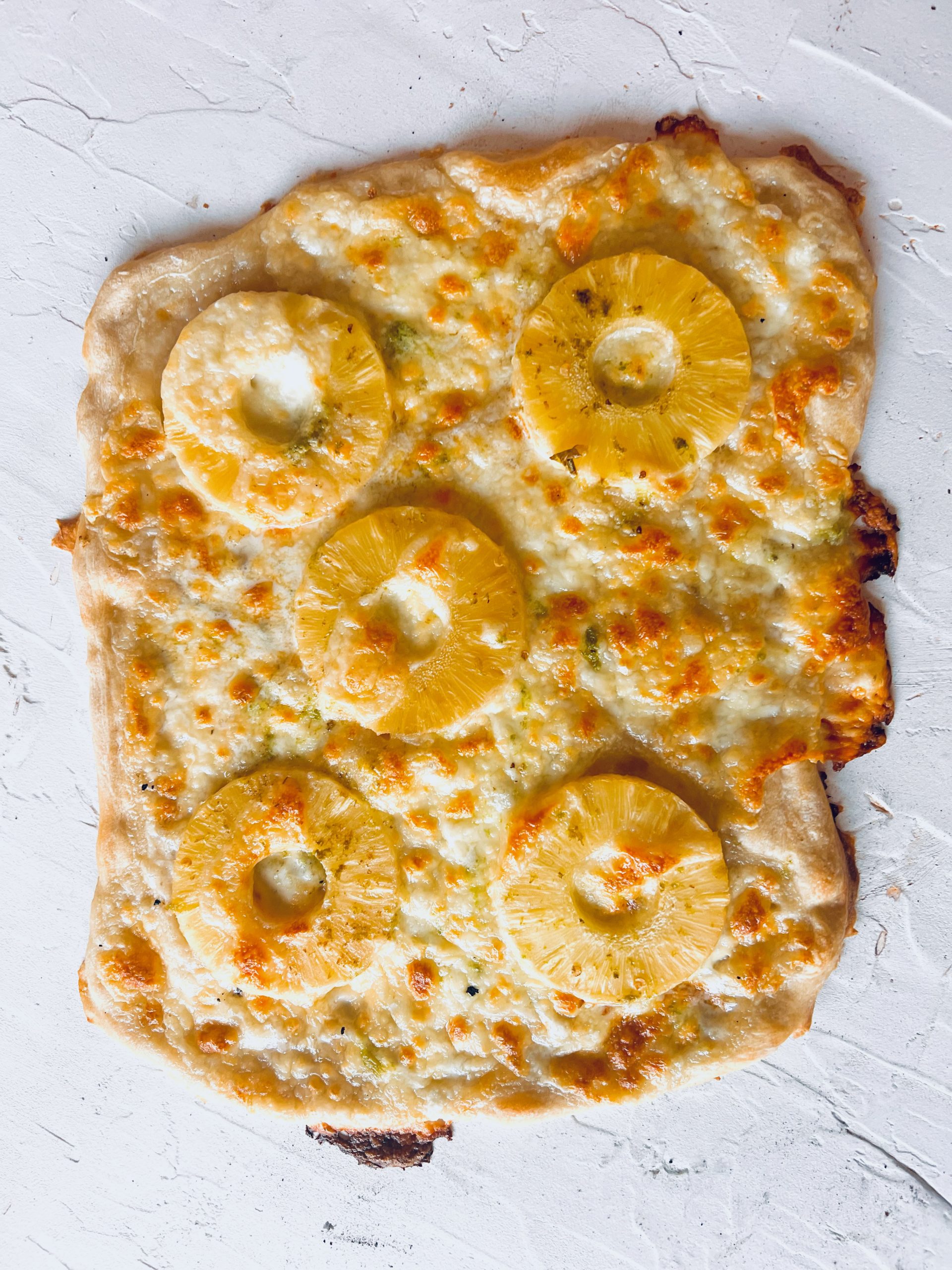 Yes I realise pineapple on pizza is regarded as heresy in pizza circles. But hear me out – this is good. The pineapple, being sweet and tangy, replaces the tomatoes. Also I’ve heard that an important pizza chef in Naples, Gino Sorbillo, is now making Hawaiian pizza.