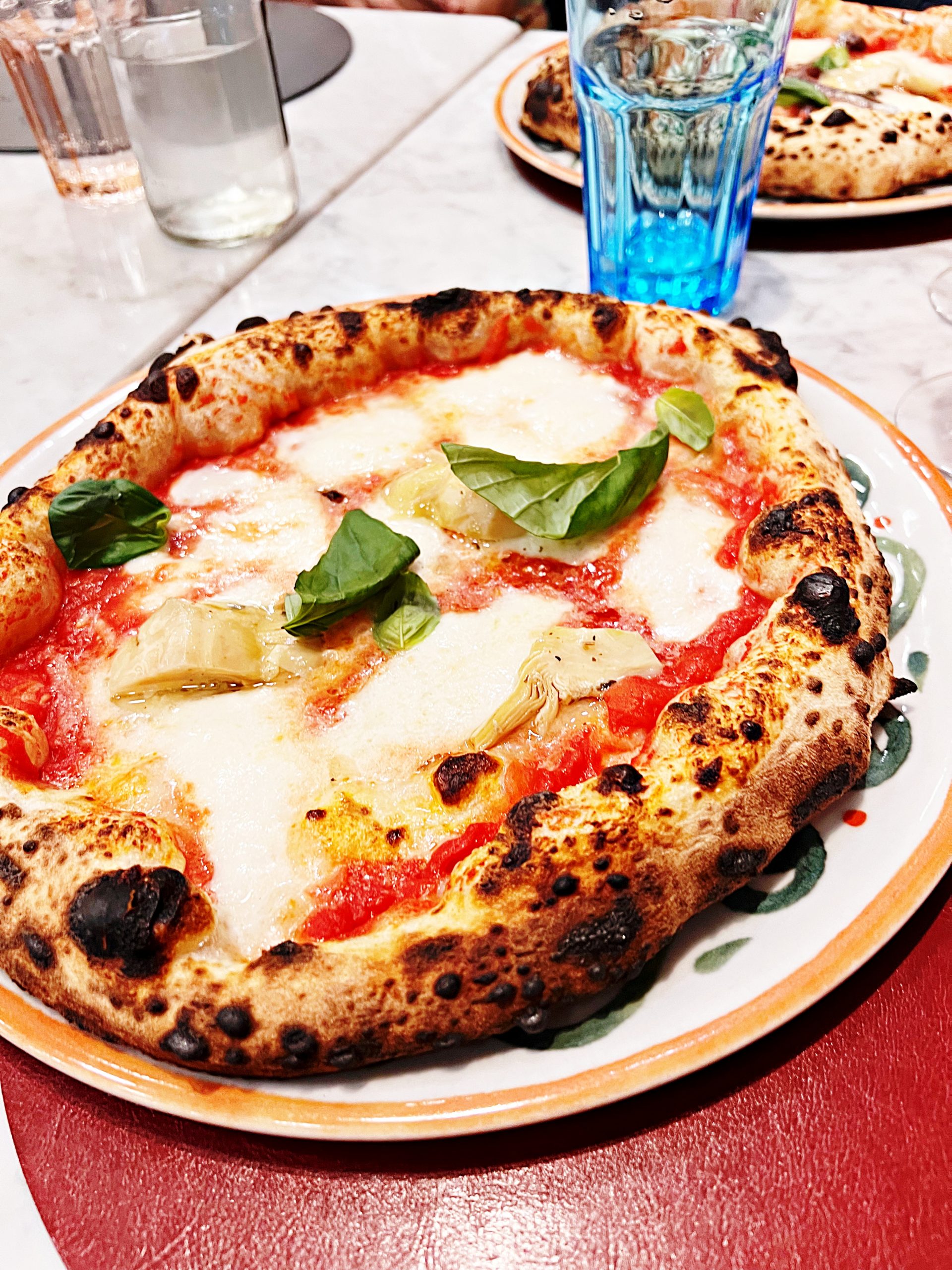 He makes me a pizza, patting and shoving a disk of dough, smeared with tomato sauce and scattered with buffalo mozzarella, into the domed red mosaic pizza oven. A minute later the peel is removed, revealing a puffy, charred, smoking pizza.