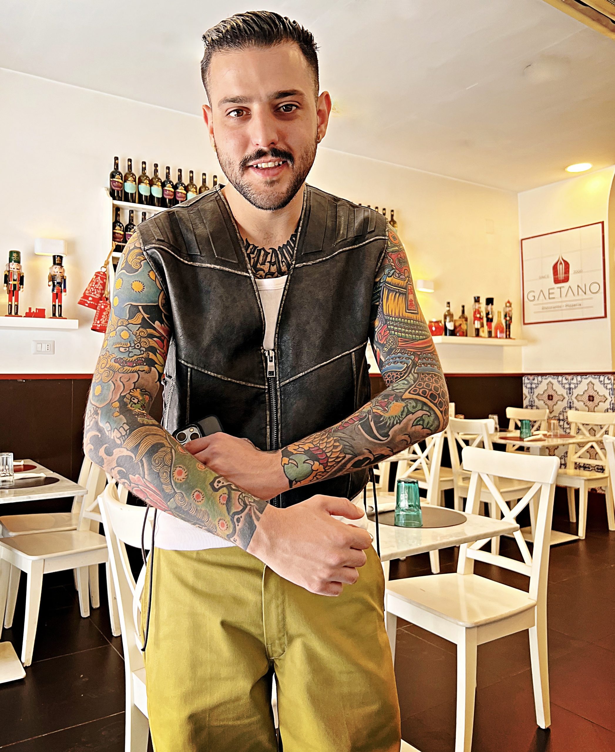 One evening, I sit with Gaetano on the little table he has next to the oven. He’s married with a four year old son and covered in Japanese tattoos, an ongoing project. ‘I have full sleeves and all my back, but my legs are empty’ he lamented.