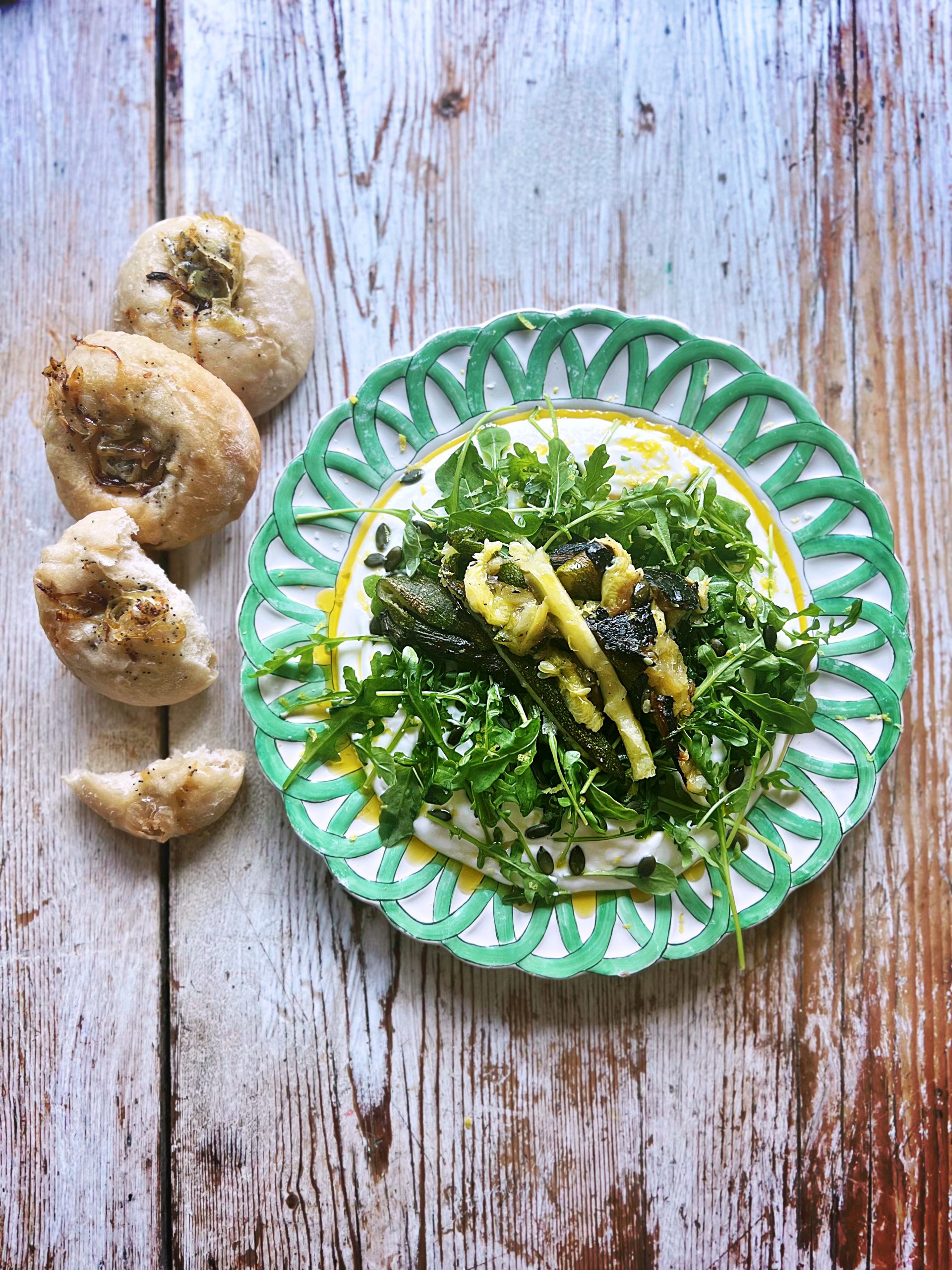 - Ladle the feta mixture onto a plate, then add the rocket, then the courgettes. Sprinkle with pumpkin seeds, more olive oil, more lemon if needed, and sea salt. Eat with warm crusty bread.
