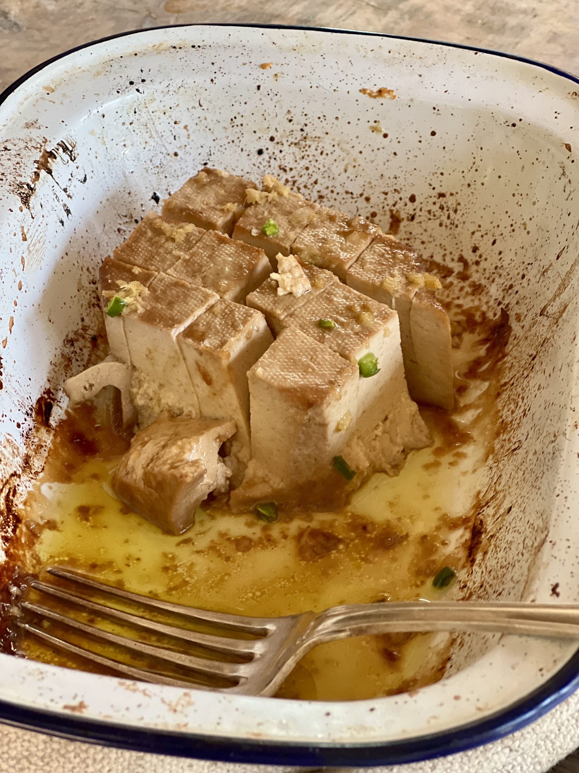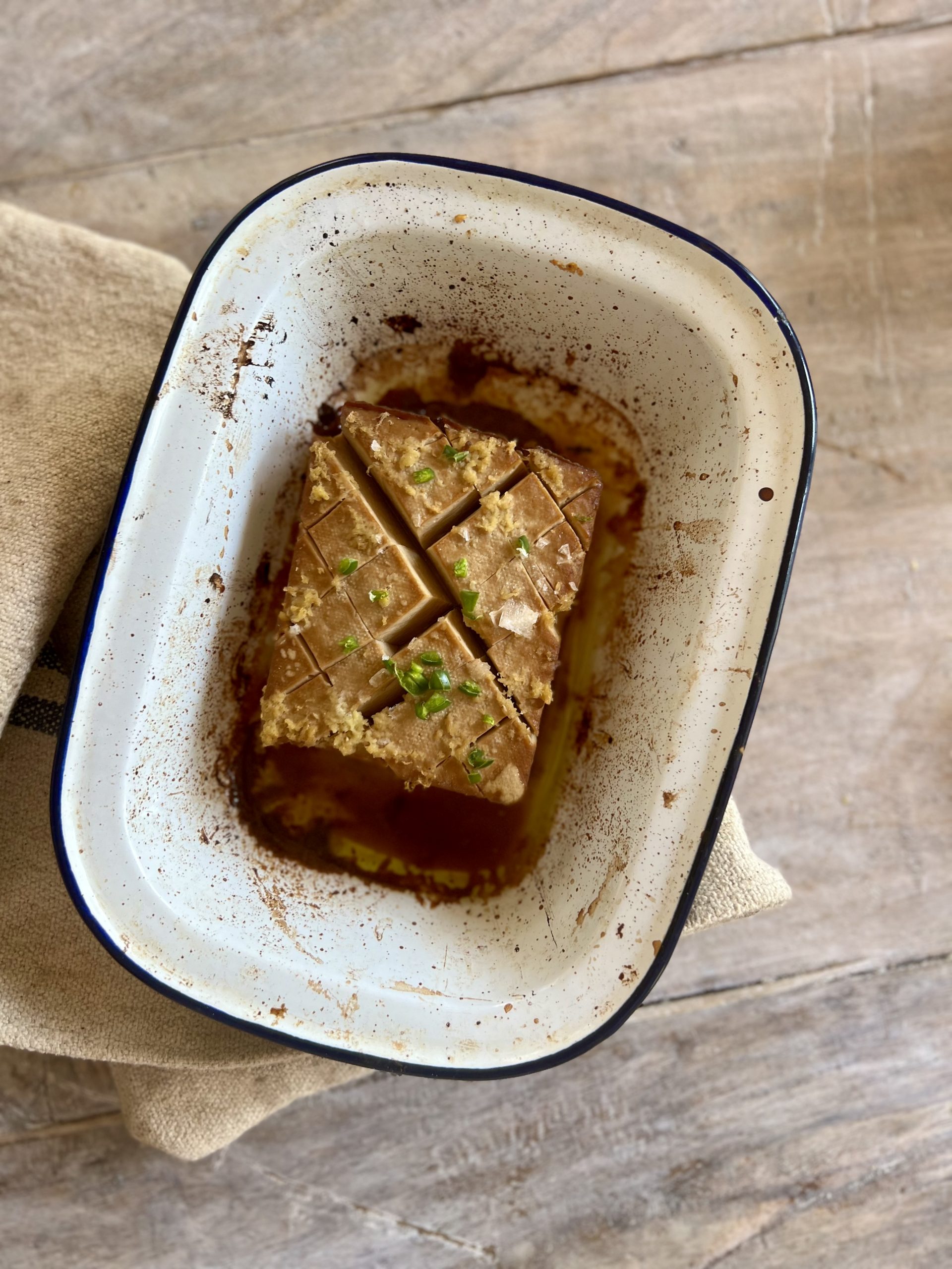 - Score the tofu diagonally on the top so the marinating liquid can penetrate
